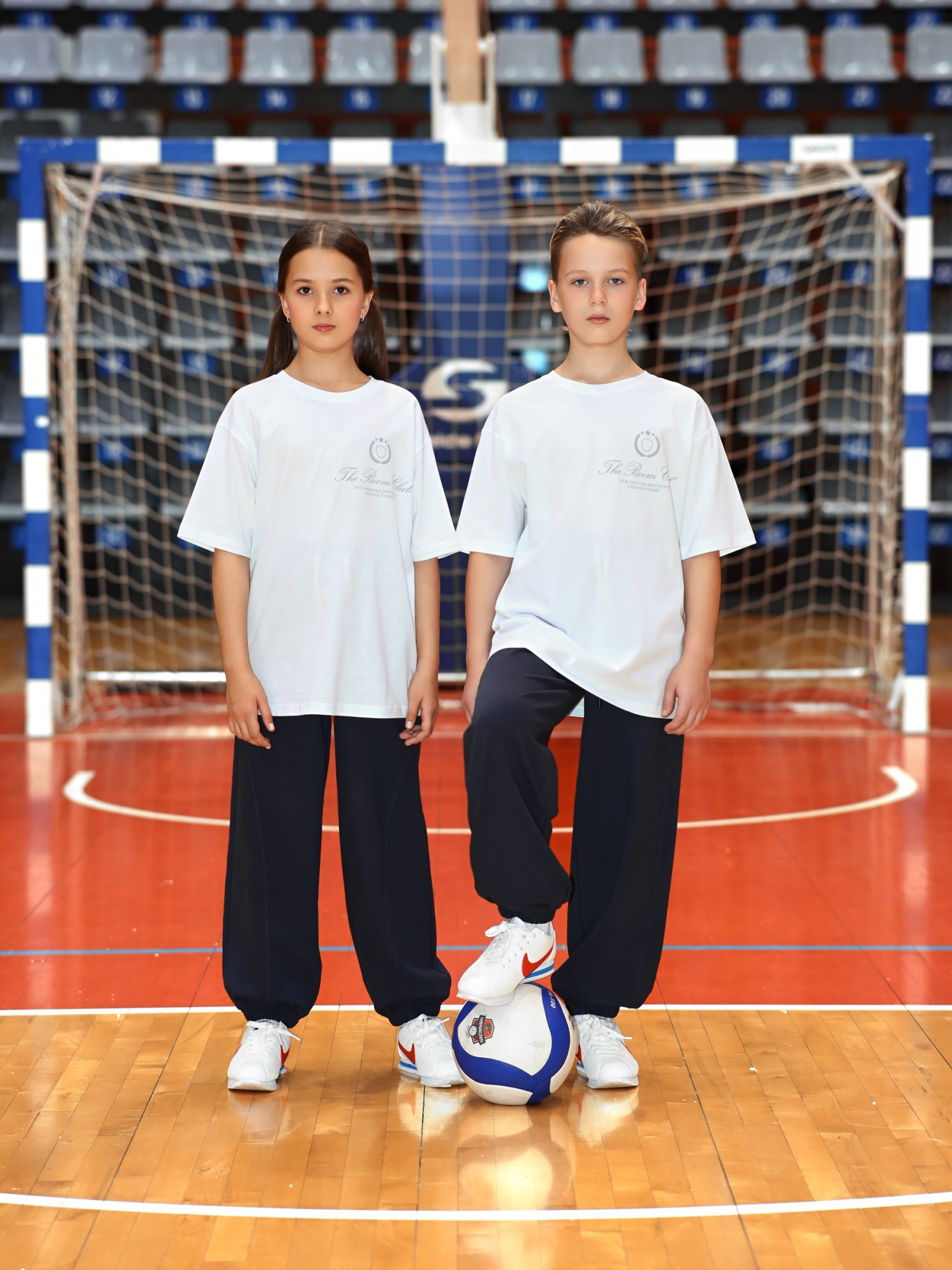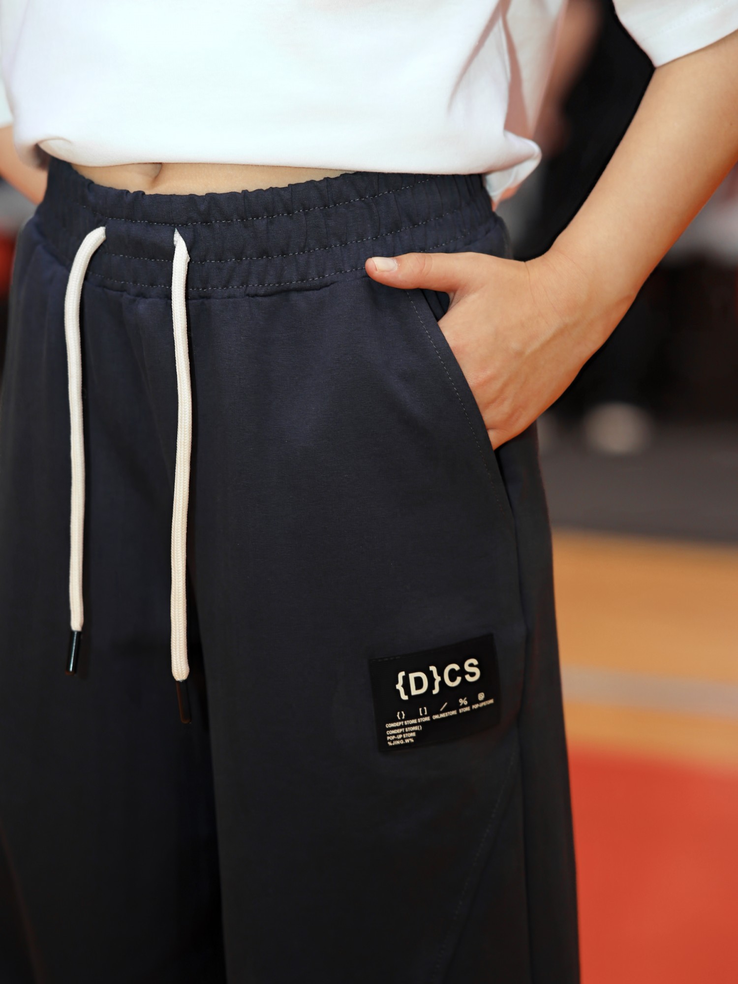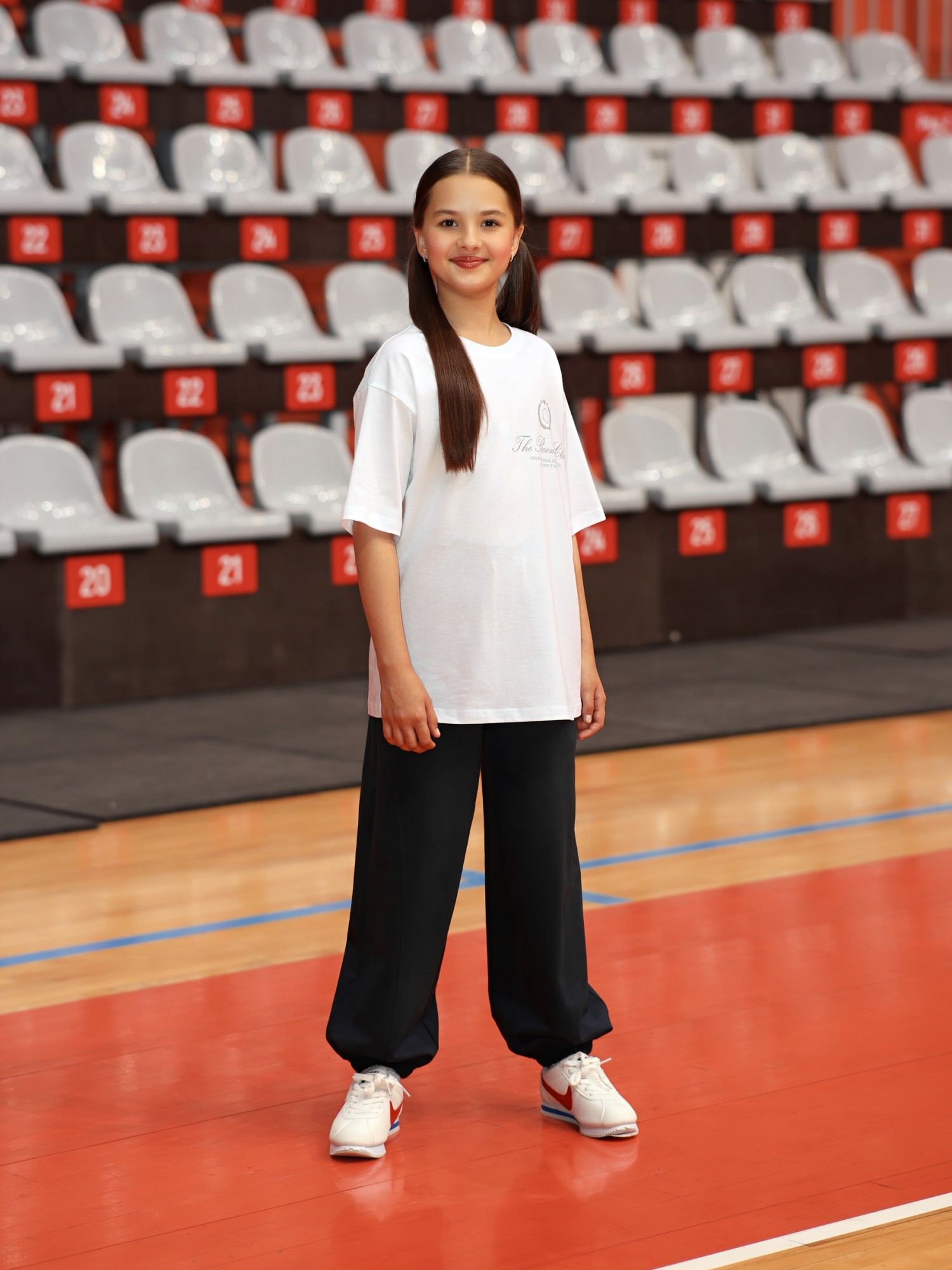 Брюки для девочки из трикотажного полотна "футер-двухнитка", на притачном поясе с эластичной тесьмой внутри, с карманами в боковых швах и отделочными деталями фигурной формы на передних половинах. Нижние срезы брюк обработаны с эластичной тесьмой. По швам притачивания отделочных деталей, декоративных вставок и карманам настрочены отделочные строчки. На правой передней половине брюк ниже уровня колена настрочен декоративный элемент прямоугольной формы. Через две обметанные в центре пояса петли продет шнурок, позволяющий регулировать степень прилегания изделия по талии.