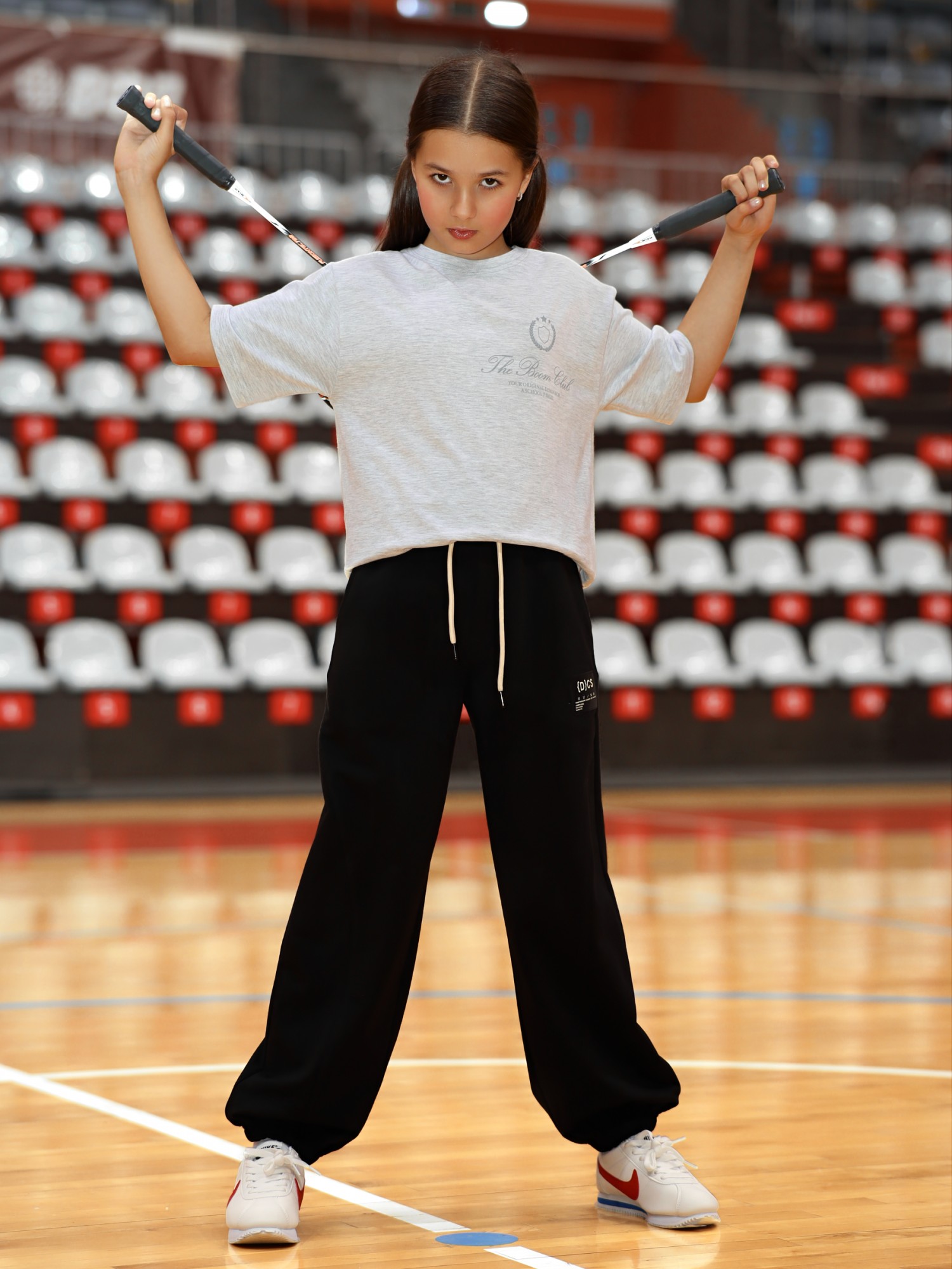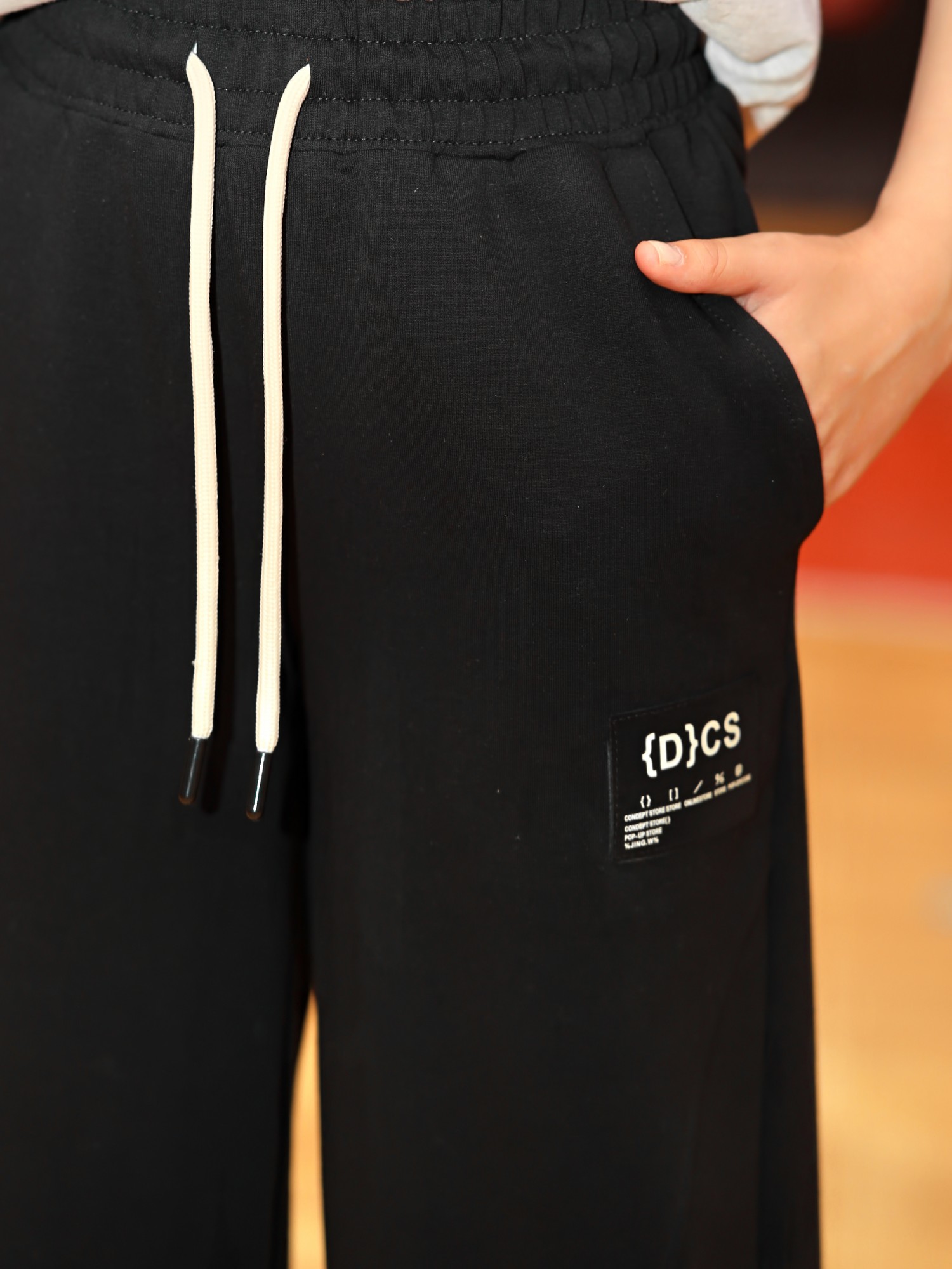 Брюки для девочки из трикотажного полотна "футер-двухнитка", на притачном поясе с эластичной тесьмой внутри, с карманами в боковых швах и отделочными деталями фигурной формы на передних половинах. Нижние срезы брюк обработаны с эластичной тесьмой. По швам притачивания отделочных деталей, декоративных вставок и карманам настрочены отделочные строчки. На правой передней половине брюк ниже уровня колена настрочен декоративный элемент прямоугольной формы. Через две обметанные в центре пояса петли продет шнурок, позволяющий регулировать степень прилегания изделия по талии.