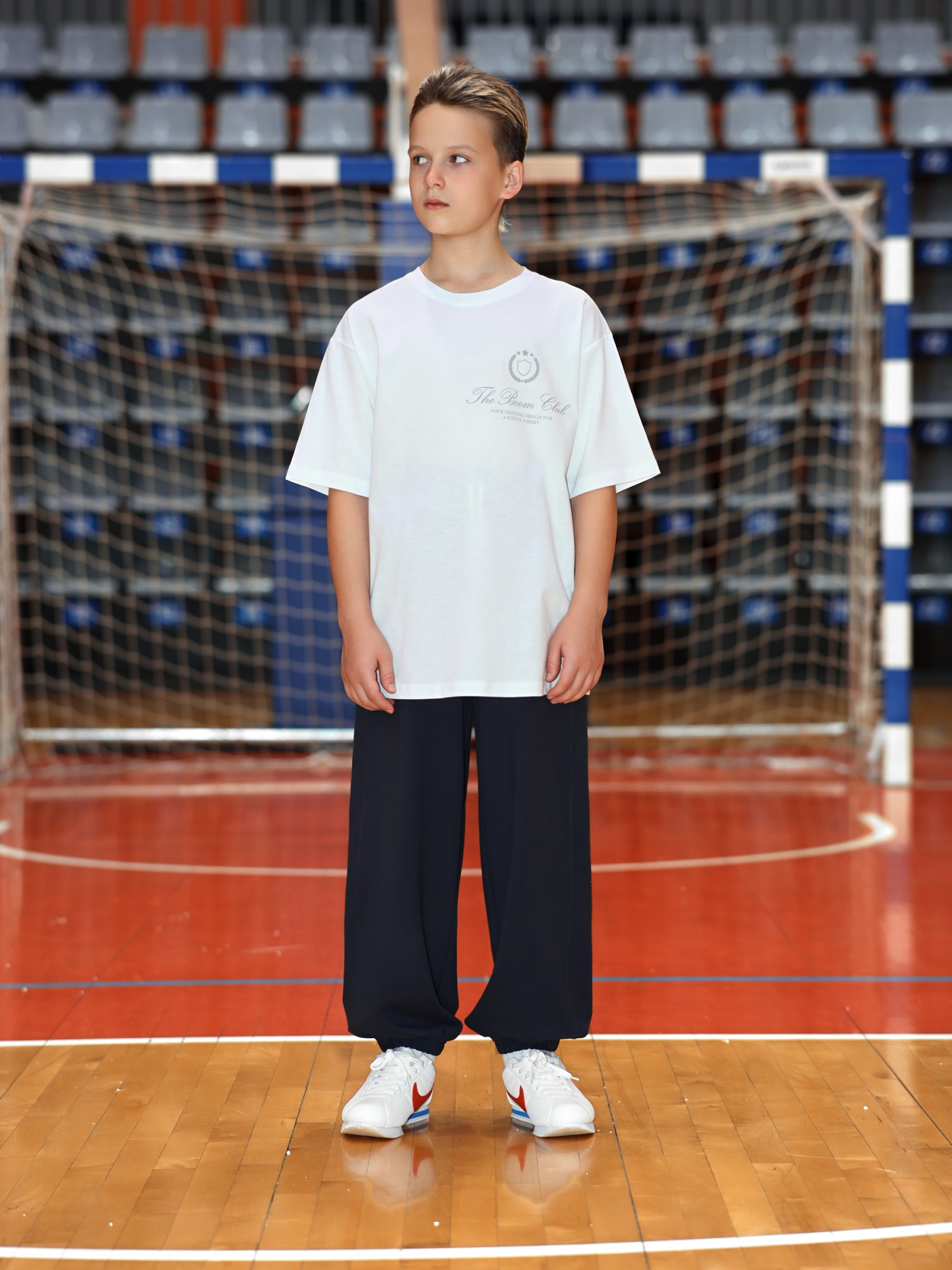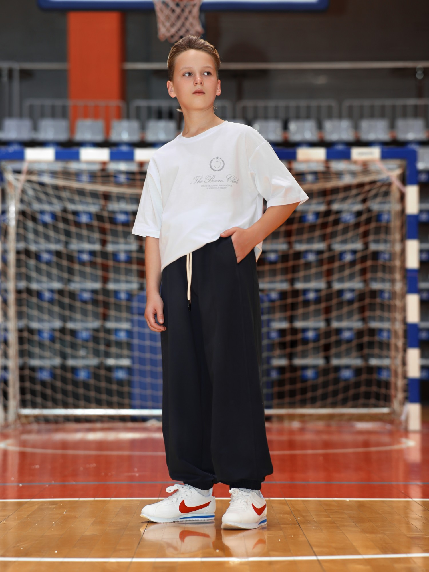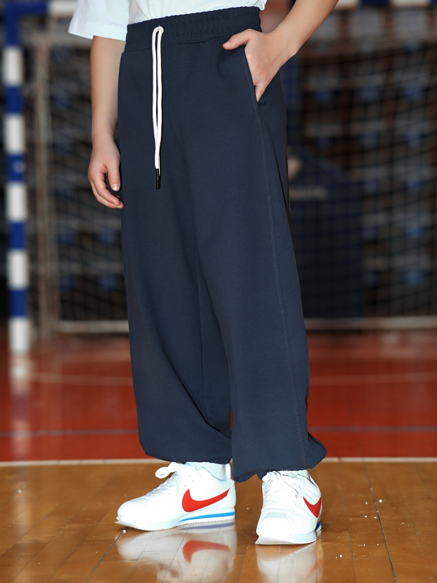 Брюки для мальчика из трикотажного полотна "футер-двухнитка" на притачном поясе с эластичной тесьмой внутри, декоративными вставками в боковых швах и карманами, обработанными в соединительных швах передних половин с декоративными вставками. Нижние срезы брюк обработаны с эластичной тесьмой. По швам втачивания вставок и входам в карманы настрочены отделочные строчки. Через две обметанные петли пояса продет шнрок, позволяющий регулировать степень прилегания изделия по талии.