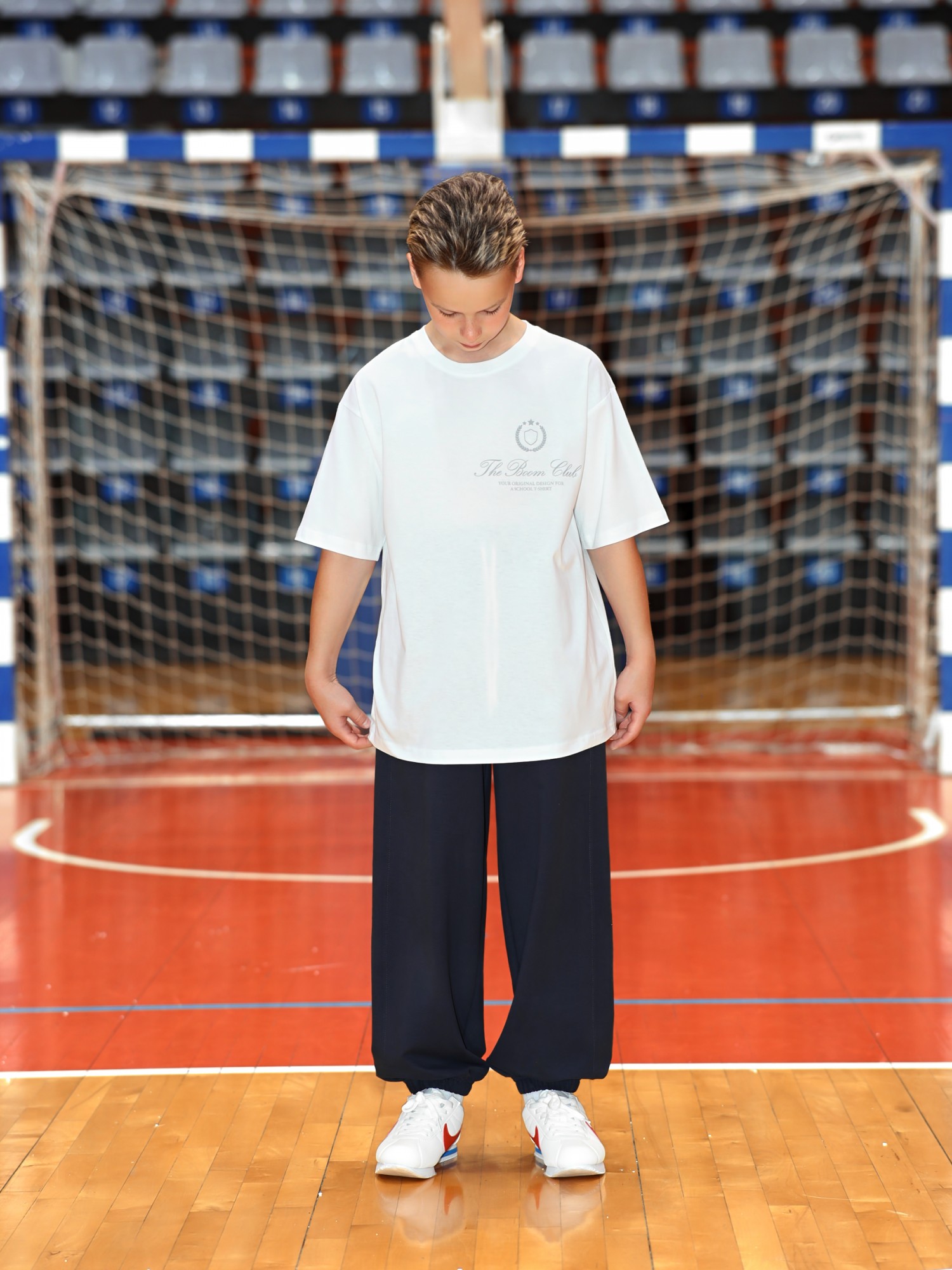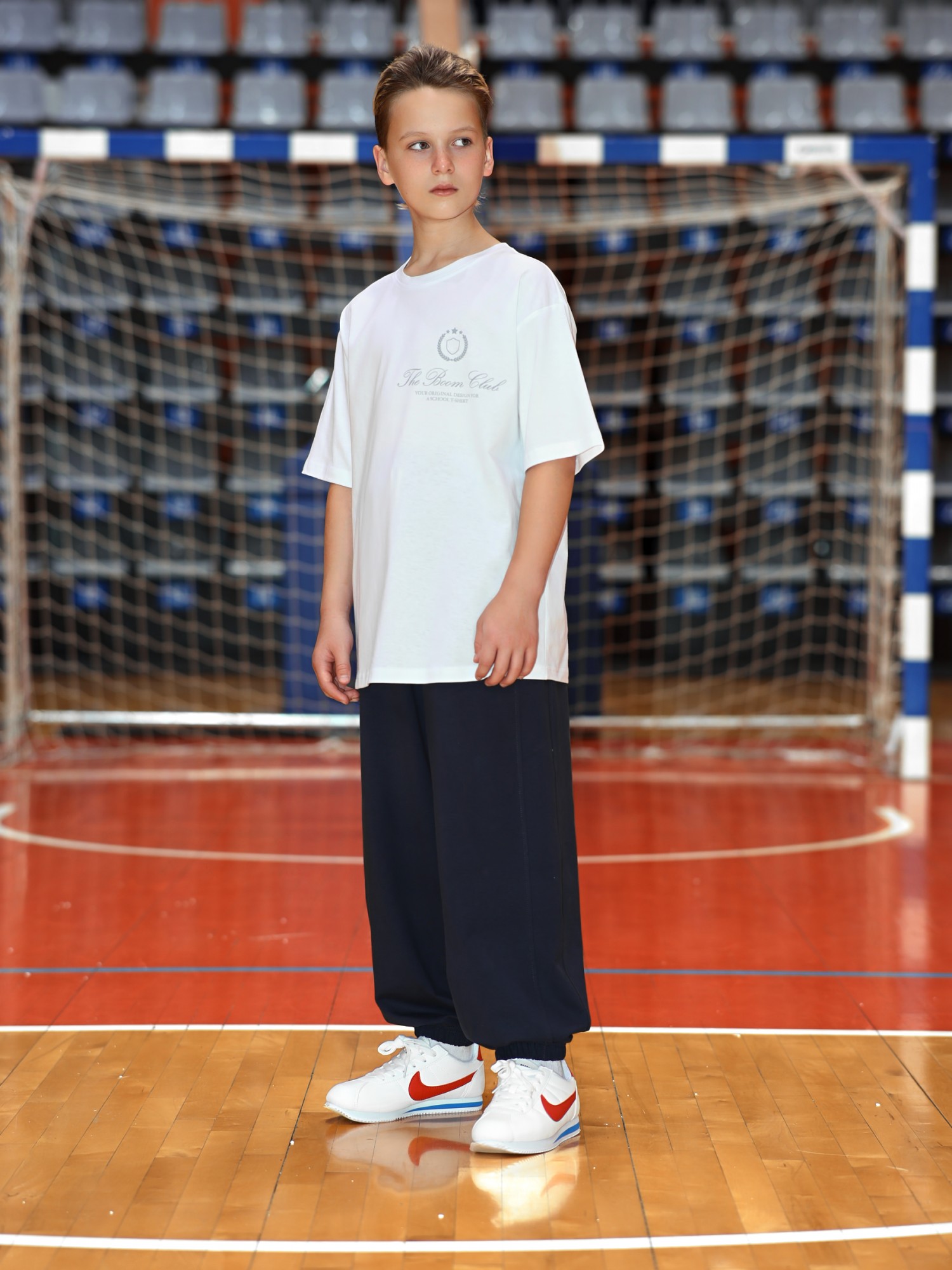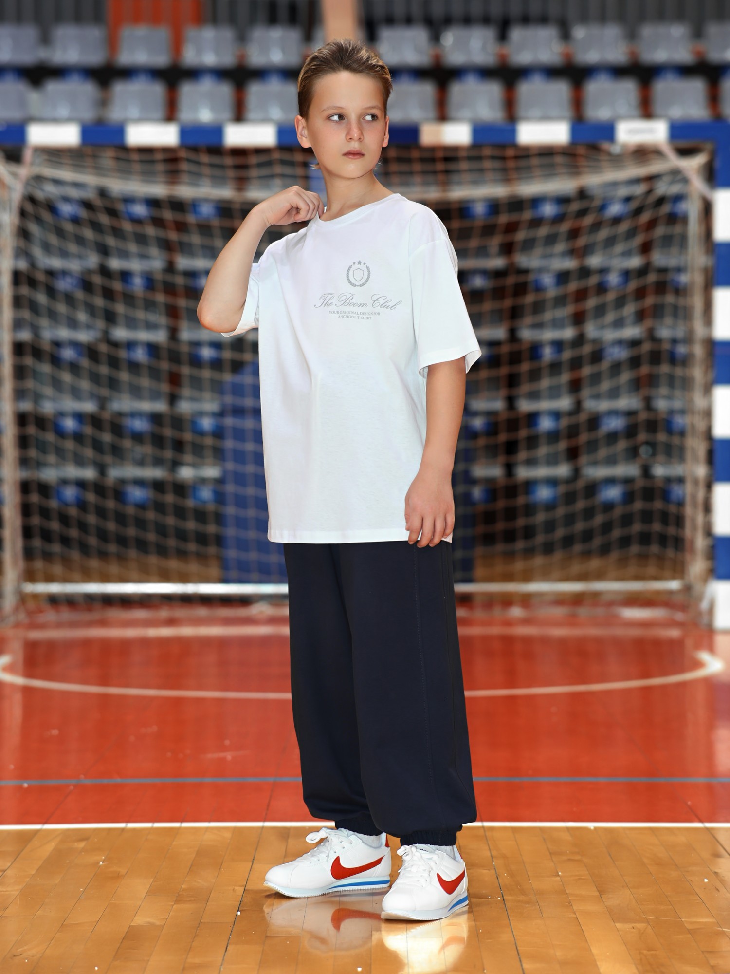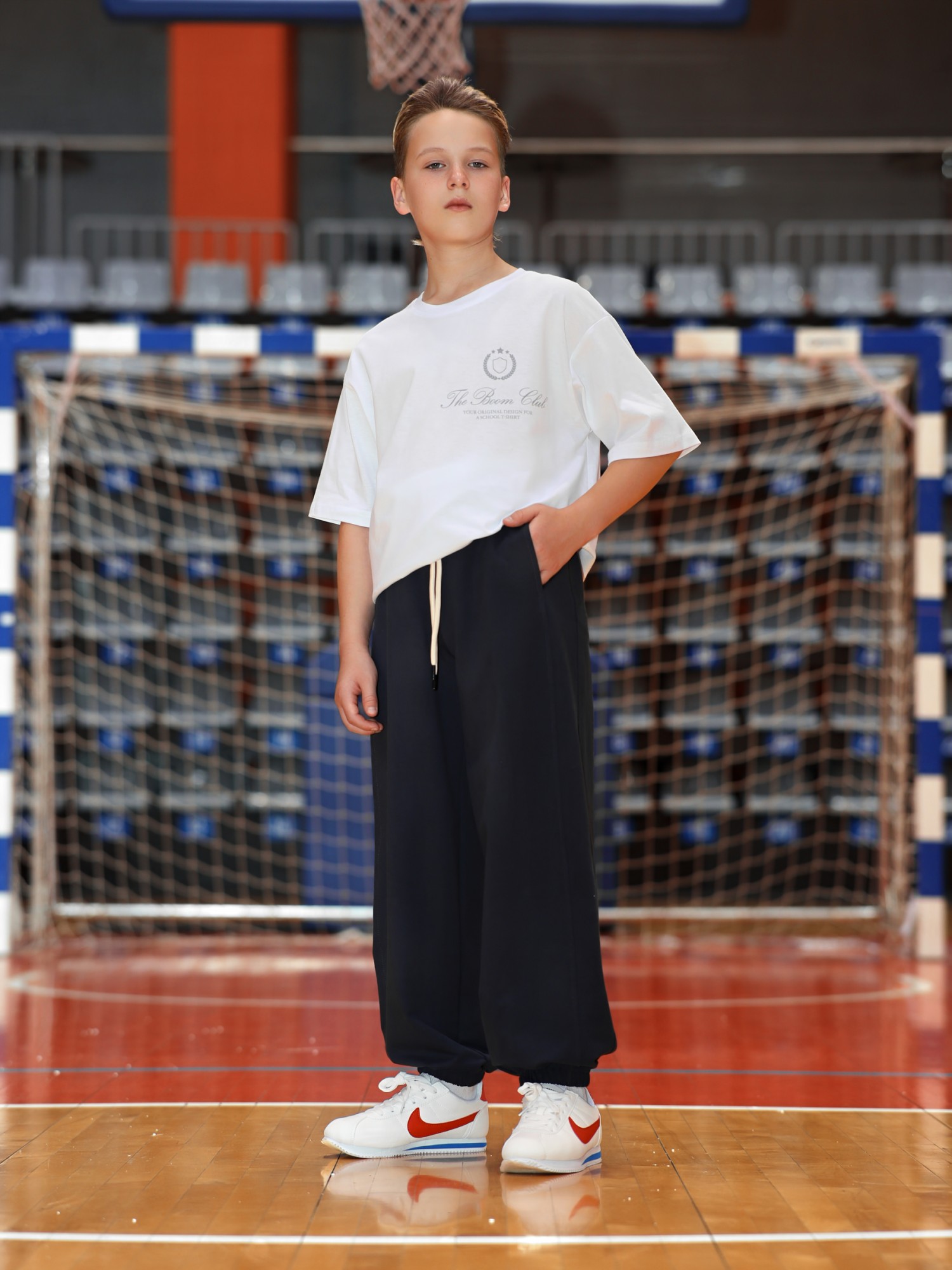 Брюки для мальчика из трикотажного полотна "футер-двухнитка" на притачном поясе с эластичной тесьмой внутри, декоративными вставками в боковых швах и карманами, обработанными в соединительных швах передних половин с декоративными вставками. Нижние срезы брюк обработаны с эластичной тесьмой. По швам втачивания вставок и входам в карманы настрочены отделочные строчки. Через две обметанные петли пояса продет шнрок, позволяющий регулировать степень прилегания изделия по талии.