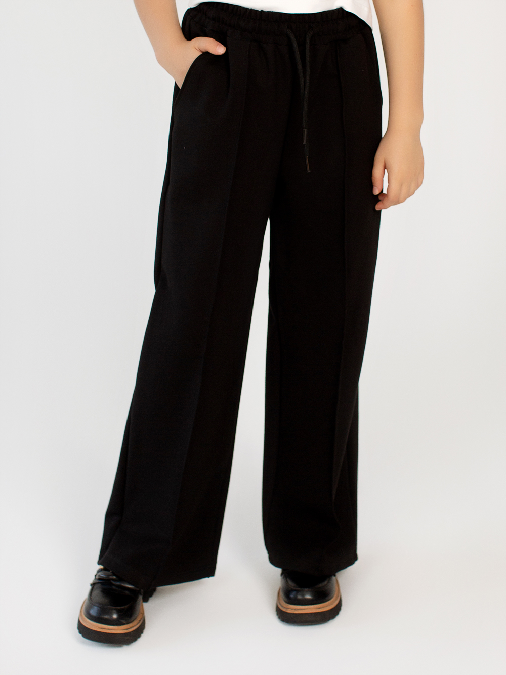Модель имеет широкий силуэт палаццо, что делает её актуальной и удобной. Штанины свободно ложатся по ноге, не стесняют движений и визуально удлиняют силуэт. Это особенно удобно для активных девочек, которым важно не только выглядеть опрятно, но и чувствовать себя комфортно в течение всего дня.