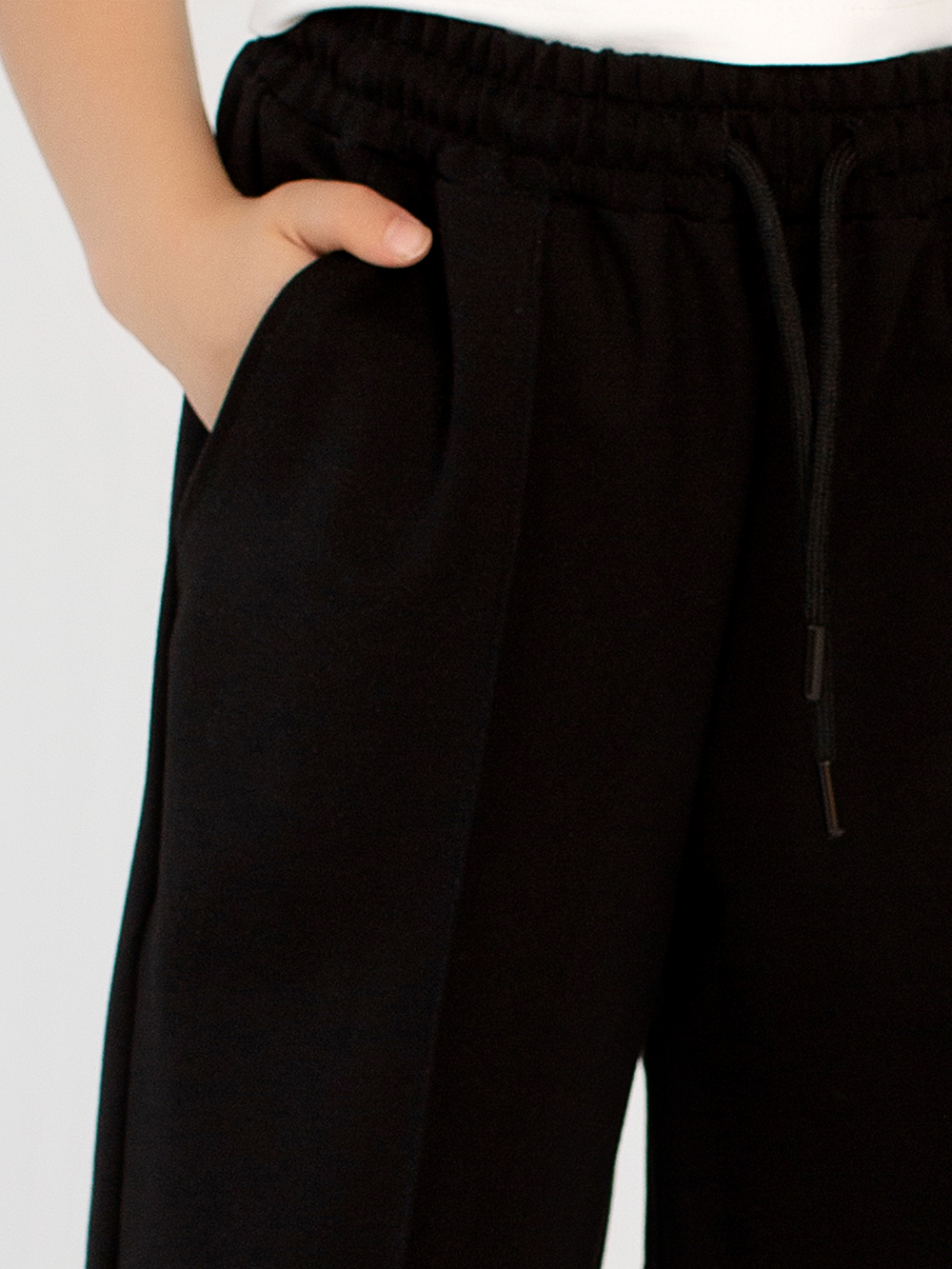 Брюки оснащены удобной резинкой на талии, дополненной функциональным шнуром, который позволяет регулировать посадку и обеспечивает комфортное прилегание без давления. За счёт этого брюки легко подстраиваются под фигуру, не сползают и не сковывают движений.