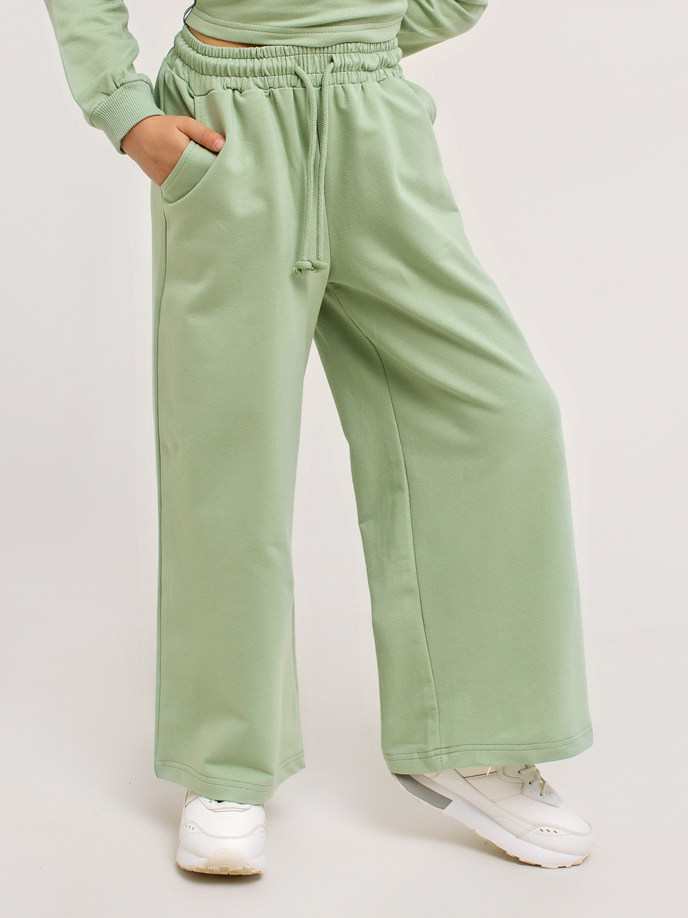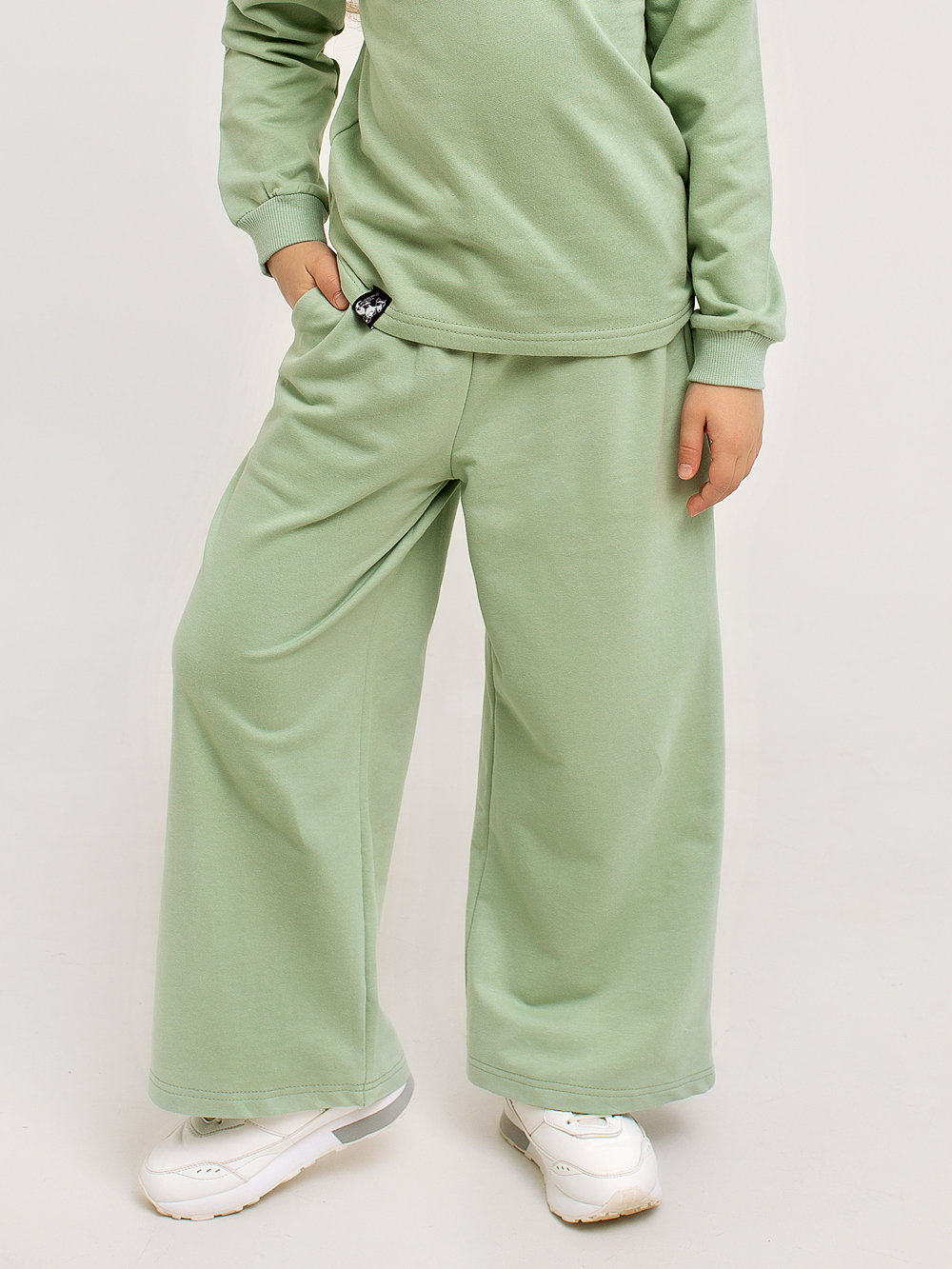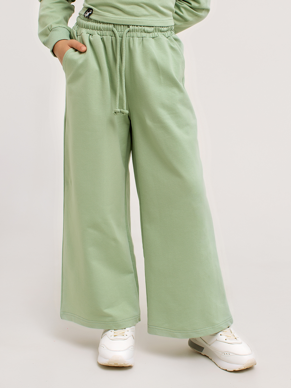 Стильные и удобные широкие брюки палаццо для девочки с высокой посадкой на резинке из футера — идеальный выбор на весну и осень. Мягкая ткань с составом 95% хлопок, 5% эластан приятна к телу, хорошо тянется и не сковывает движений. Модель на резинке со шнуром, что обеспечивает комфортную посадку и регулируется по талии. Широкие штанины и боковые карманы делают эти брюки не только модными, но и практичными. Однотонный цвет легко сочетается с любой одеждой. Отличный вариант для школы, прогулок и активного отдыха.