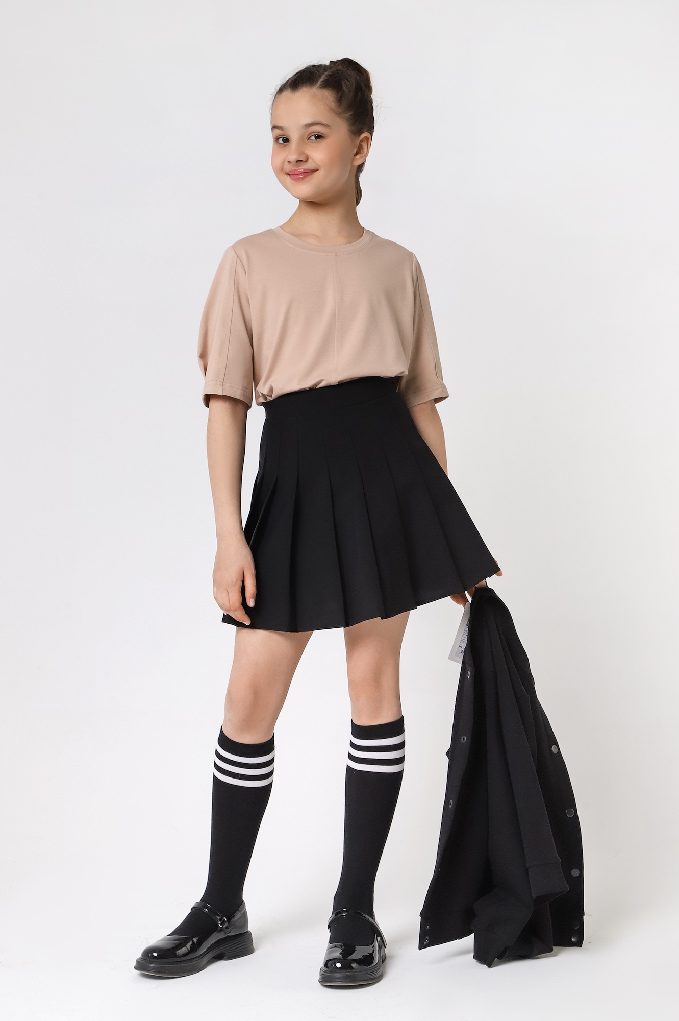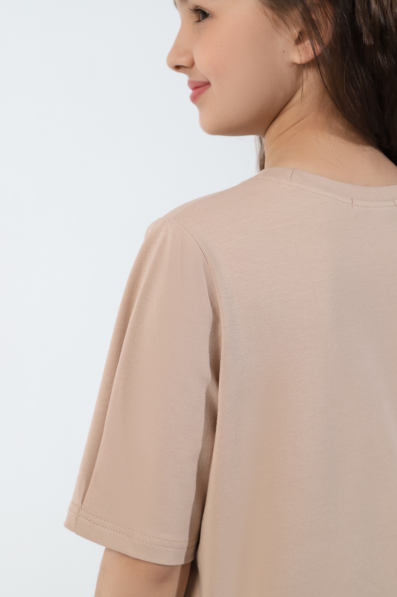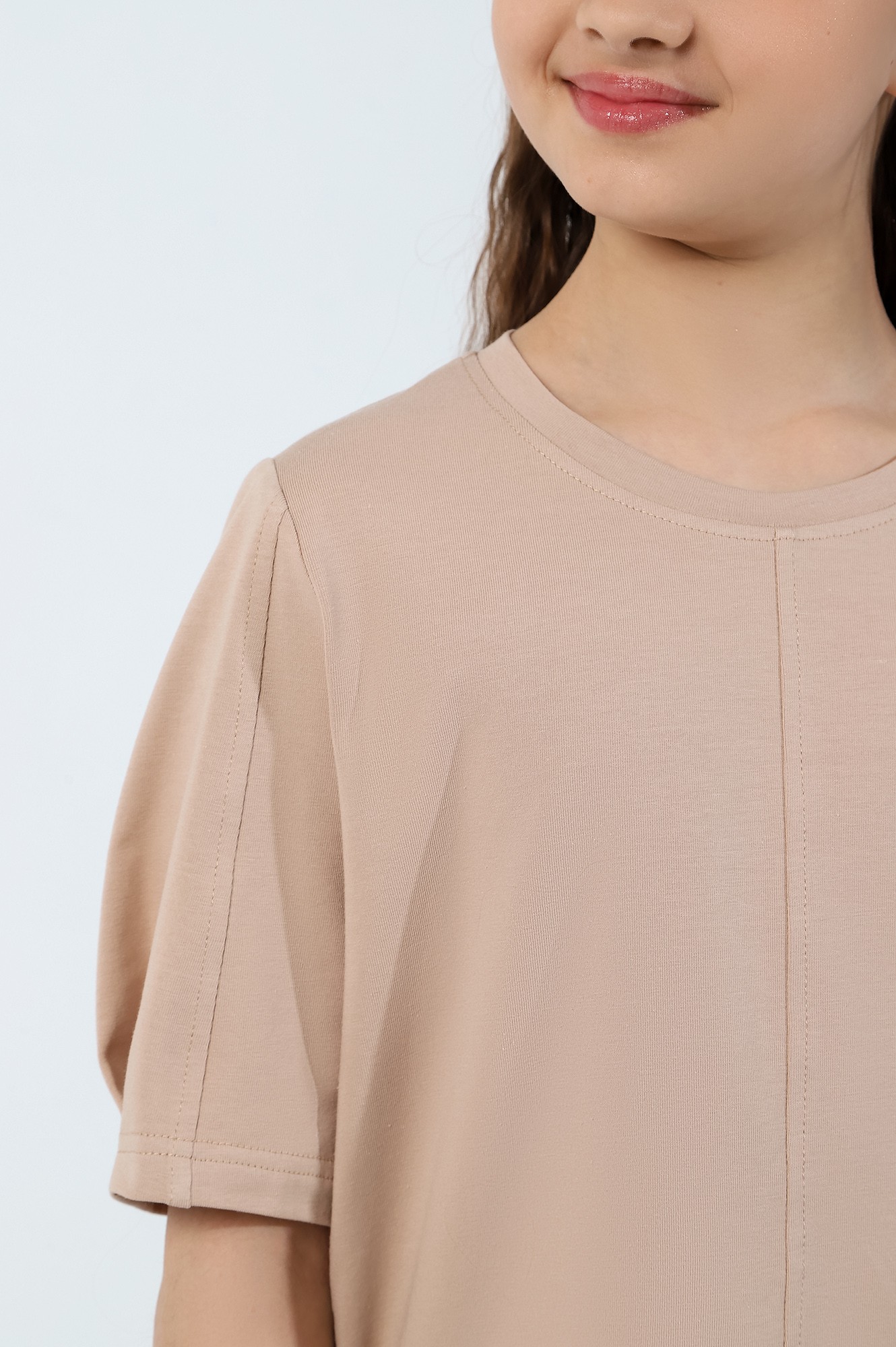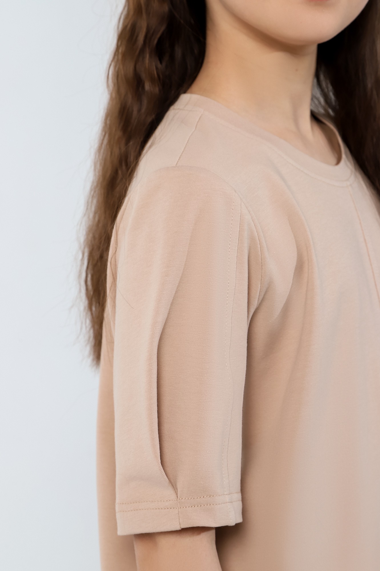 Футболка для девочек модной объемно-силуэтной формы, с вертикальным отстроченным швом по центру переда. На рукавах также выполнены декоративные вертикальные отстроченные швы и глубокие защипы по низу.