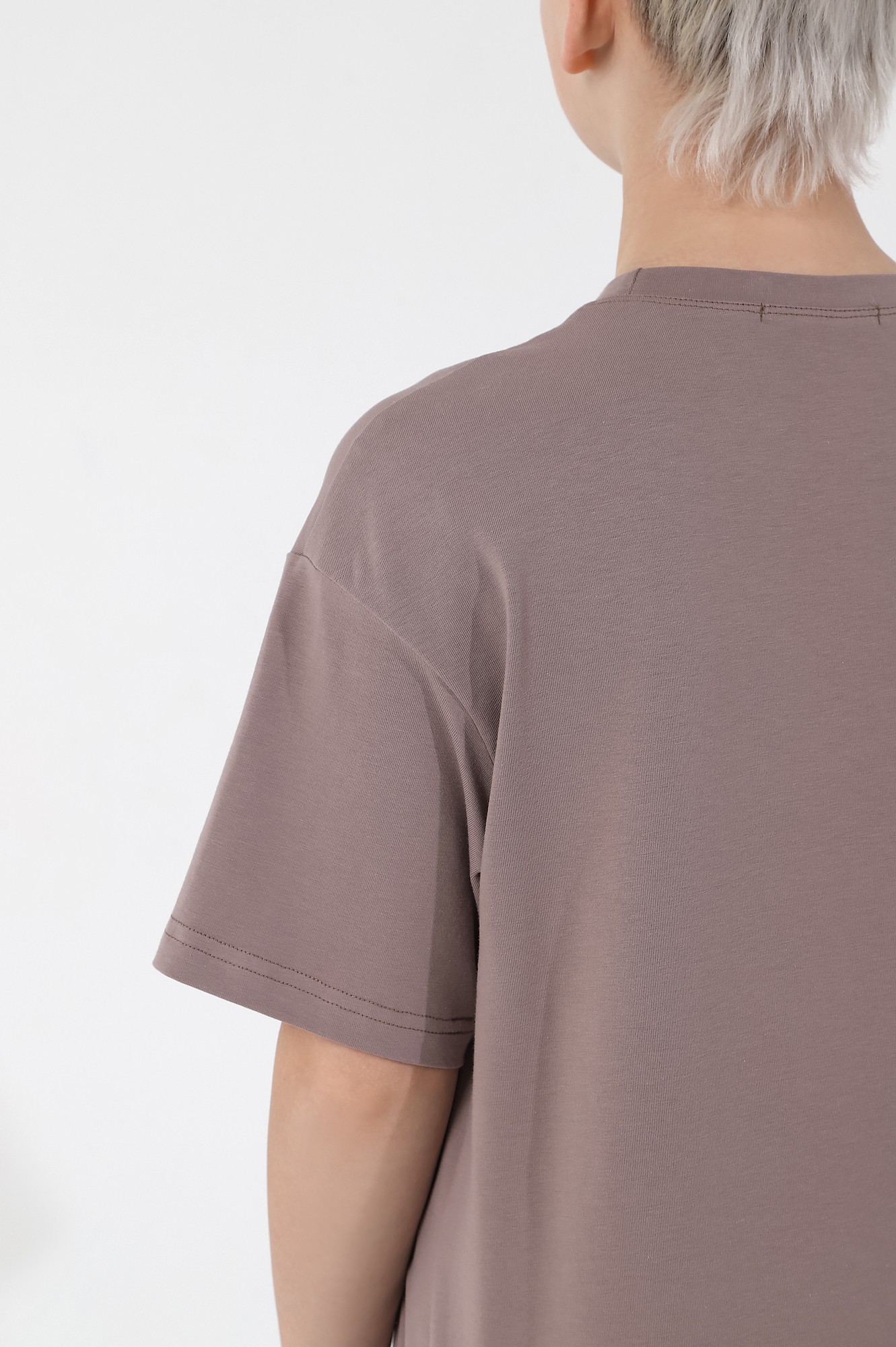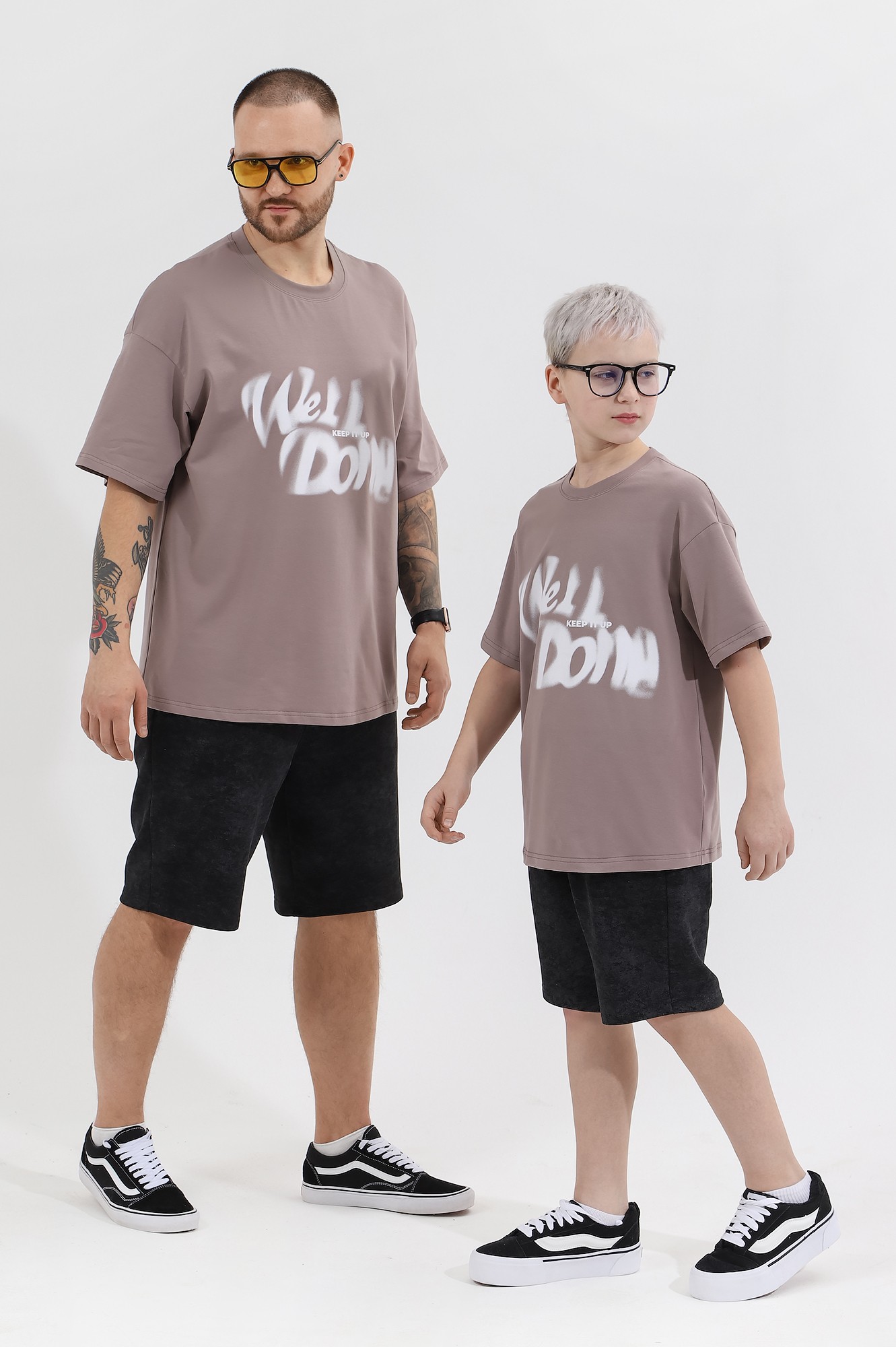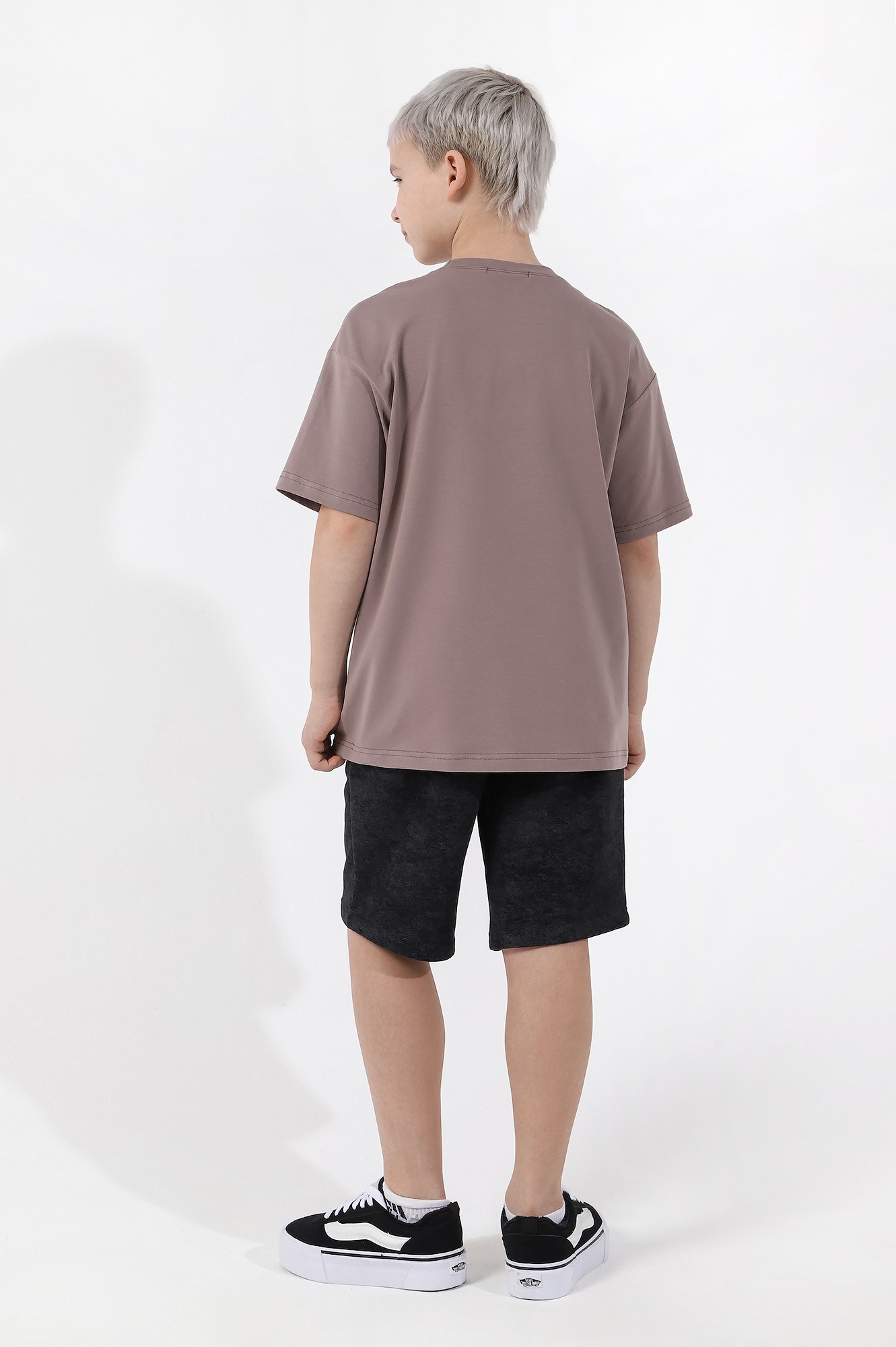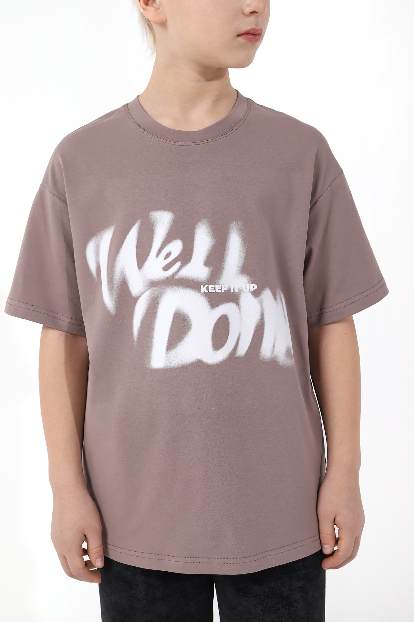 Футболка оверсайз для мальчика из трикотажного полотна: хлопкового с добавлением лайкры. Модель с принтом на переде, спущенной линией плеч, рукавами длиной до локтя.