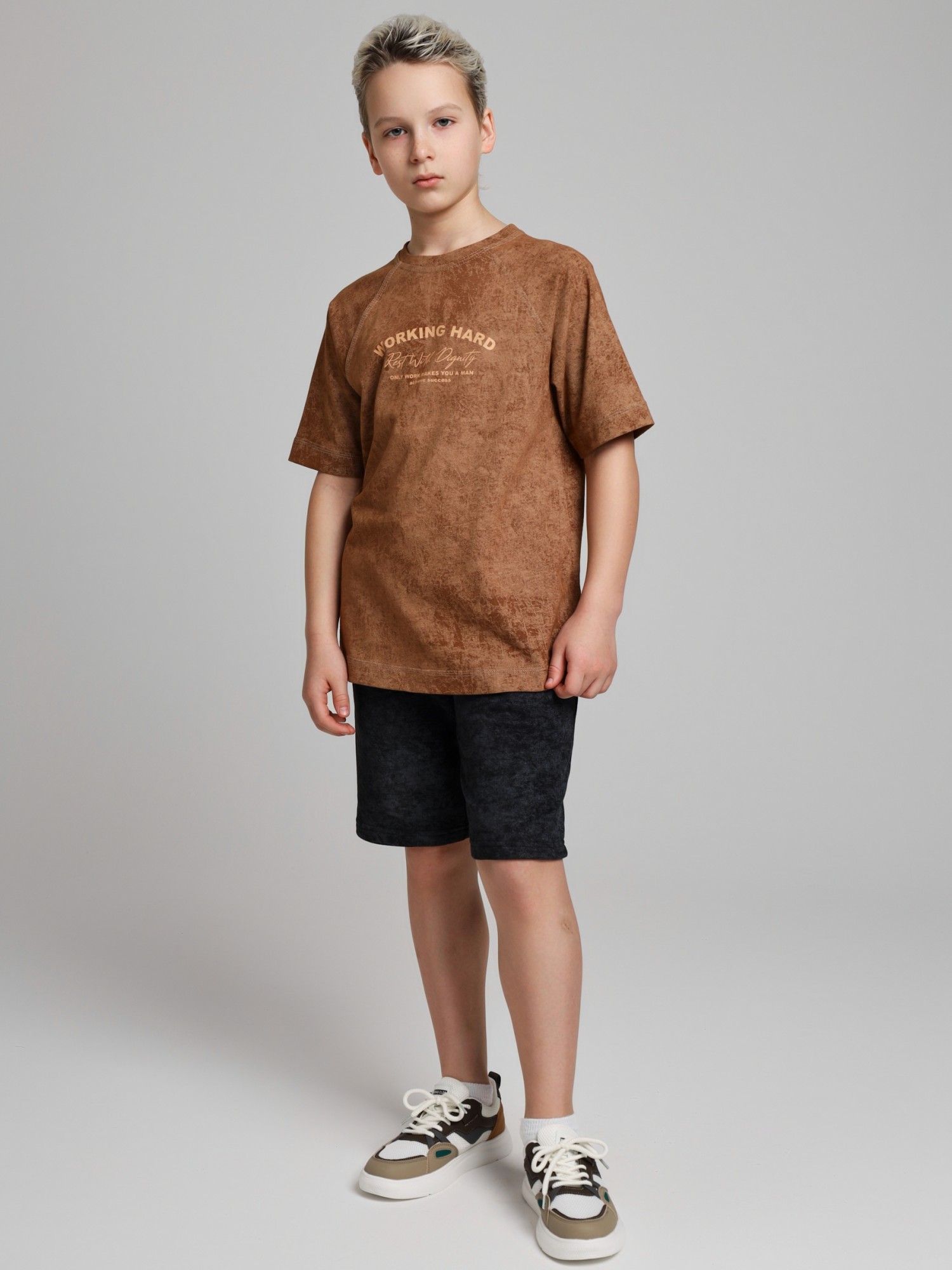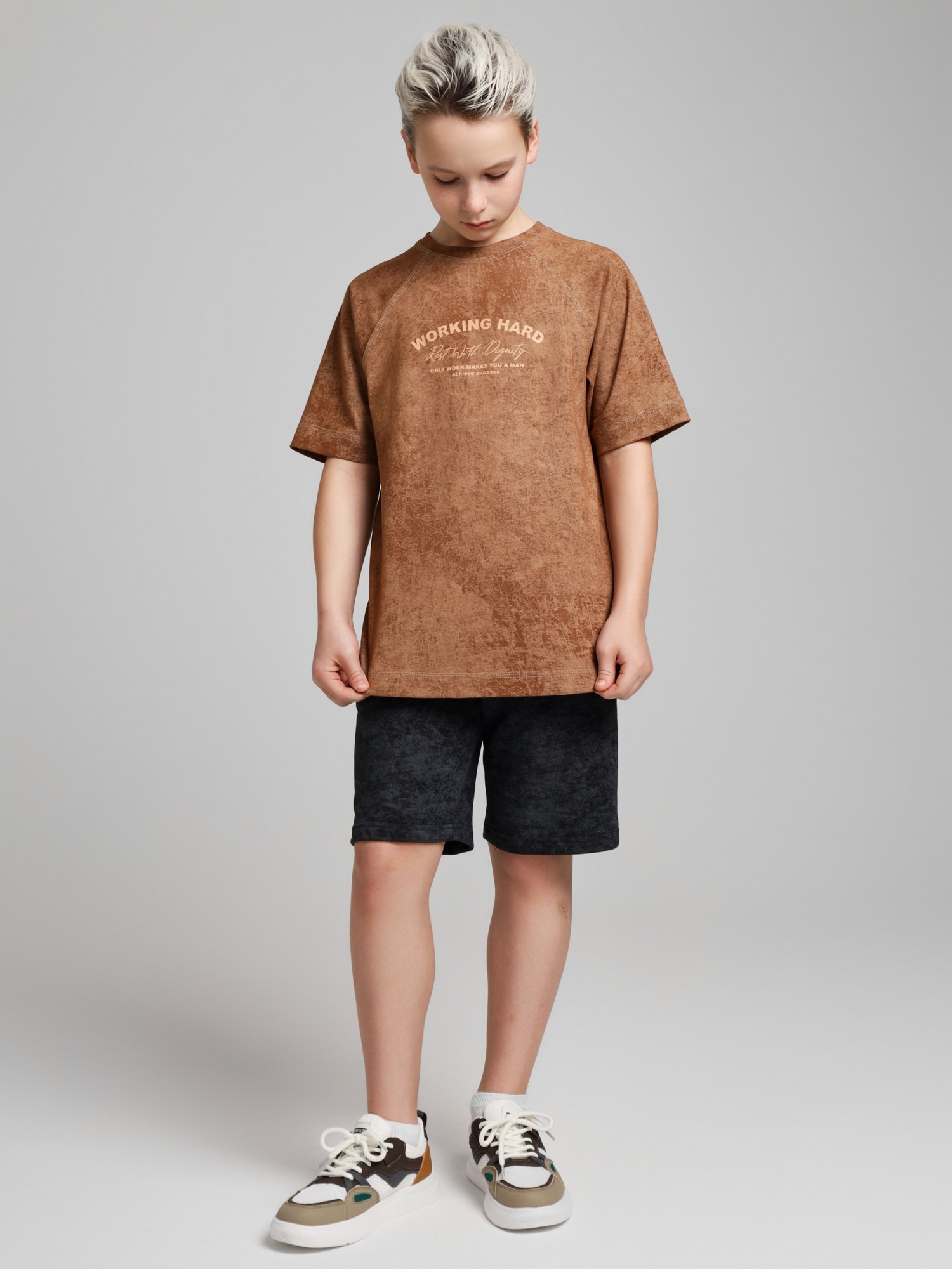 Футболка для мальчика из трикотажного полотна "кулирка-варенка", с короткими рукавами покроя "реглан", горловиной овальной формы, обработанной втачной планкой, и принтом в центре детали переда, выполненным в технике шелкографии. По швам реглана и горловине настрочены отделочные строчки.