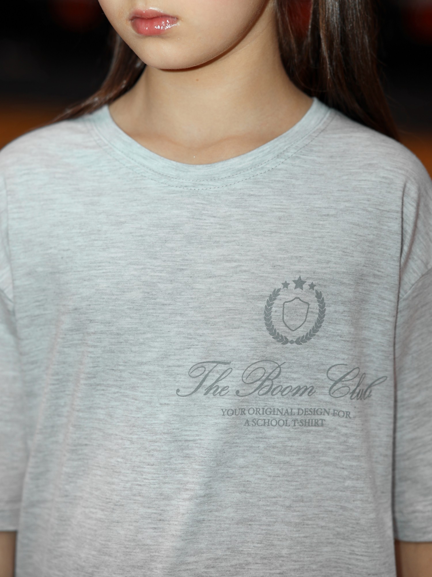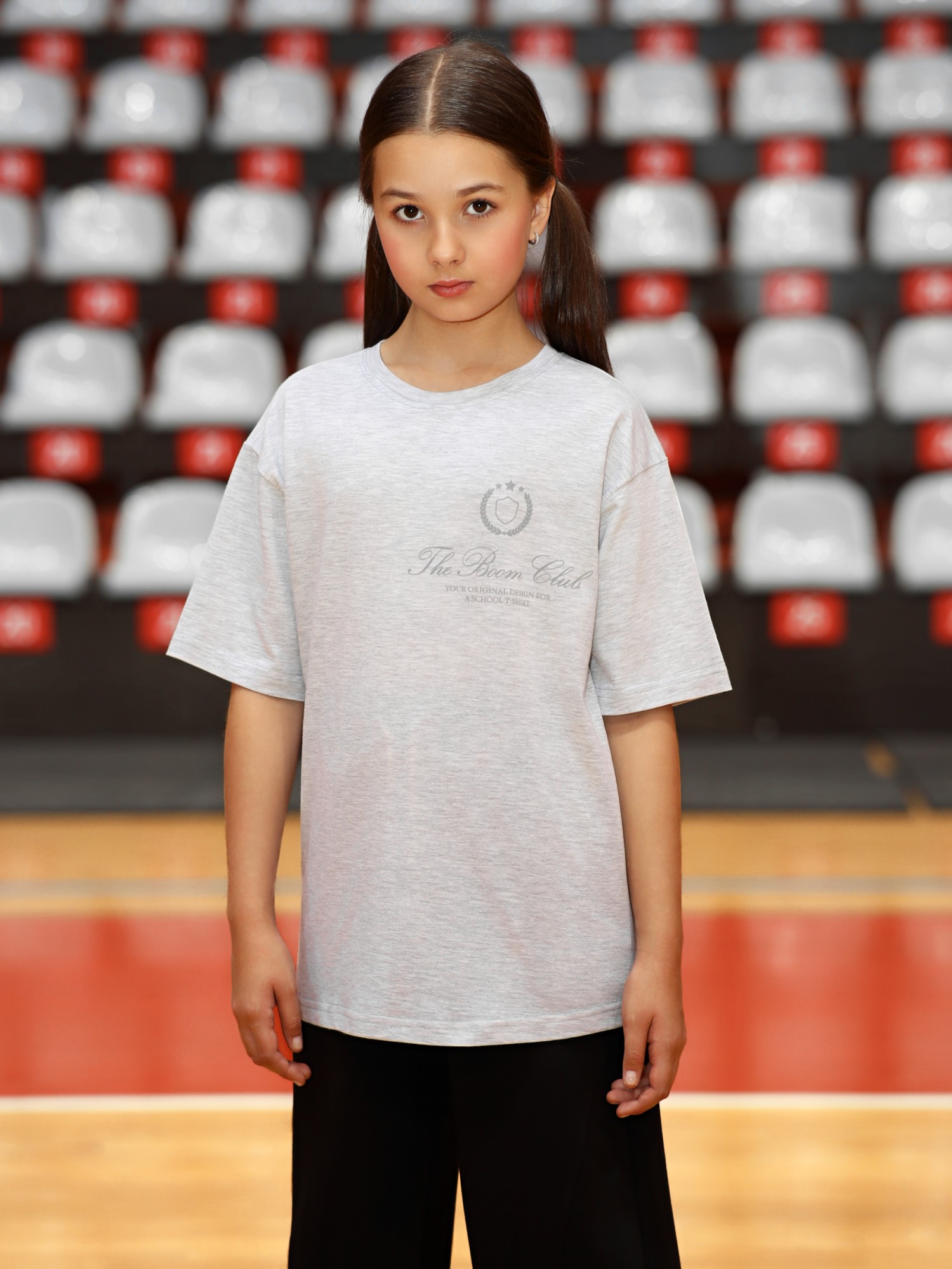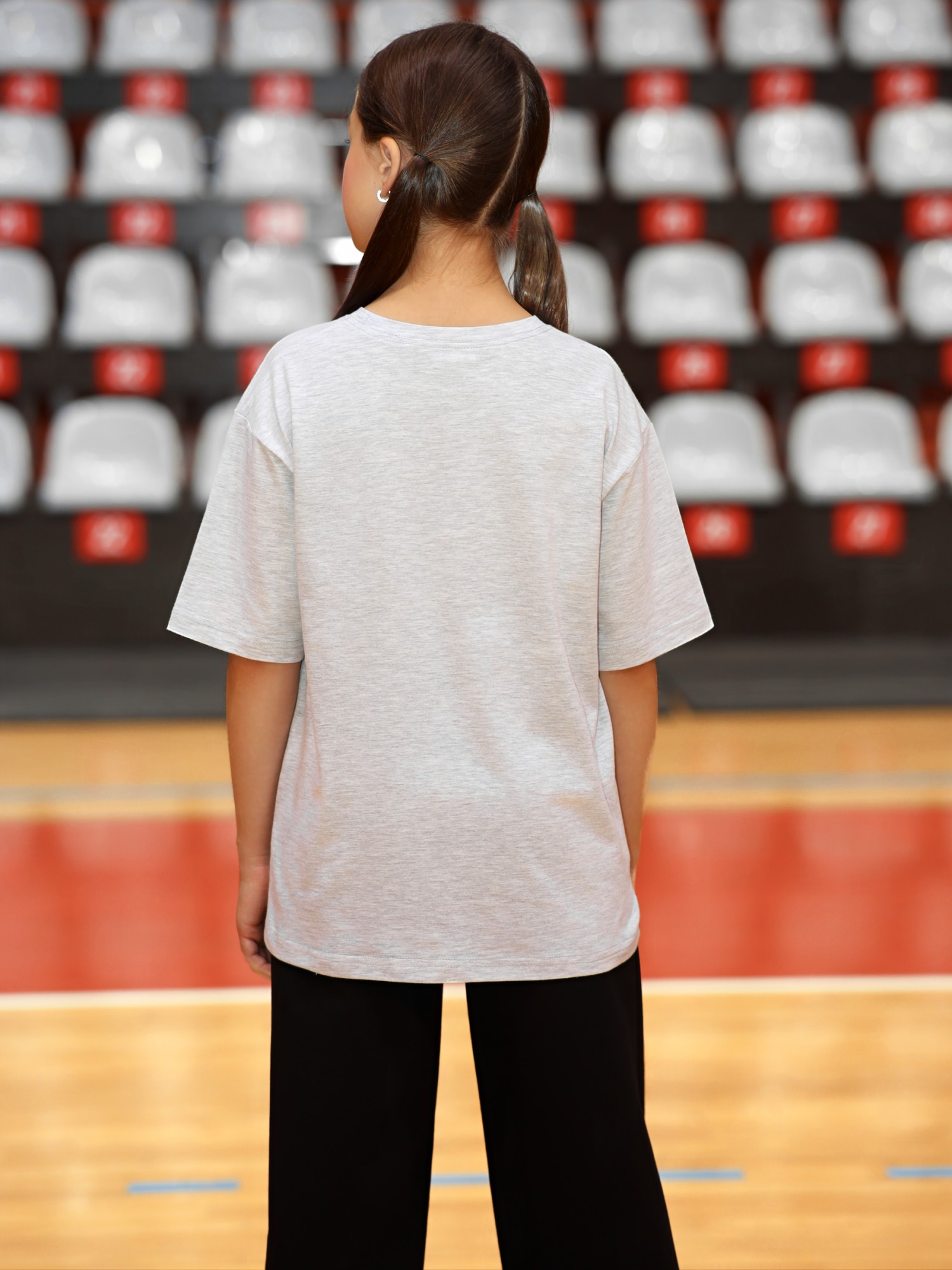 Футболка для девочки из трикотажного полотна "кармеланж" с приспущенным плечом, втачными короткими рукавами, горловиной овальной формы, обработанной втачной планкой и принтом на полочке, выполненным в технике шелкографии. По шву втачивания планки в горловину настрочена отделочная строчка.