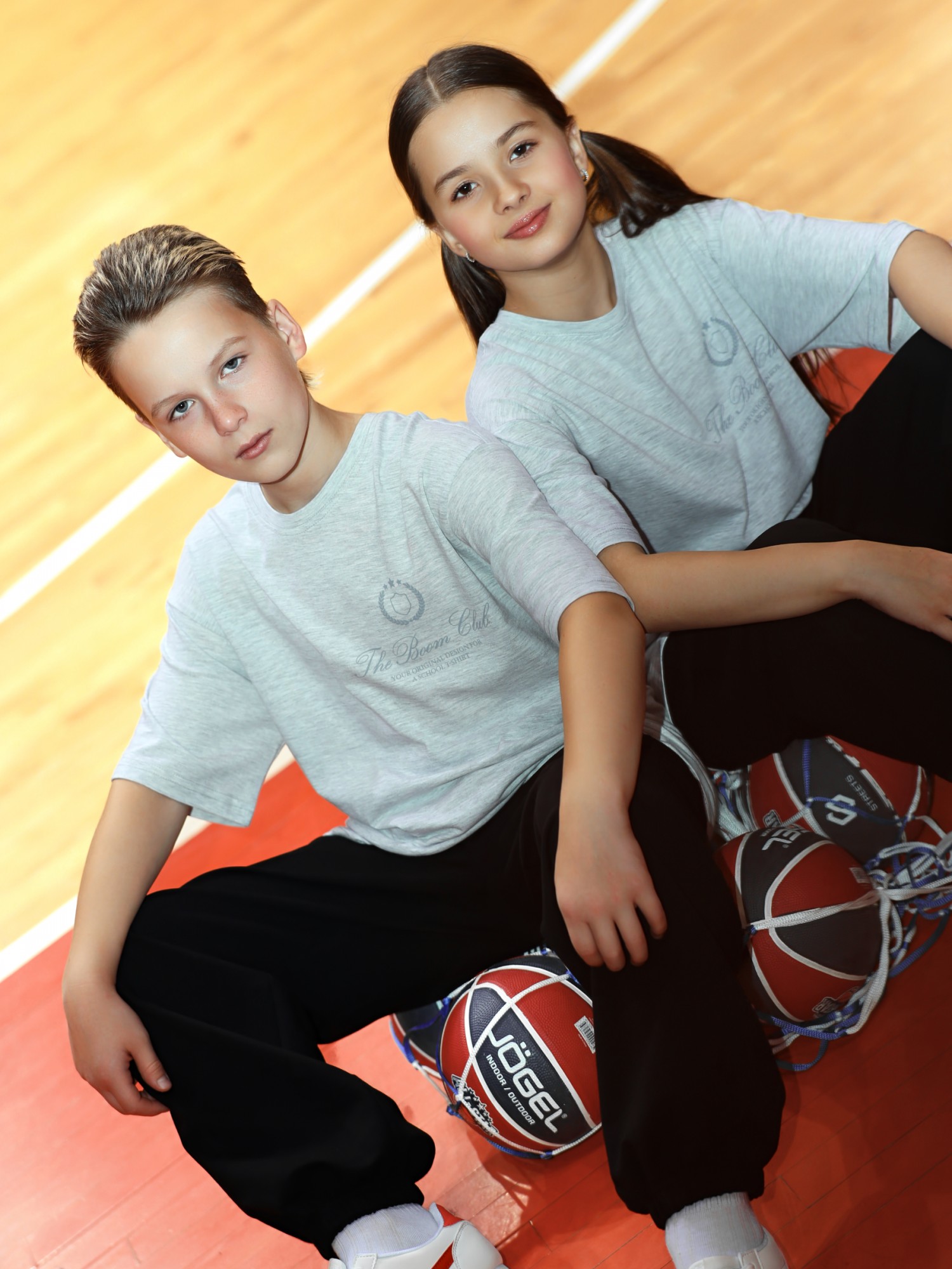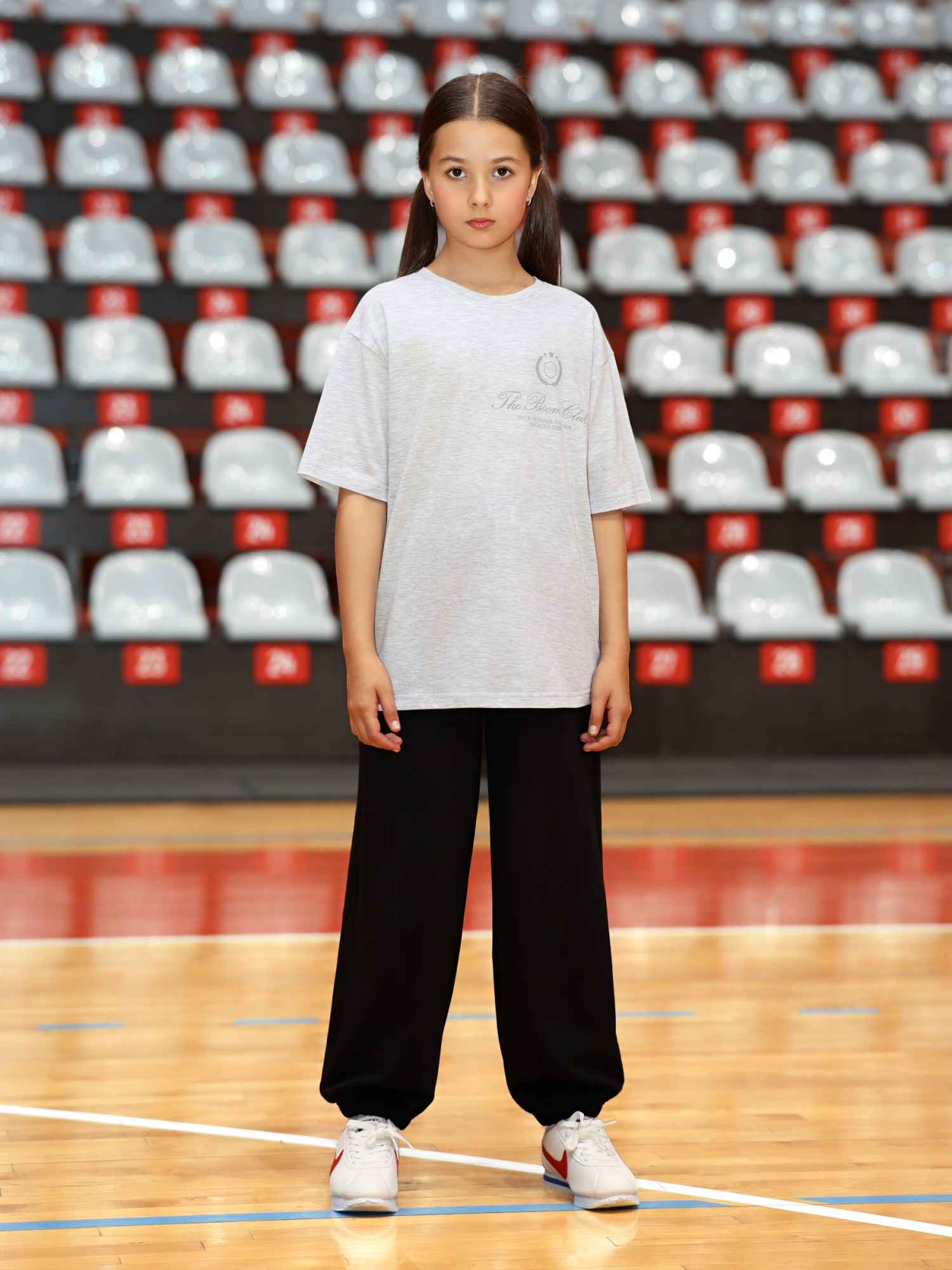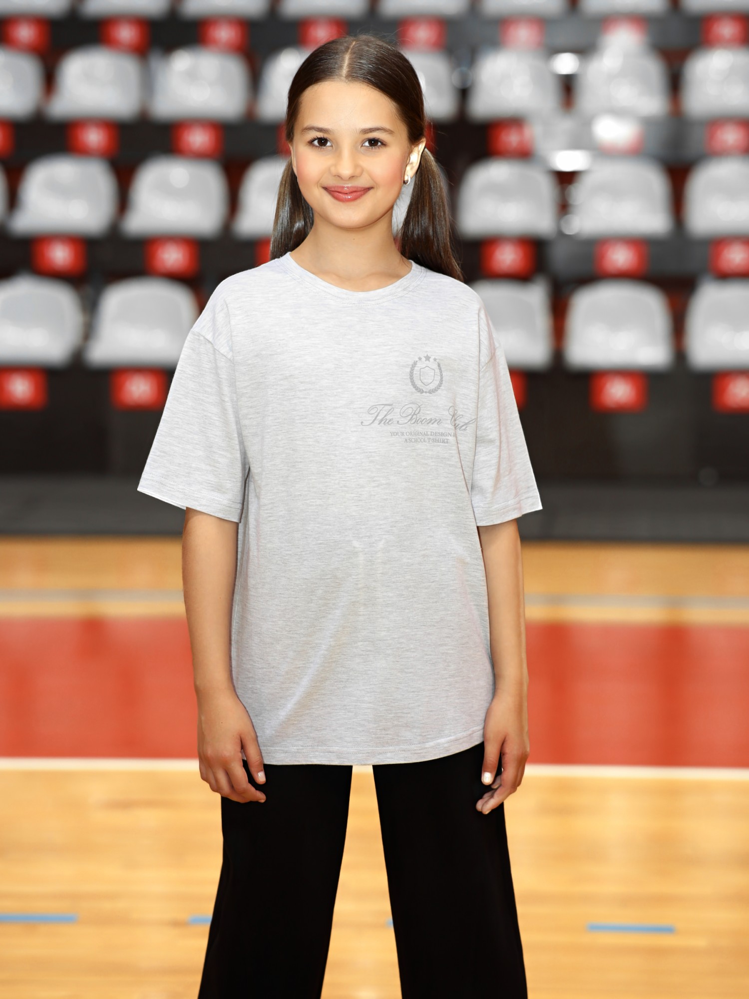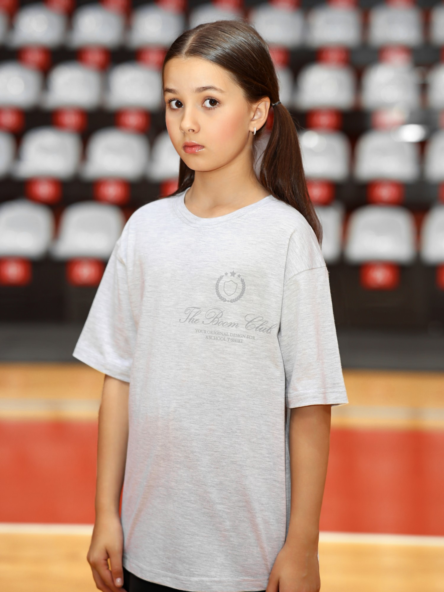 Футболка для девочки из трикотажного полотна "кармеланж" с приспущенным плечом, втачными короткими рукавами, горловиной овальной формы, обработанной втачной планкой и принтом на полочке, выполненным в технике шелкографии. По шву втачивания планки в горловину настрочена отделочная строчка.
