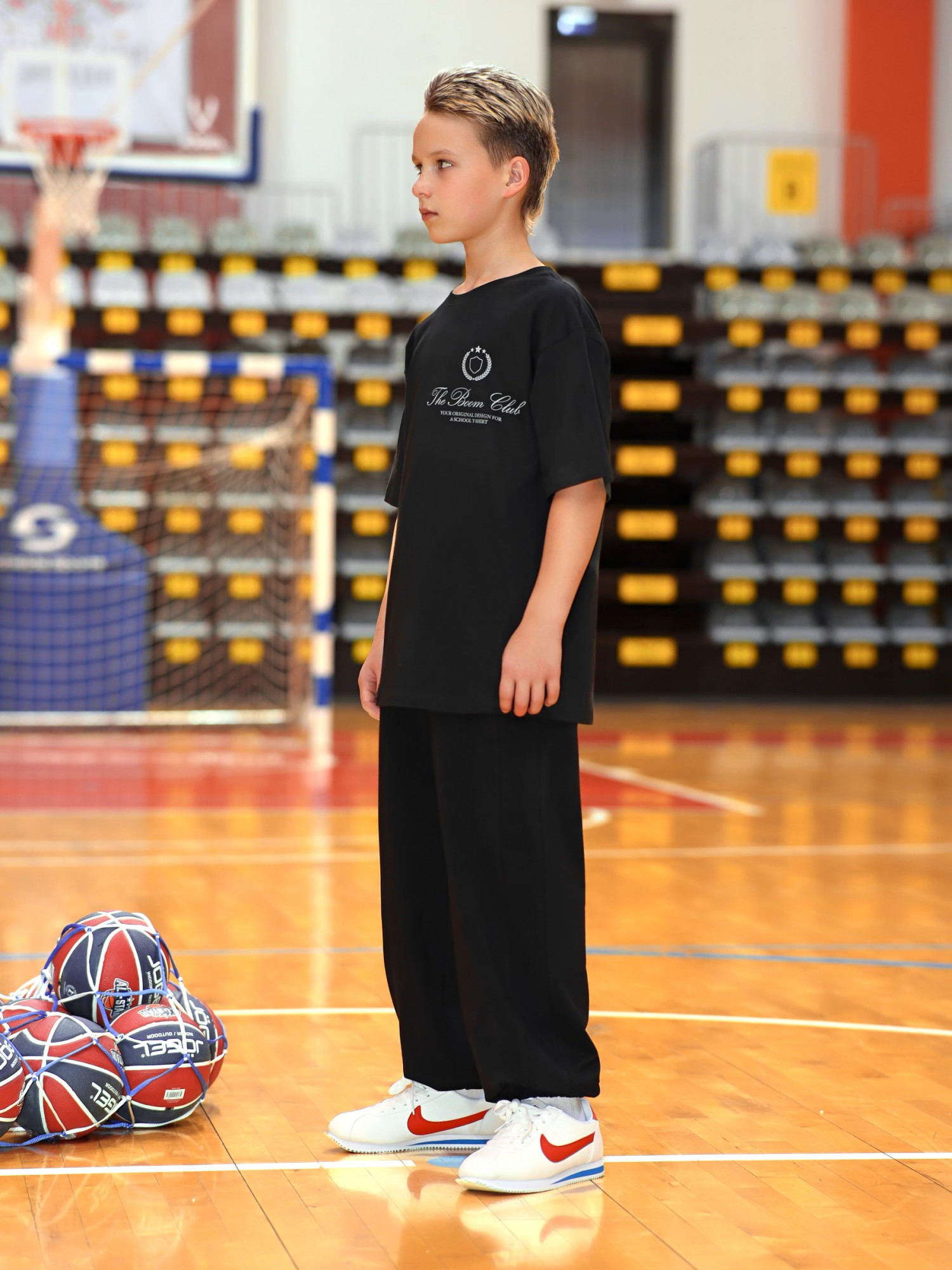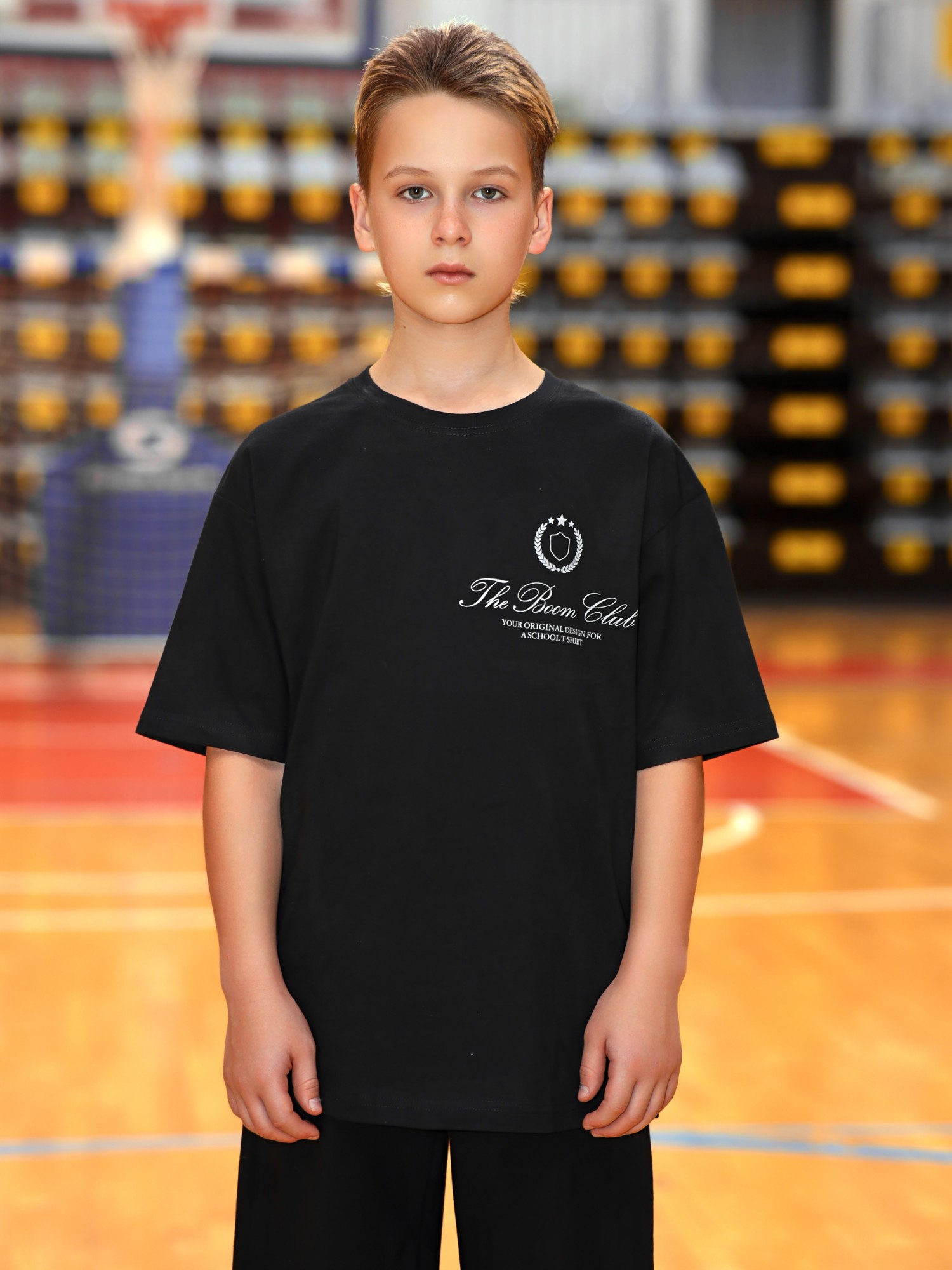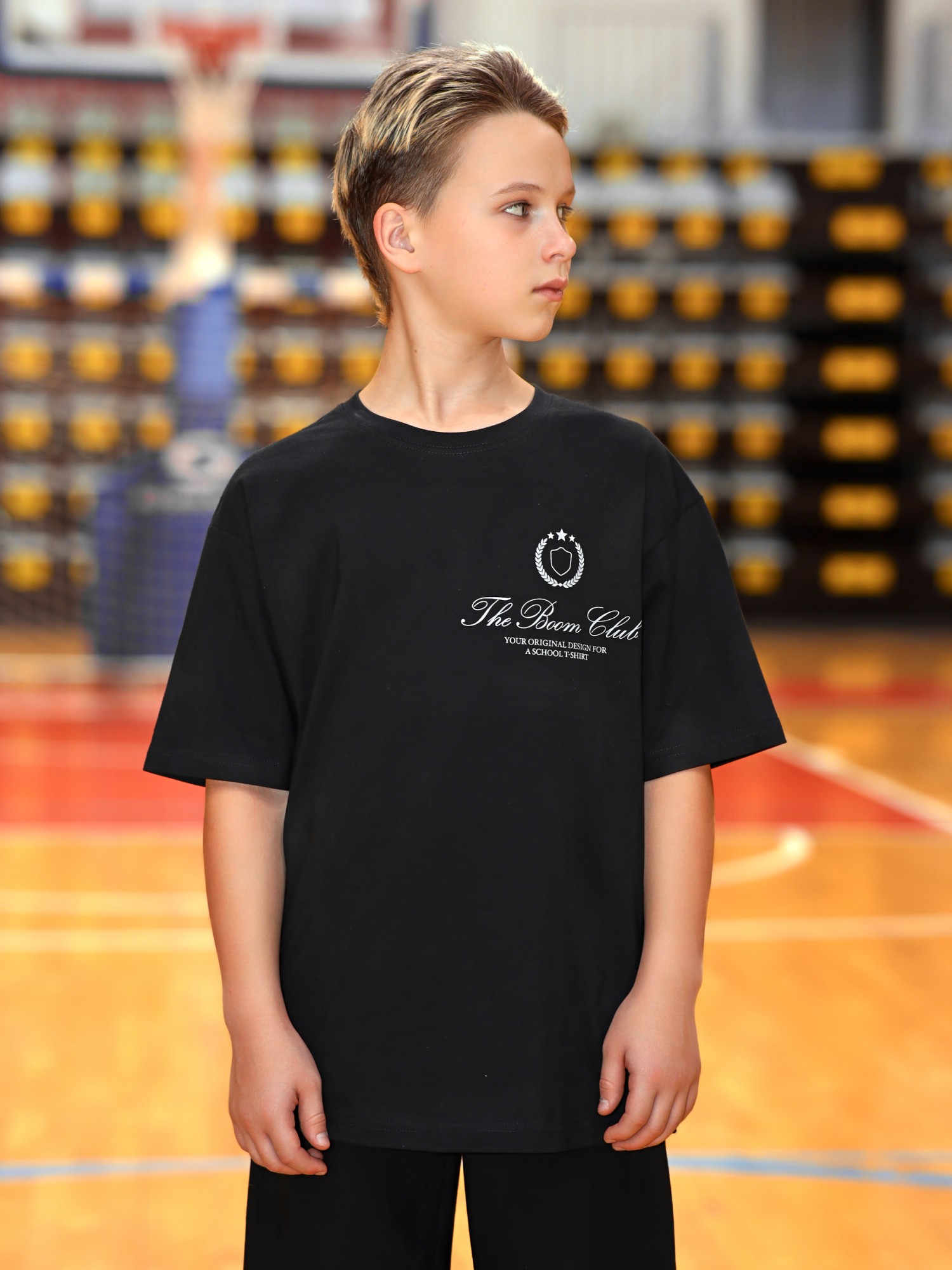 Футболка для мальчика из трикотажного полотна "кулирка" с приспущенным плечом, втачными короткими рукавами, горловиной овальной формы, обработанной втачной планкой и принтом на полочке, выполненным в технике шелкографии. По шву втачивания планки в горловину настрочена отделочная строчка.