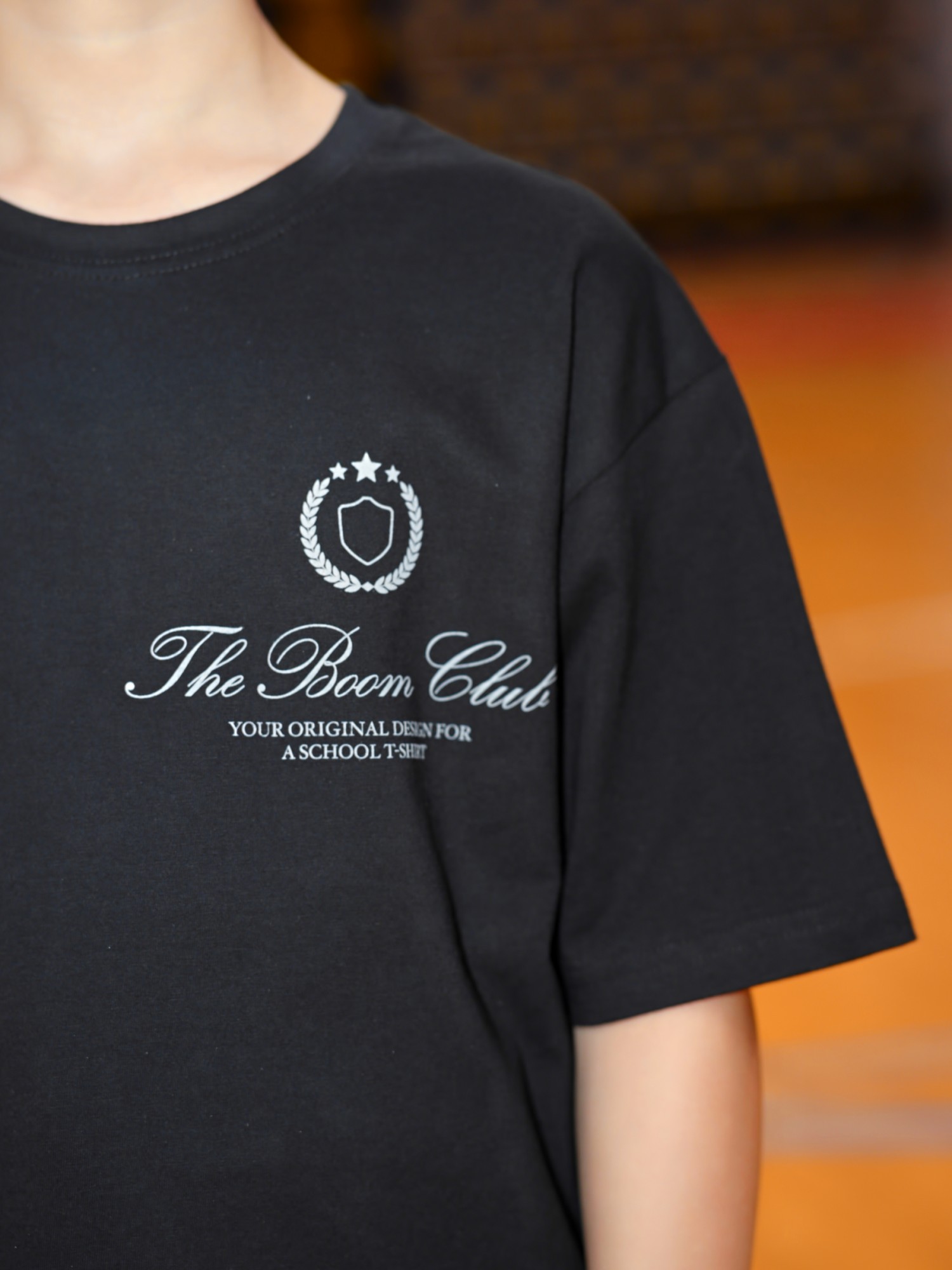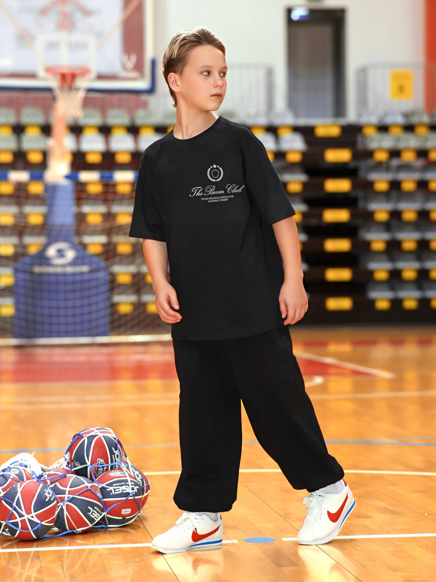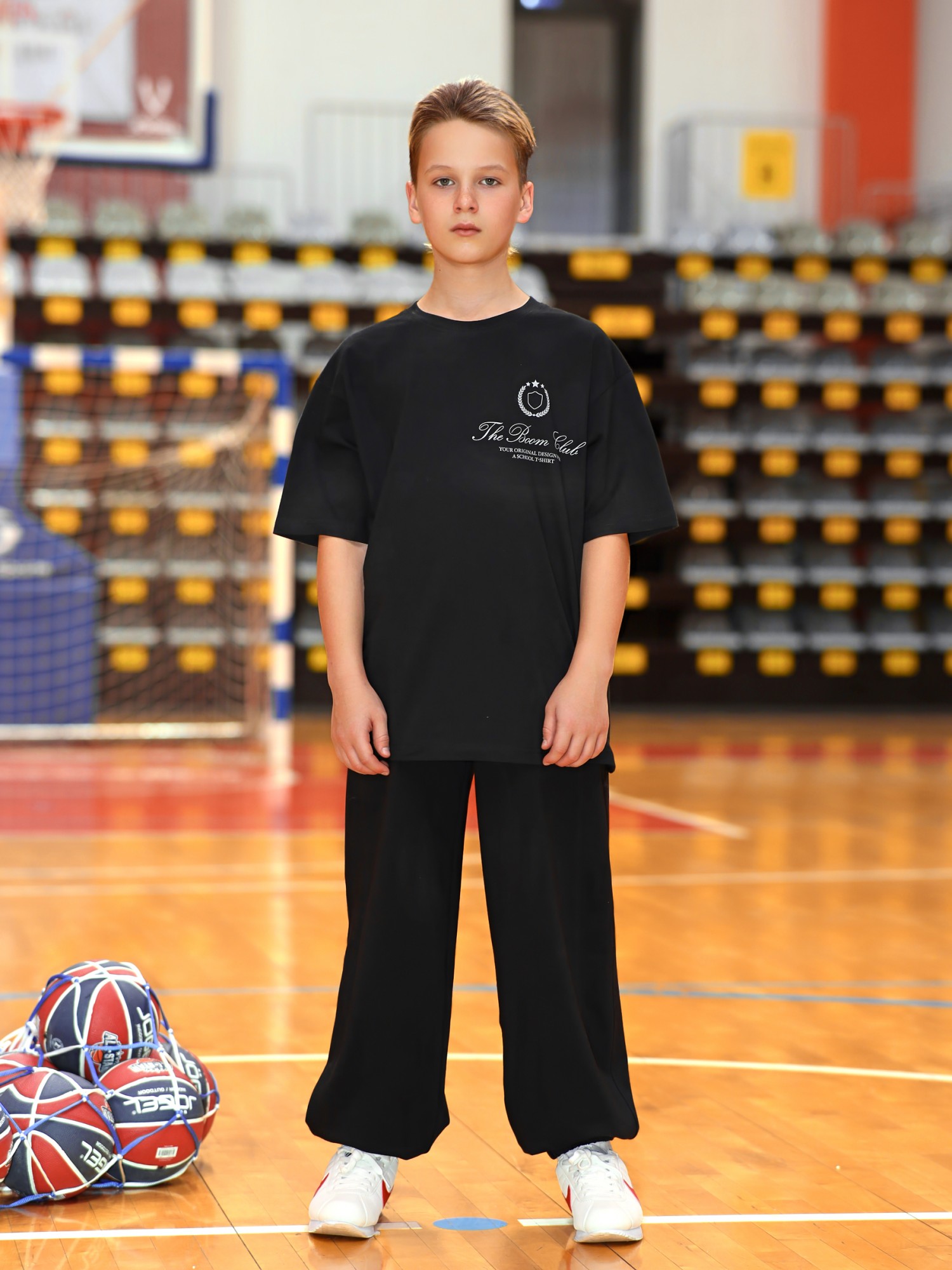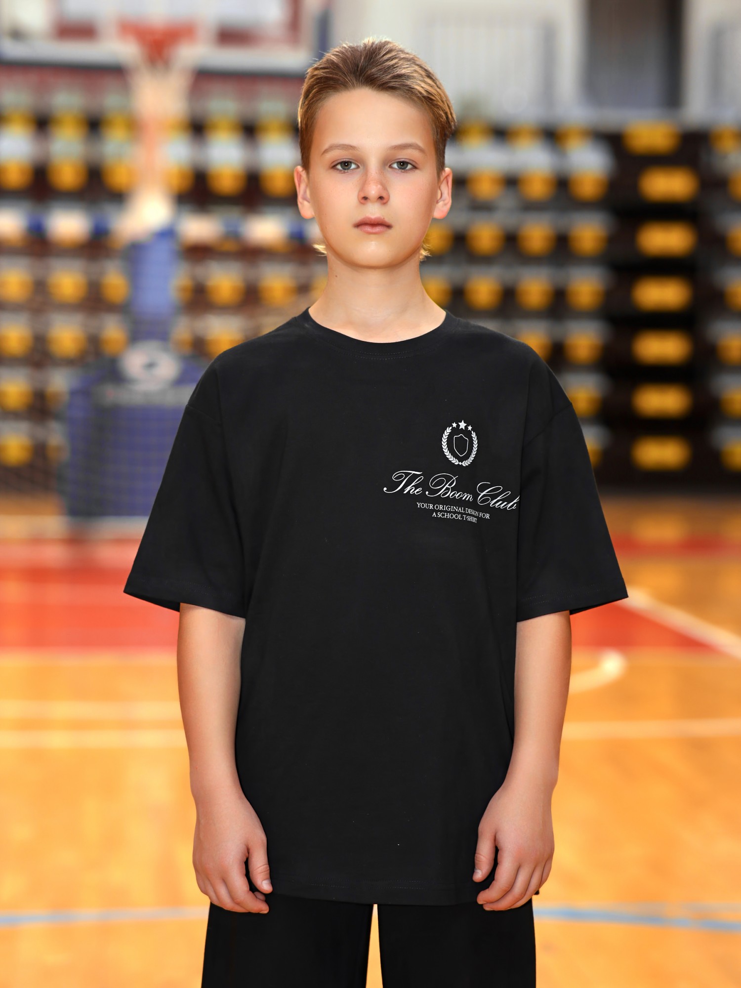 Футболка для мальчика из трикотажного полотна "кулирка" с приспущенным плечом, втачными короткими рукавами, горловиной овальной формы, обработанной втачной планкой и принтом на полочке, выполненным в технике шелкографии. По шву втачивания планки в горловину настрочена отделочная строчка.