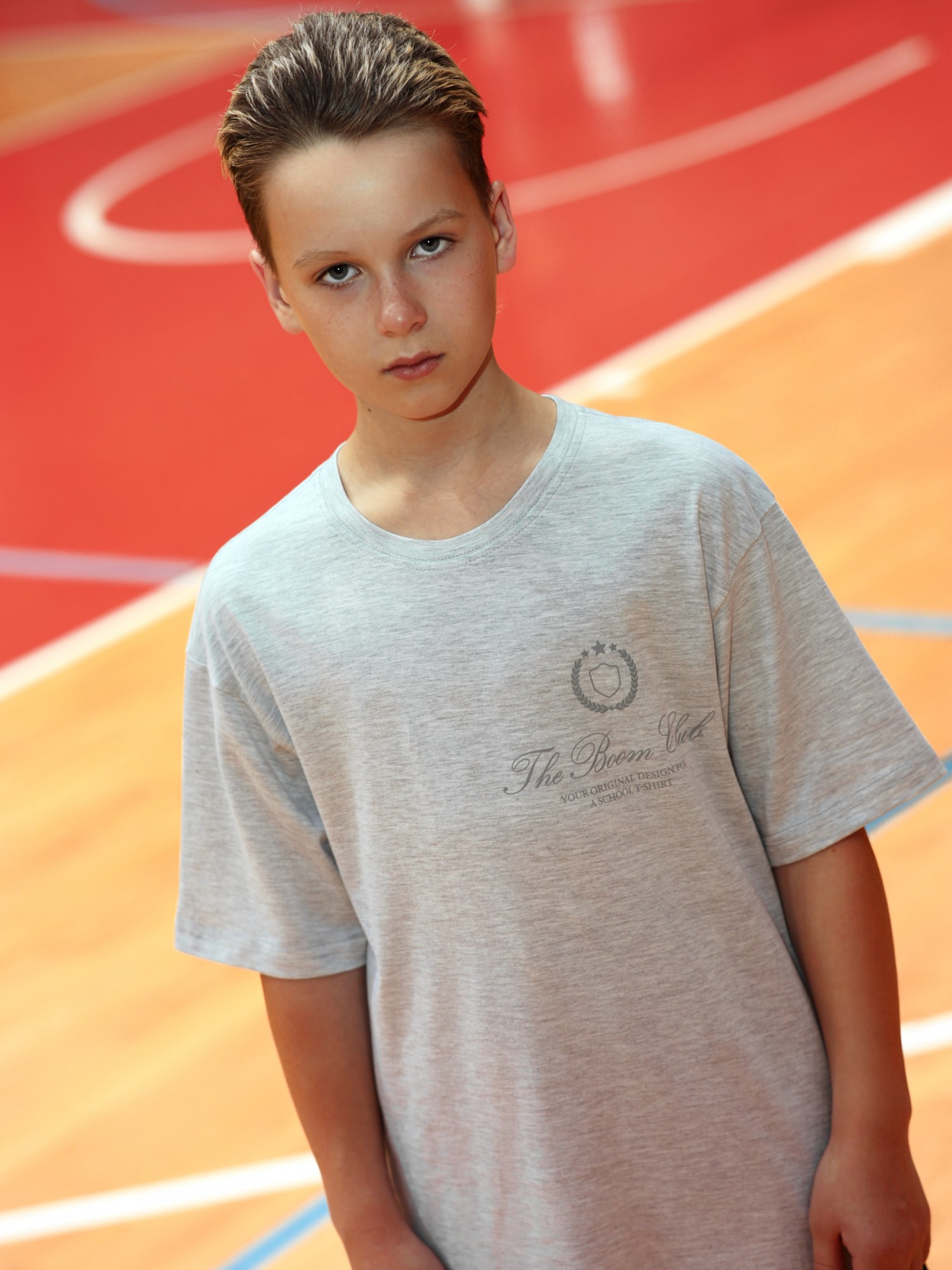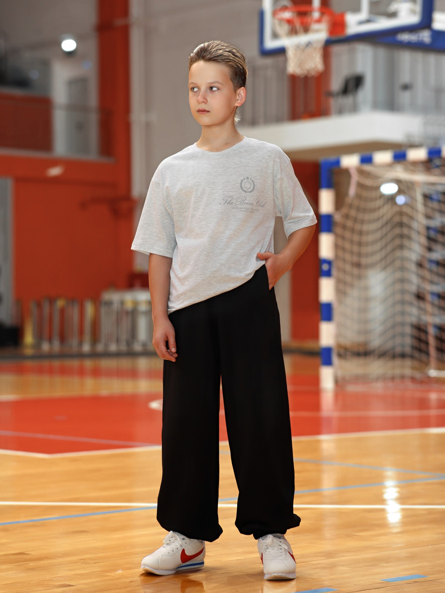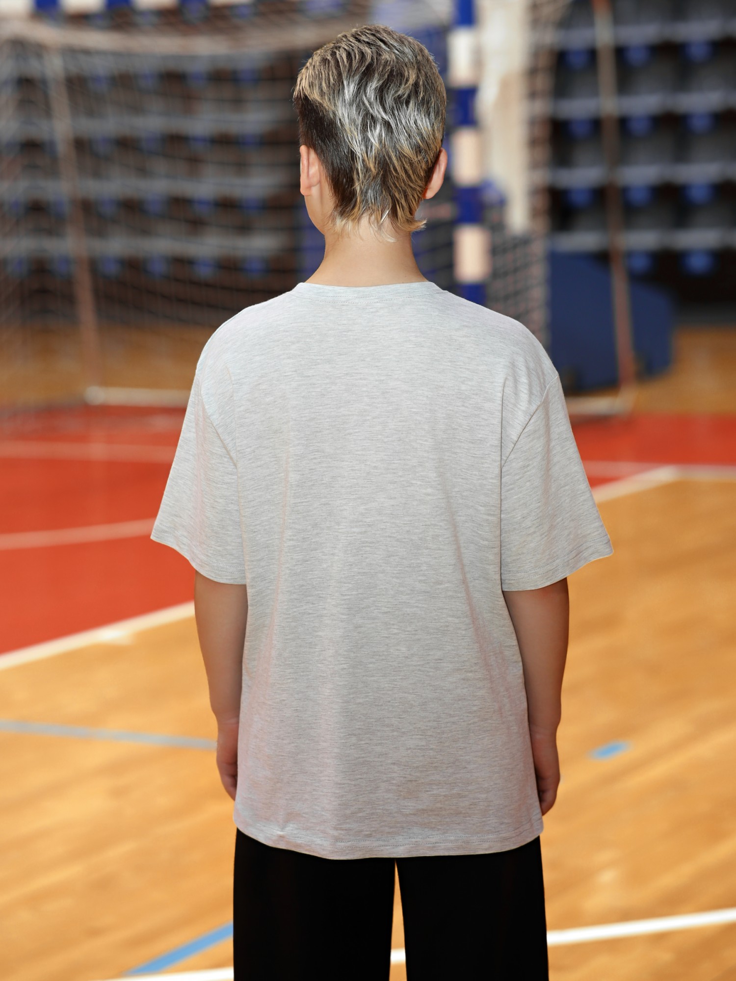 Футболка для мальчика из трикотажного полотна "кармеланж" с приспущенным плечом, втачными короткими рукавами, горловиной овальной формы, обработанной втачной планкой и принтом на полочке, выполненным в технике шелкографии. По шву втачивания планки в горловину настрочена отделочная строчка.