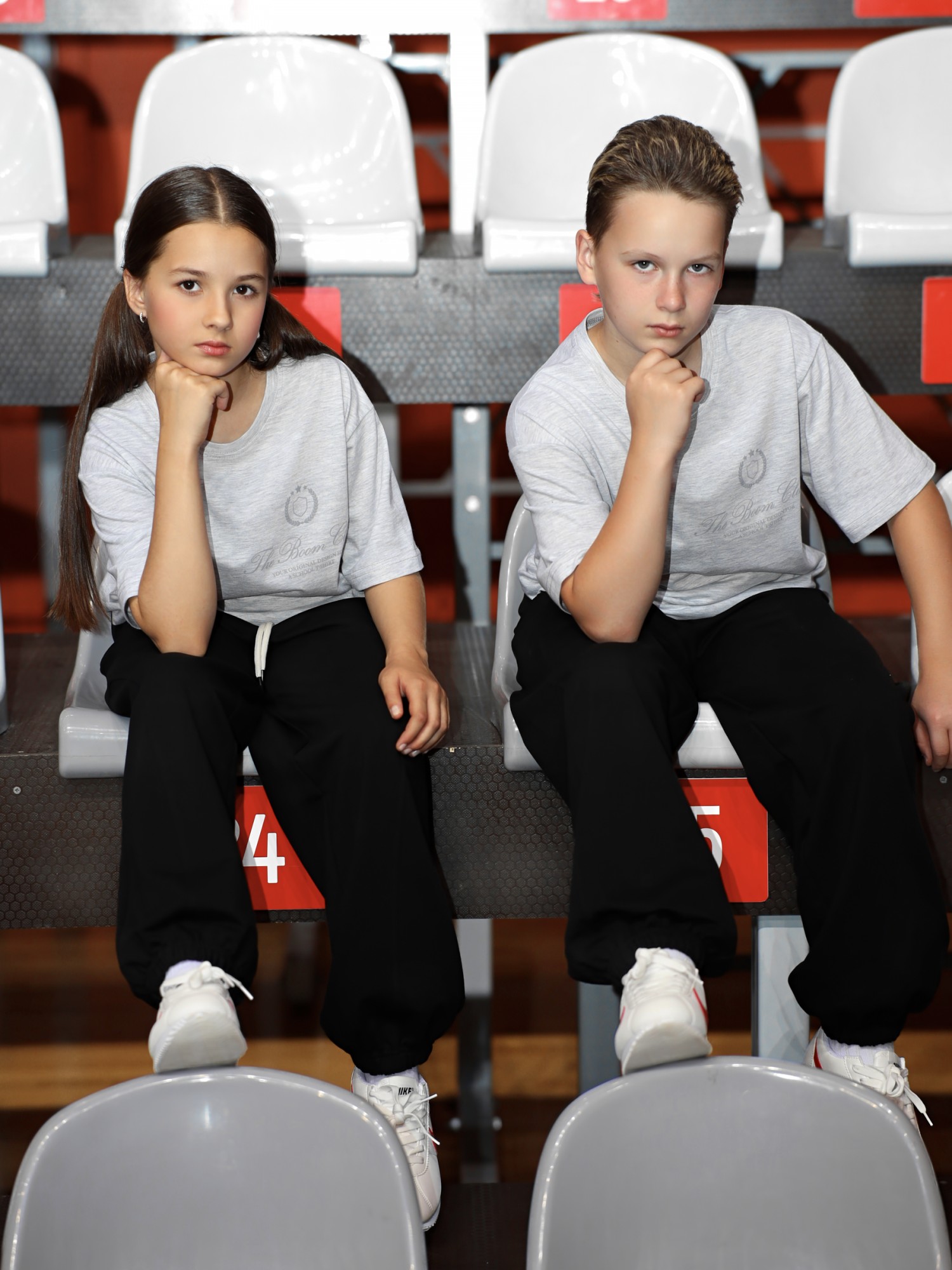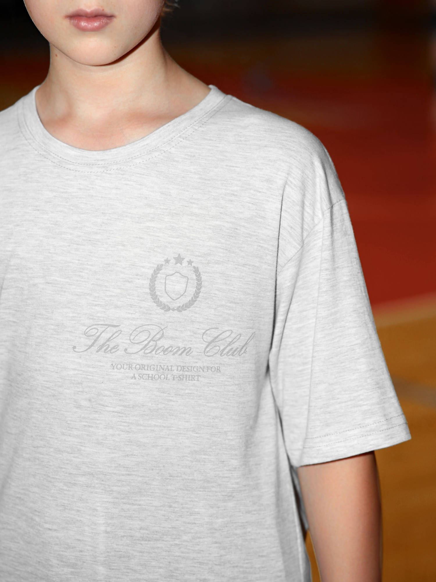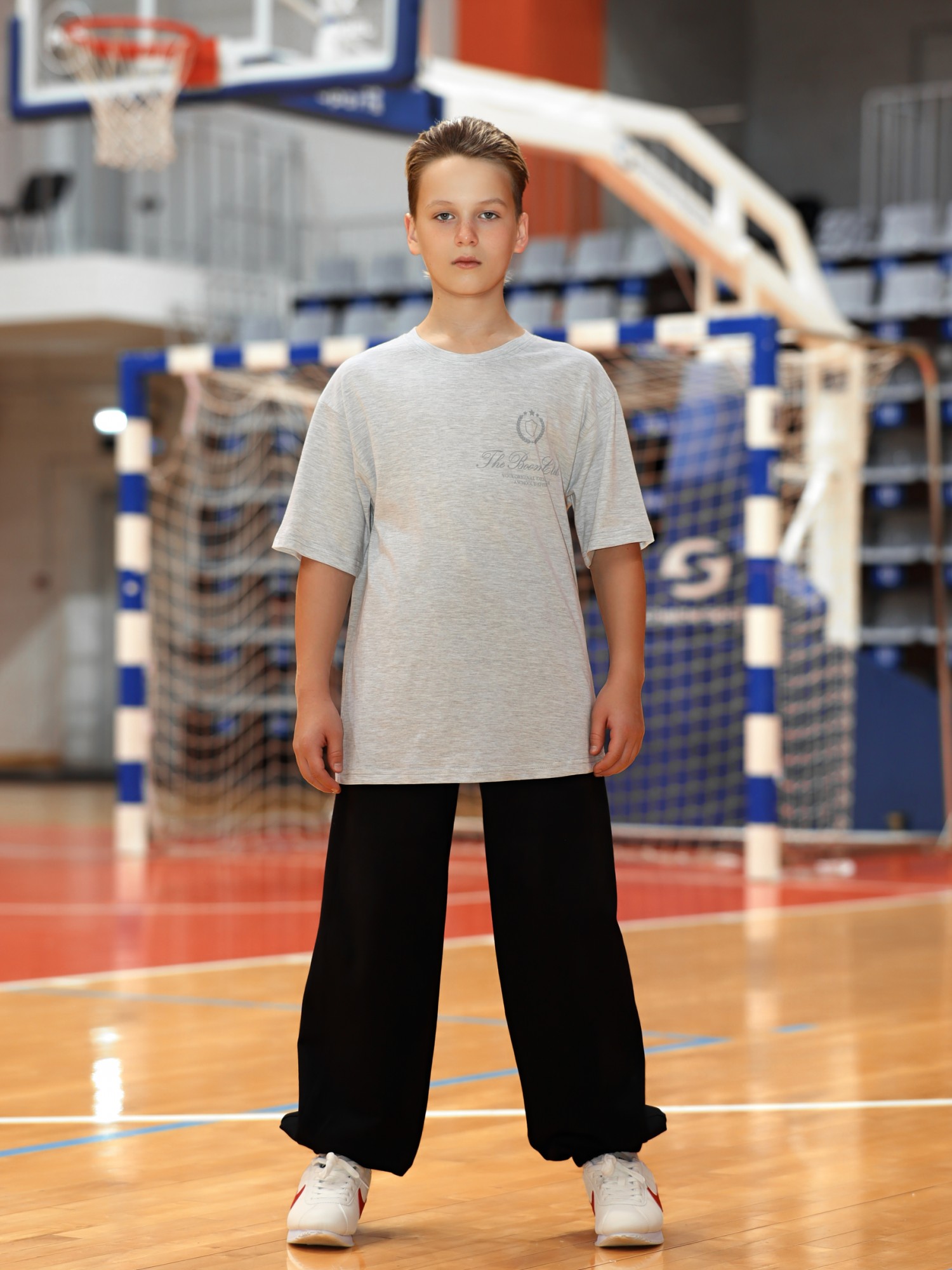 Футболка для мальчика из трикотажного полотна "кармеланж" с приспущенным плечом, втачными короткими рукавами, горловиной овальной формы, обработанной втачной планкой и принтом на полочке, выполненным в технике шелкографии. По шву втачивания планки в горловину настрочена отделочная строчка.