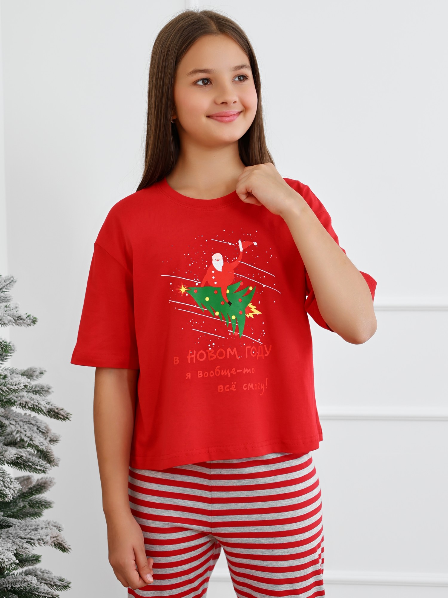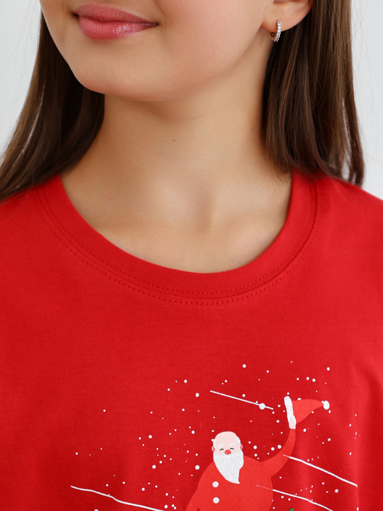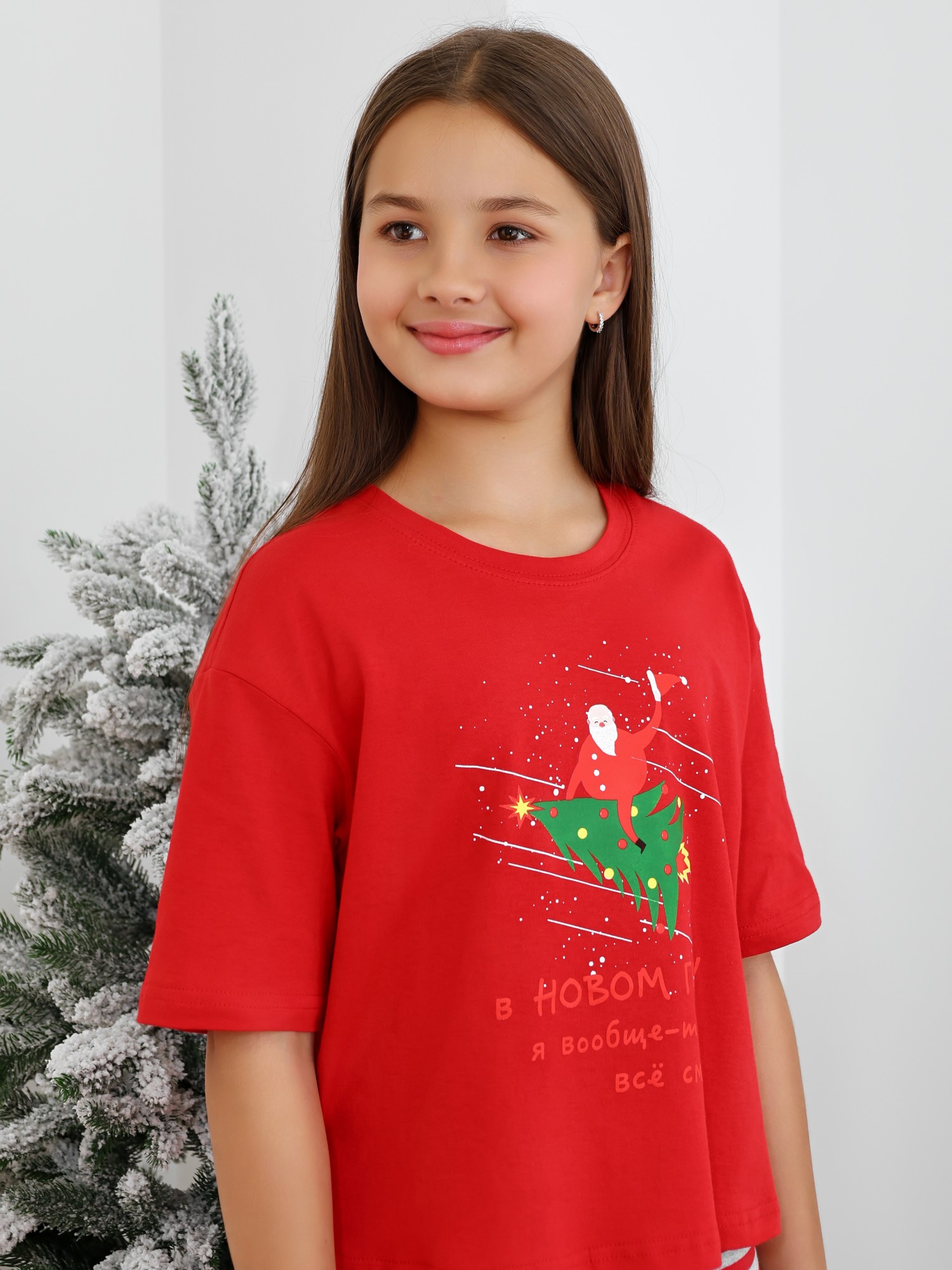 Футболка детская из гладкокрашеного трикотажного полотна "кулирка", модного силуэта, слегка укороченная, свободного покроя, с приспущенным плечом, втачными рукавами длиной до локтя, горловиной овальной формы, обработанной втачной планкой и принтом в центре переда. По шву втачивания планки настрочена отделочная строчка. Низ изделия и нижние срезы рукавов обработаны швом вподгибку.