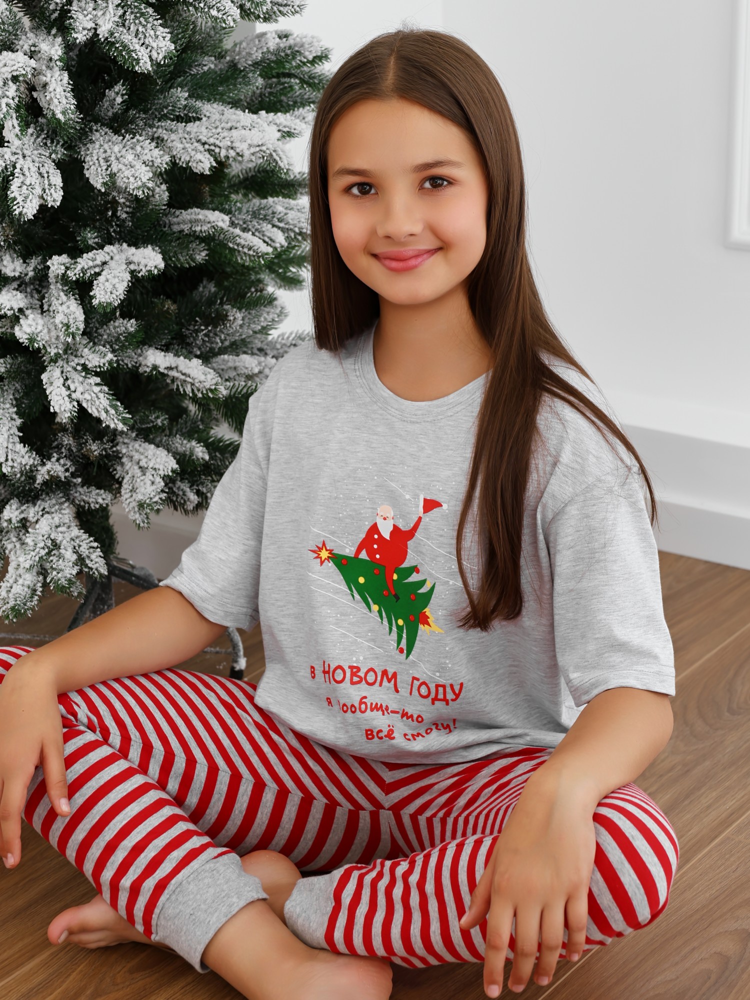 Футболка детская из гладкокрашеного трикотажного полотна "кулирка", модного силуэта, слегка укороченная, свободного покроя, с приспущенным плечом, втачными рукавами длиной до локтя, горловиной овальной формы, обработанной втачной планкой и принтом в центре переда. По шву втачивания планки настрочена отделочная строчка. Низ изделия и нижние срезы рукавов обработаны швом вподгибку.