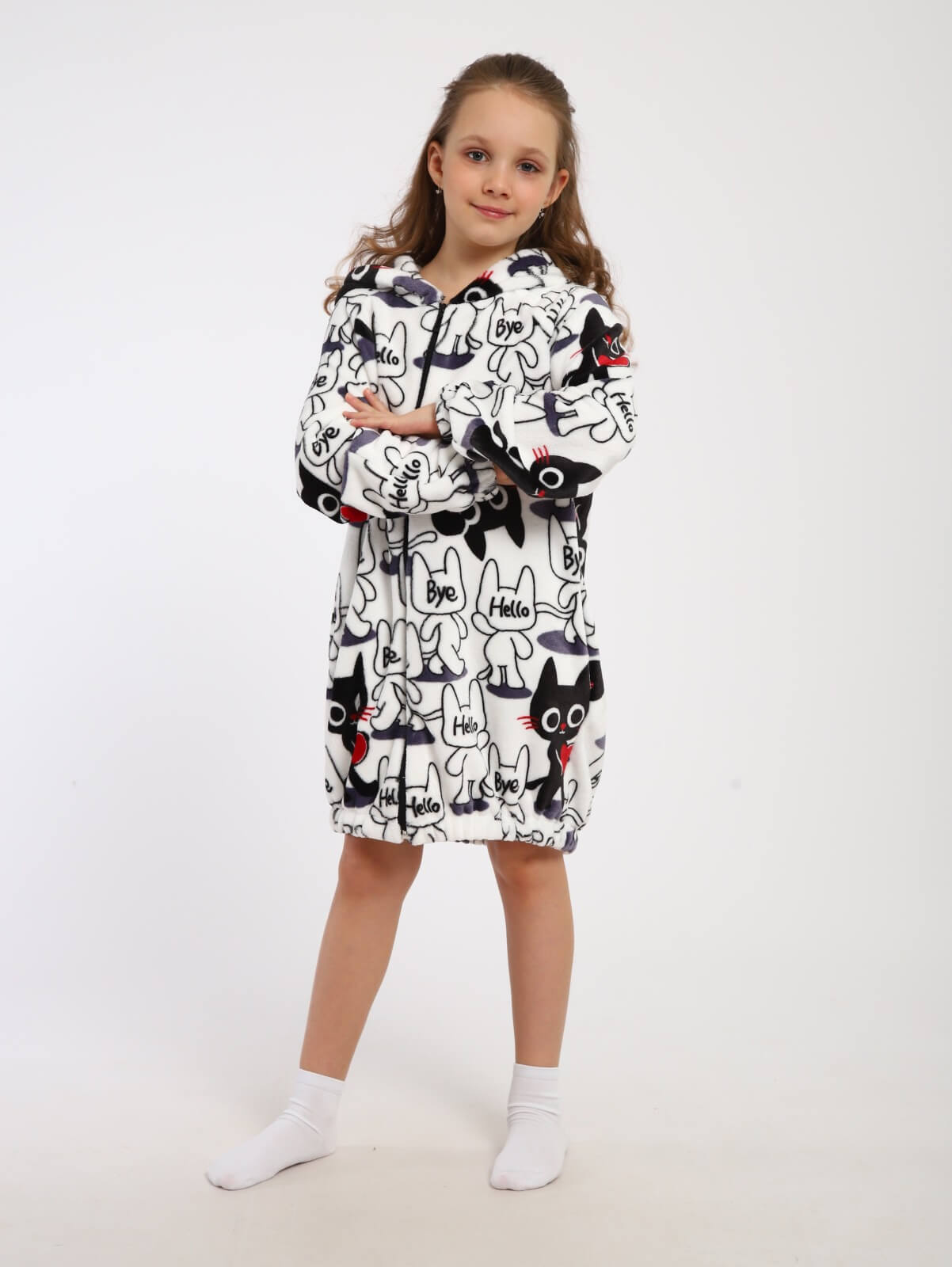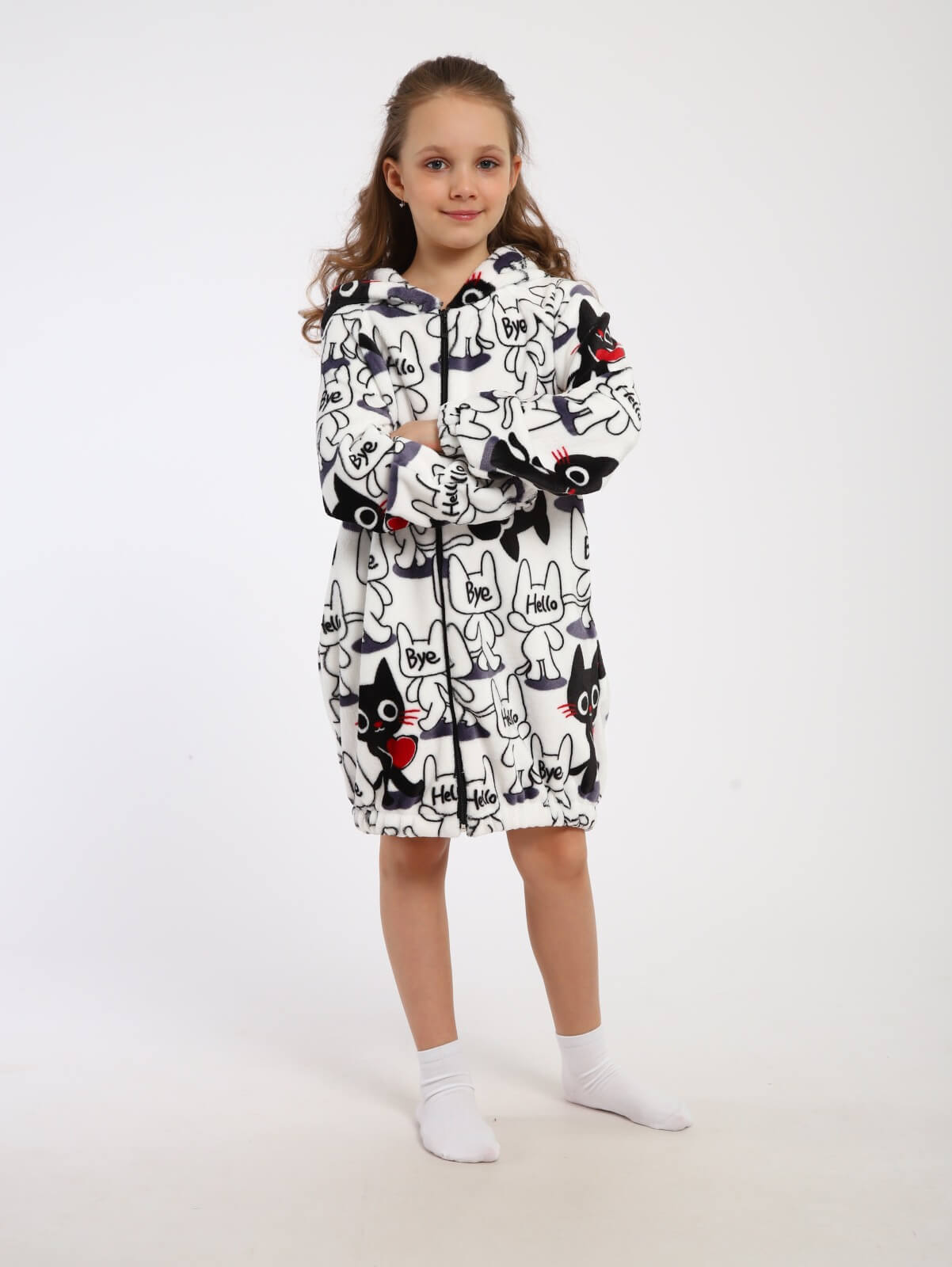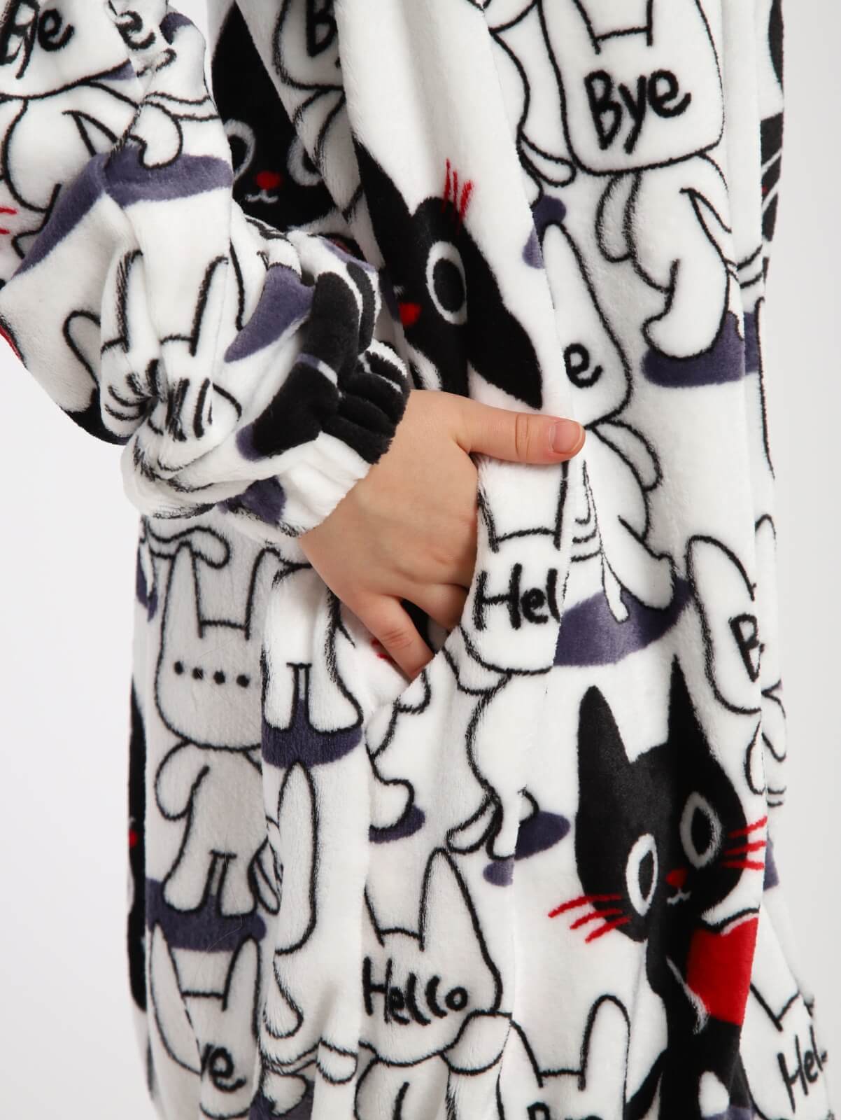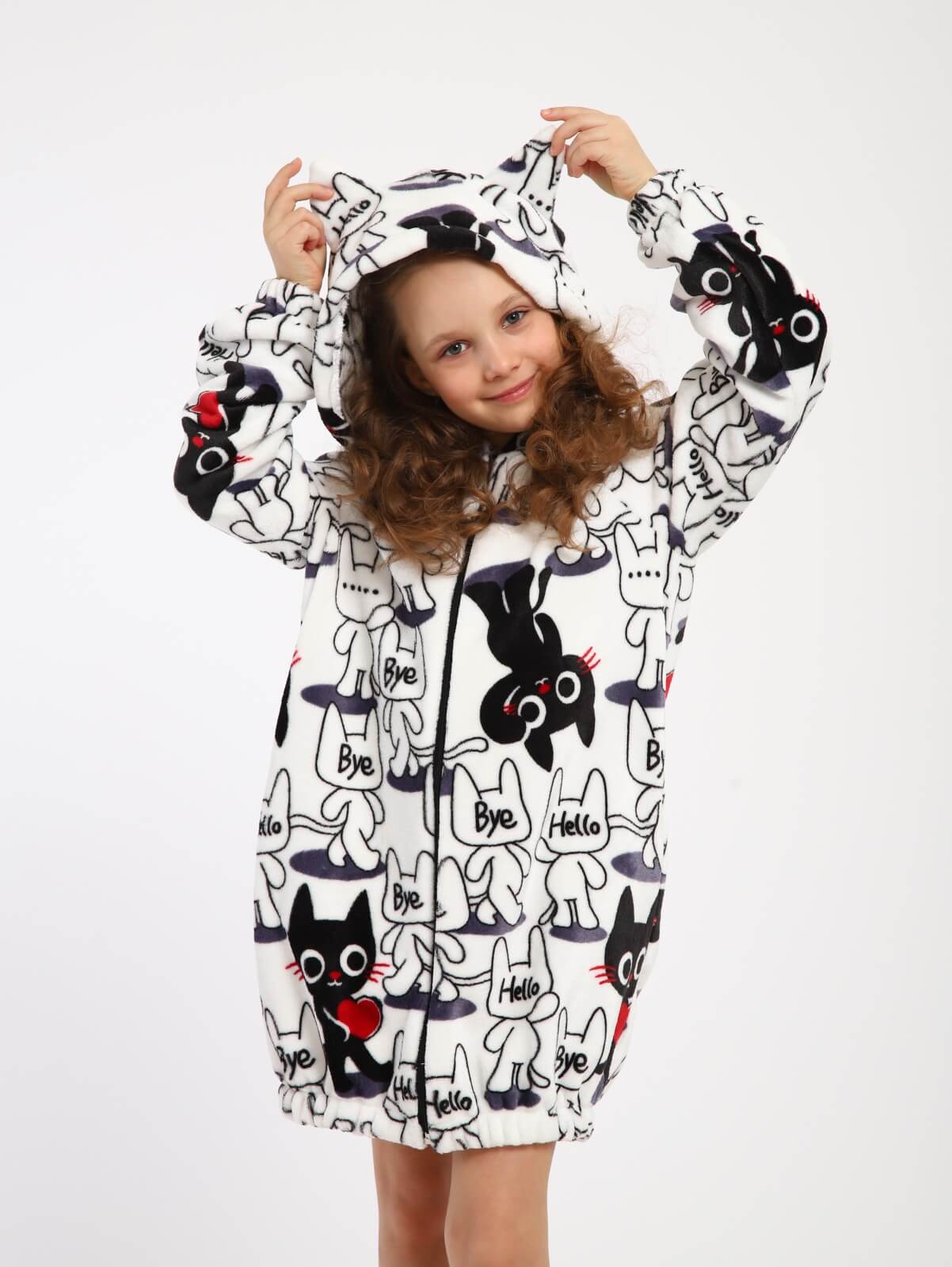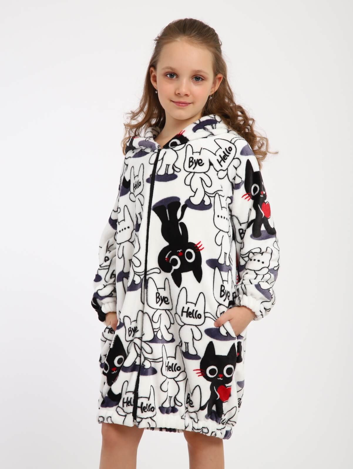Халат на молнии домашний "Мурлыка" / Белый – это идеальный выбор для девочек, предпочитающих комфорт и стиль в повседневной жизни. Этот халат выполнен из мягкого и теплого полиэстера, который обеспечивает уютное ощущение при носке. Халат из материала велсофт имеет длинные рукава прямого покроя и удобные карманы в боковых швах, что делает его идеальным для использования как дома, так и во время спортивных занятий.