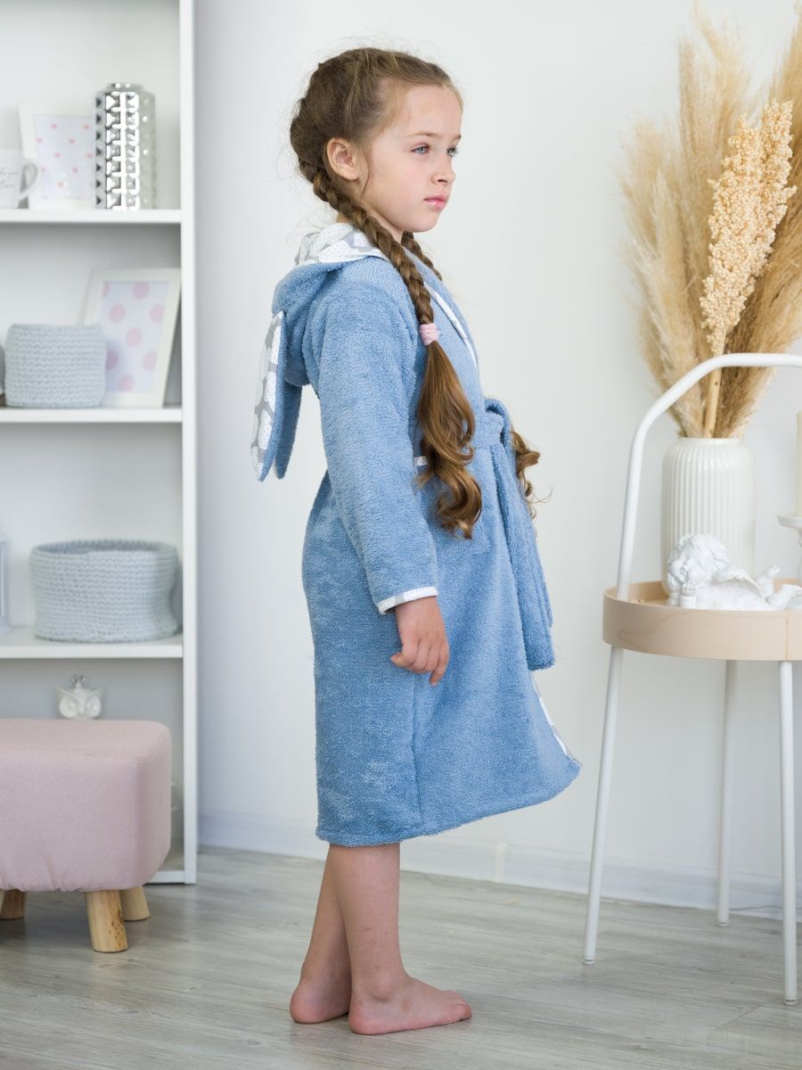 Халат для девочки с ушками зайца выглядит стильно и забавно. Контрастная окантовка из натуральной белой бязи делает махровый халат ещё более красивым, а вместительные карманы и широкий пояс обеспечивают повышенный комфорт.
