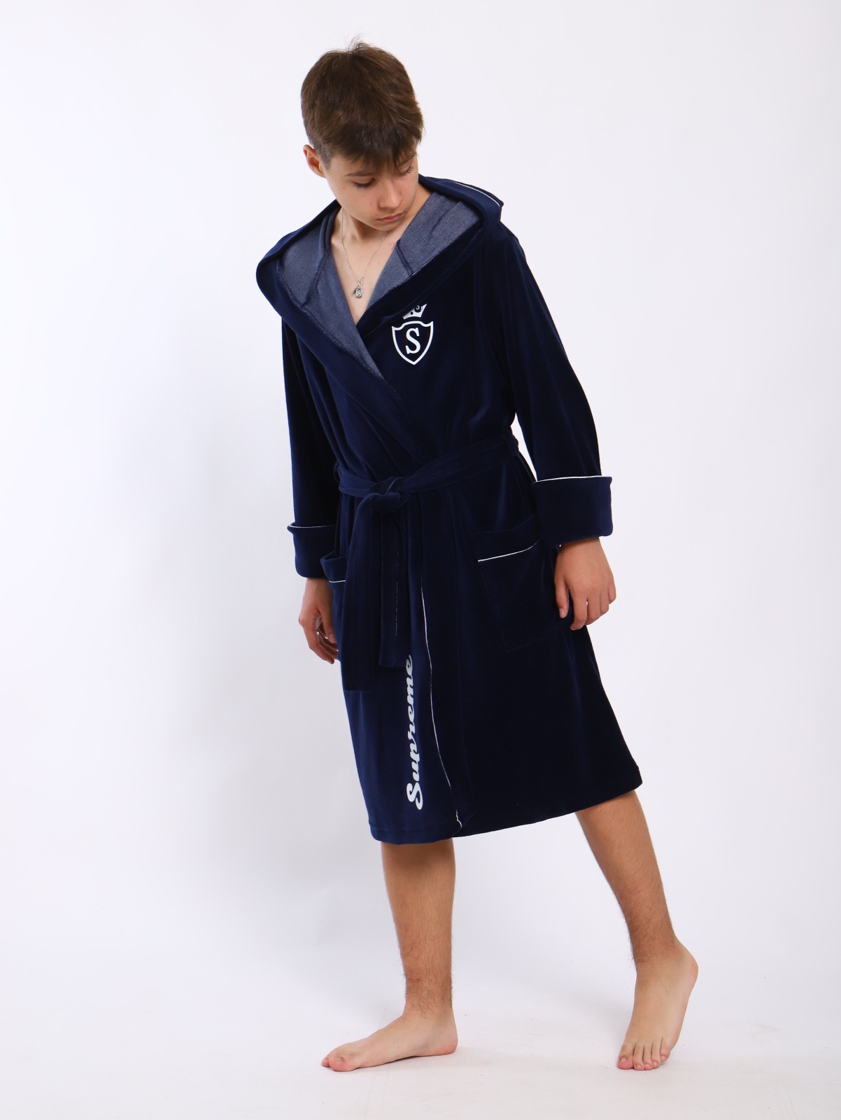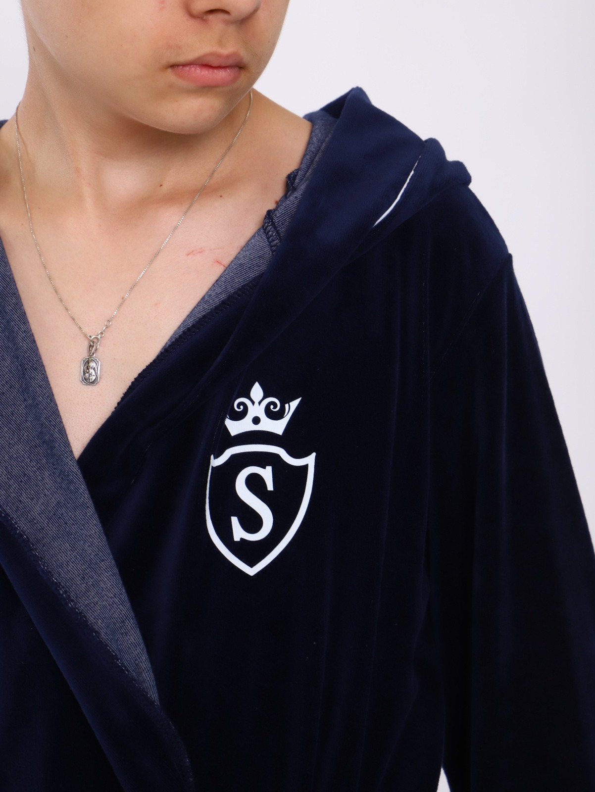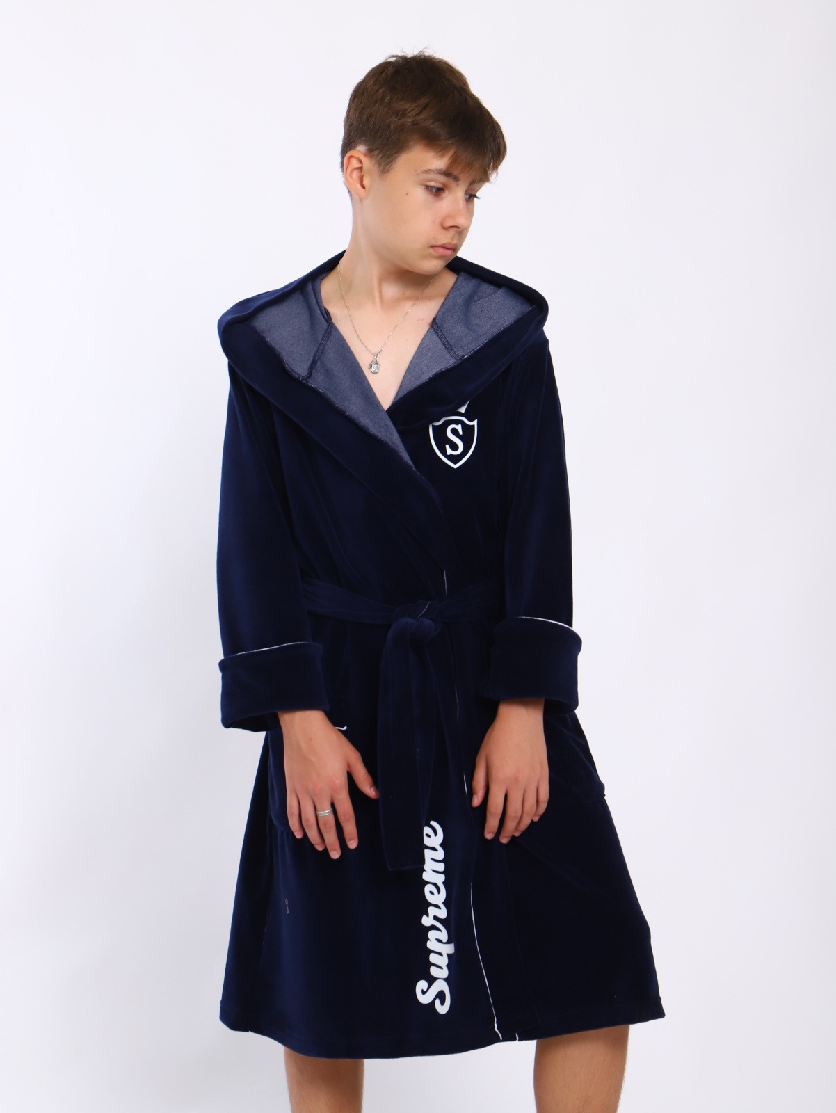 Банный детский халат "Самсон" / Синий сшит их велюра с хлопком. Застежка на запах, по талии фиксируется поясом. Очень нежный мягкий и свободный.