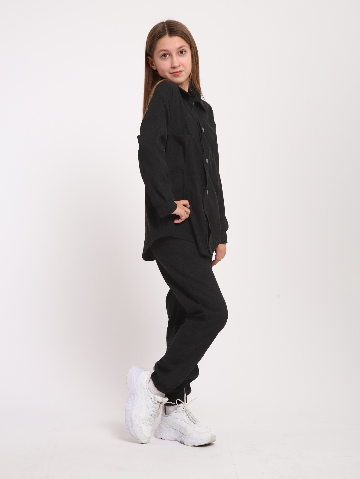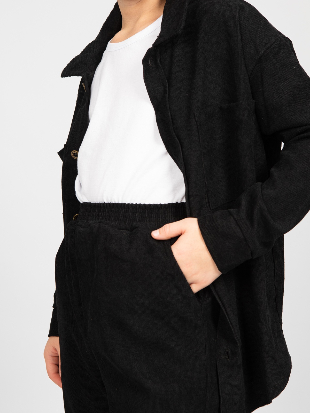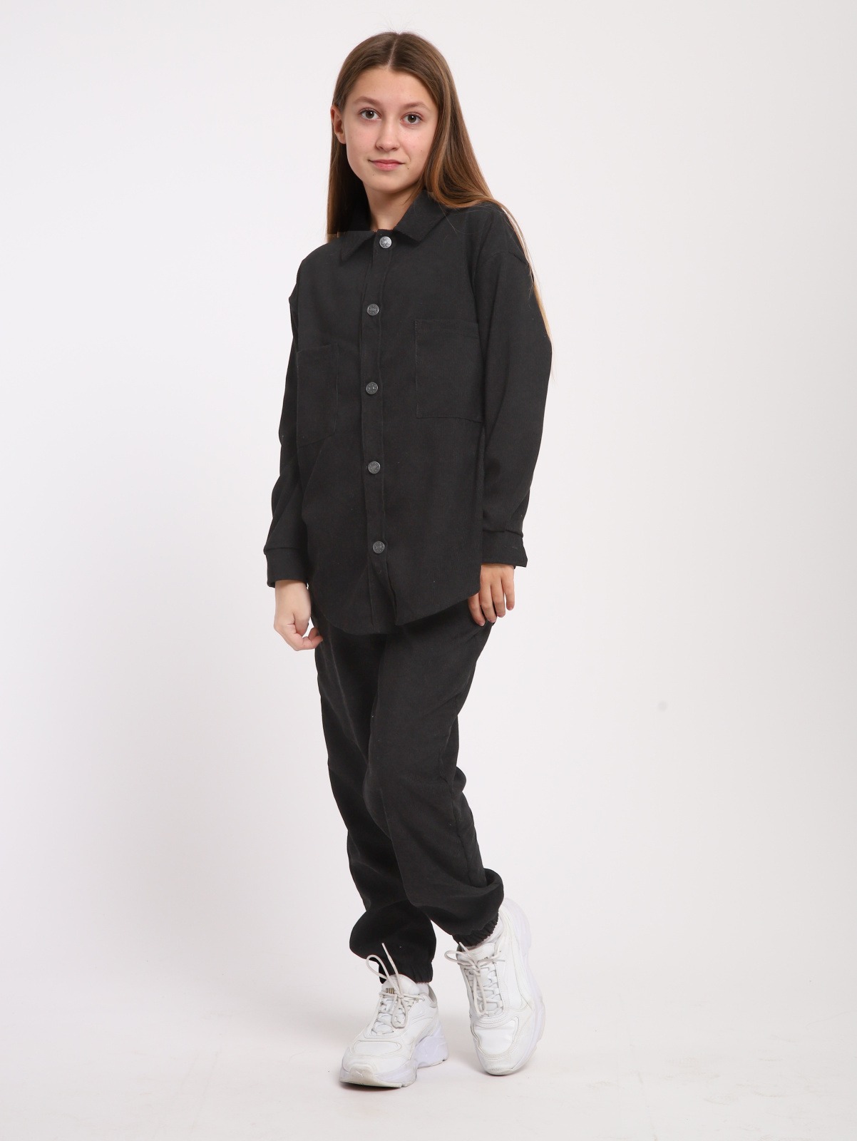 Модный подростковый вельветовый костюм в монохромной гамме для мальчиков и девочек средней и старшей школы. Этот повседневный детский костюм сшит из мягкой комфортной вельветовой ткани в мелкий рубчик. Стильный комплект в стиле спортшик состоит из джоггеров спортивного кроя и рубашки модного стиля оверсайз (oversize) с нагрудными карманами. Рубашка большого объемного силуэта так любимого подростками и молодежью, низ полукруглой формы, вместительные карманы на груди, удобный мягкий ворот, красивые металлические пуговицы на планке. Брюки-джоггеры свободного силуэта с поясом на резинке, низ брюк оформлен на резинке, боковые отрезные кармашки.