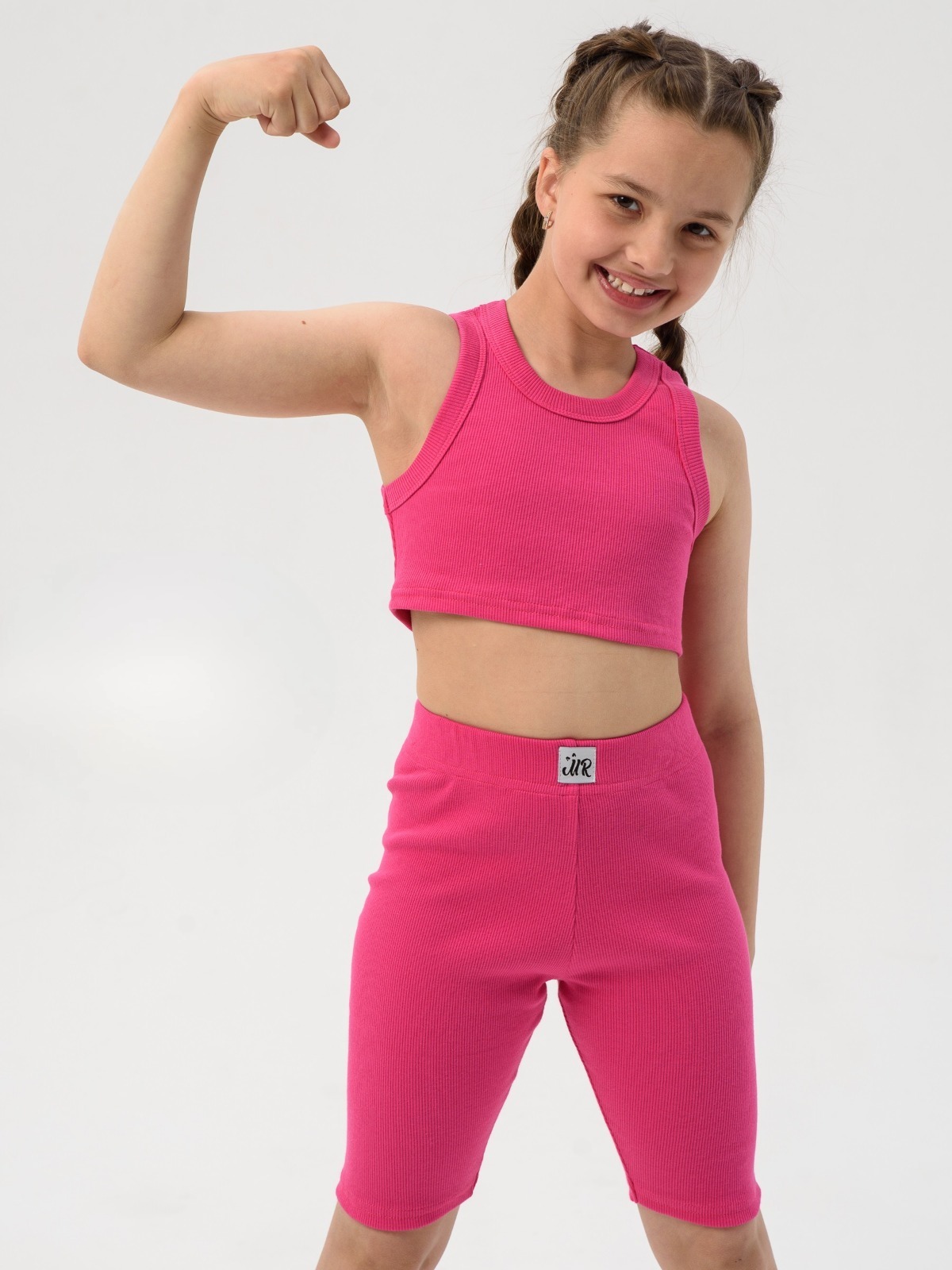 Детский костюм "Люси" / Малиновый для девочки представляет собой комплект двойку, состоящий из топа и велосипедок. Спортивный костюм для девочки отшивается из натуральной хлопковой ткани с добавлением лайкры.