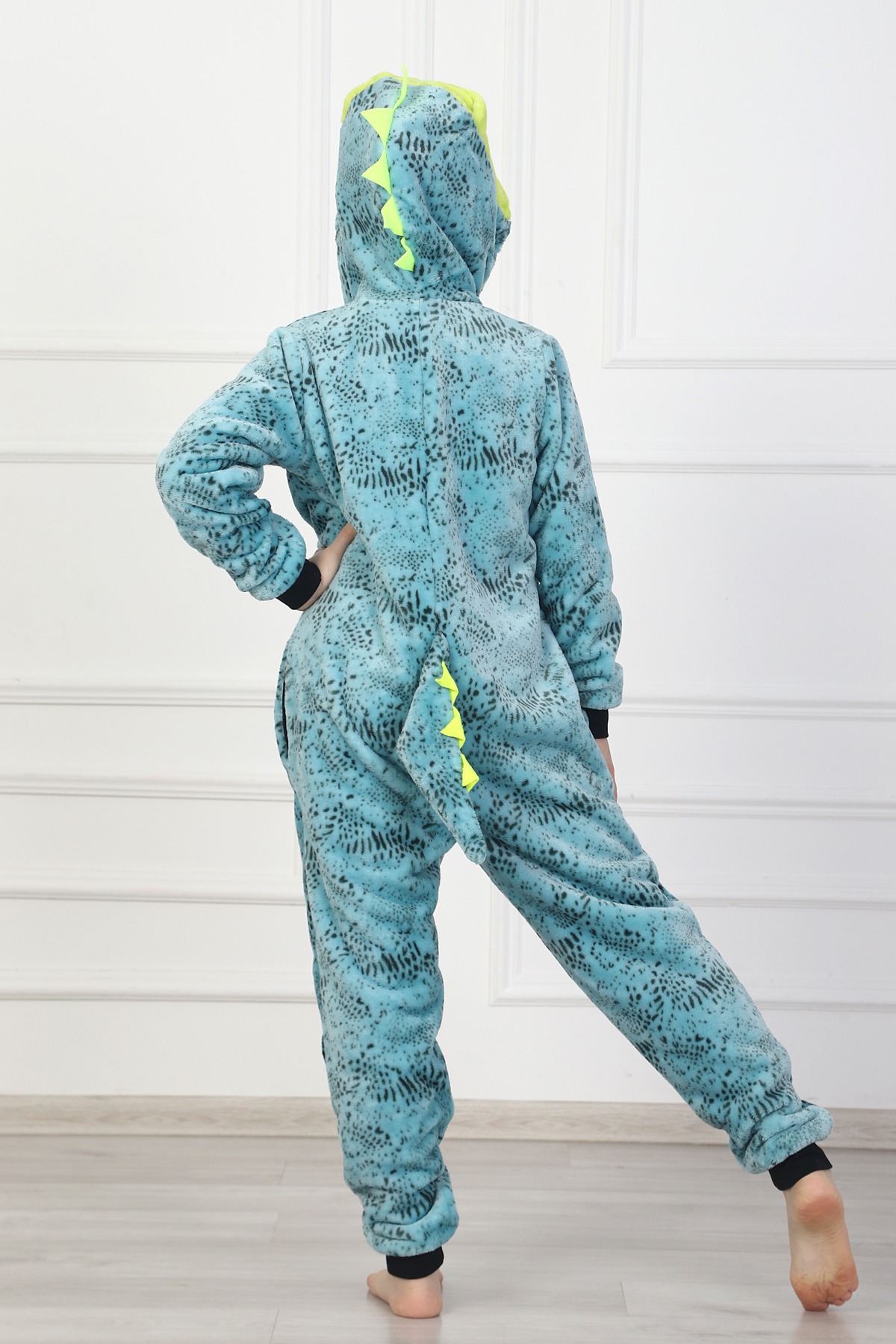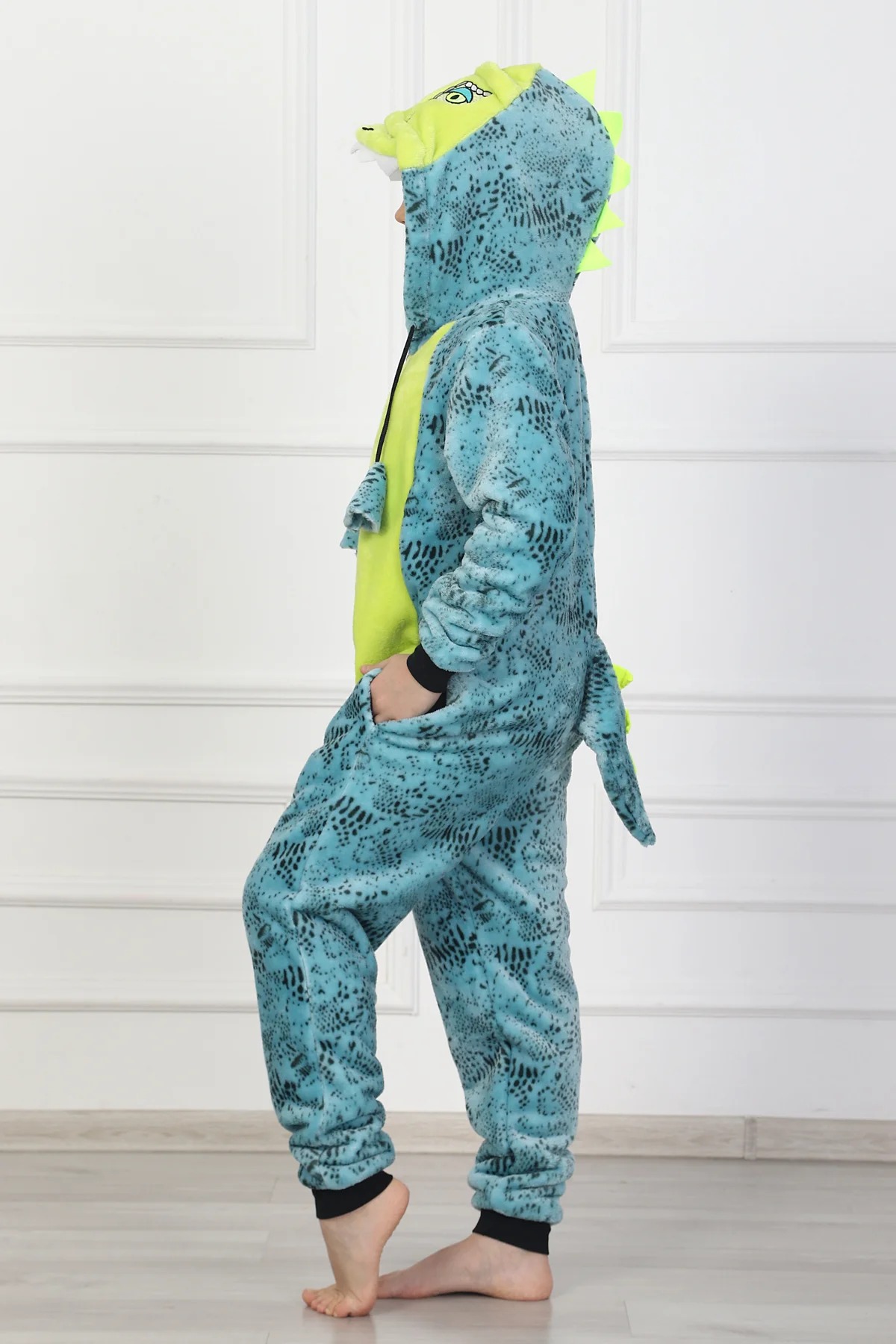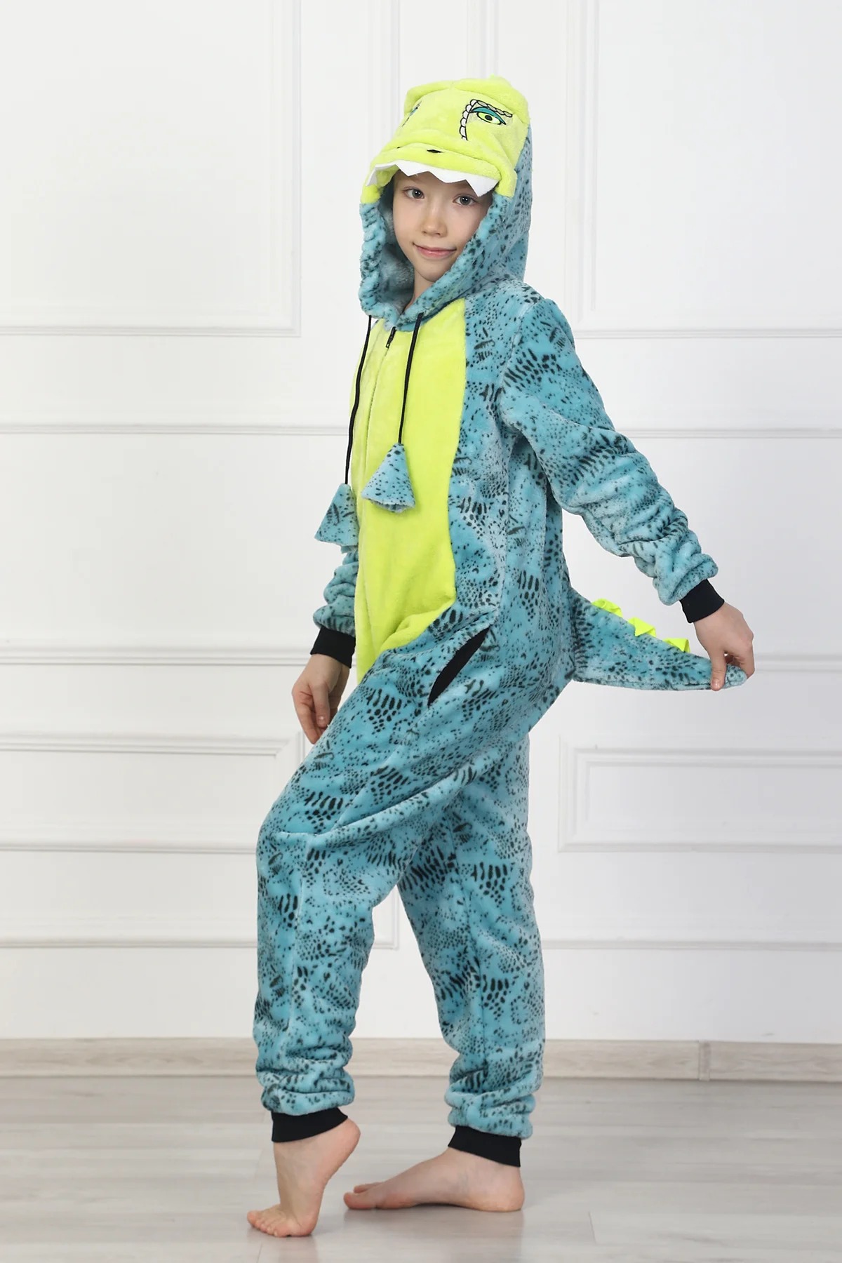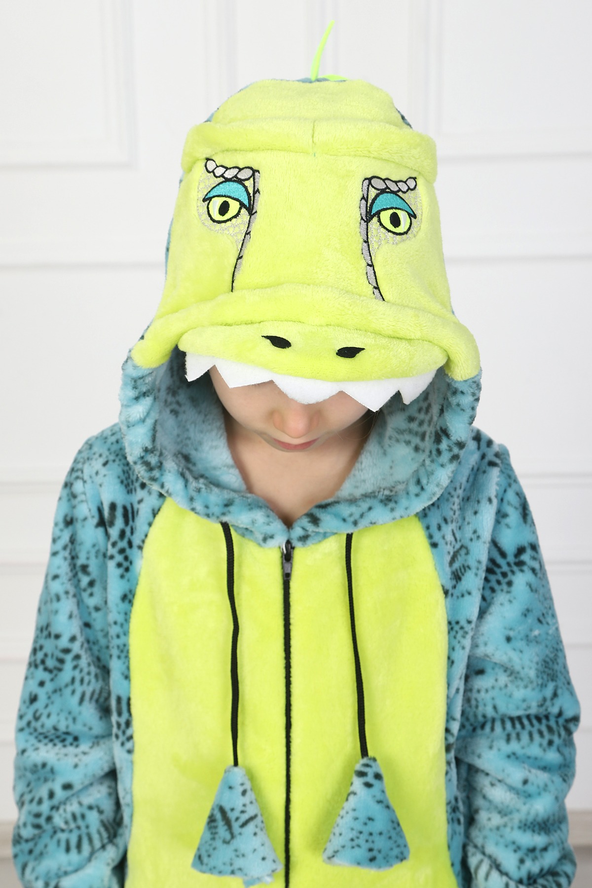 Комбинезон детский на молнии "Rex" 1536-Эф/Р, с подкладкой в верхней части изделия, с капюшоном, стилизованный в виде животного – динозавра (тиранозавра), двумя боковыми карманами в швах. Рукава втачные на манжете, на полочке вставка, имитирующая манишку. На капюшоне тематическая вышивка. Манишка выполнена из отделочной ткани, манжеты – из отделочной рибаны.