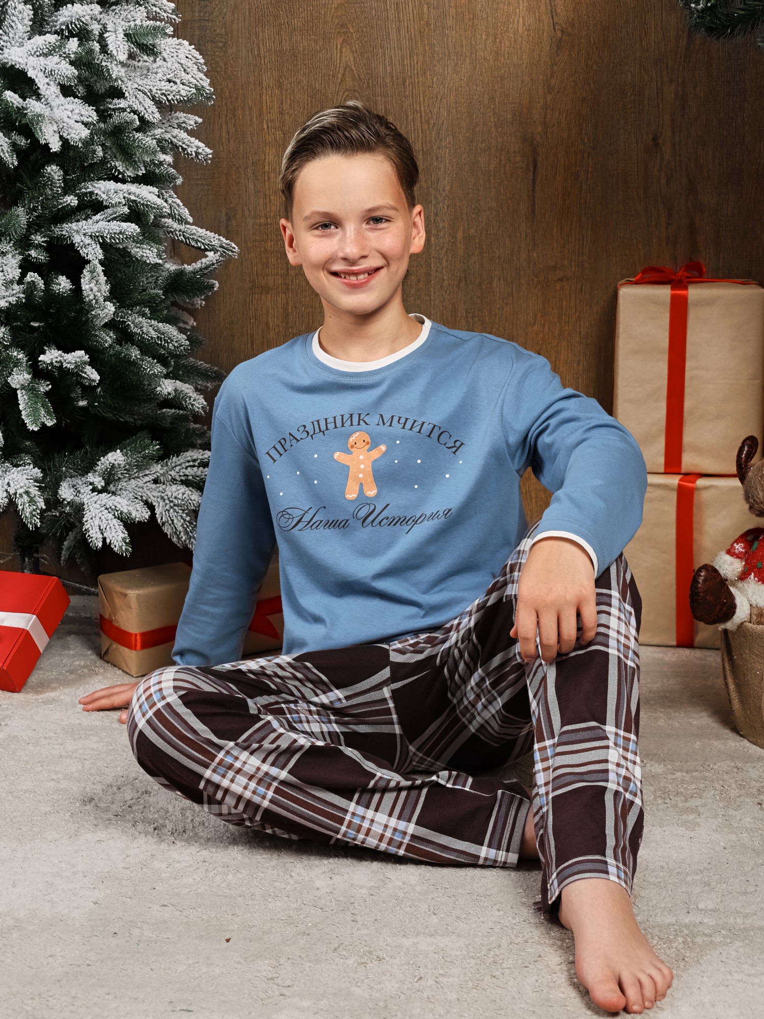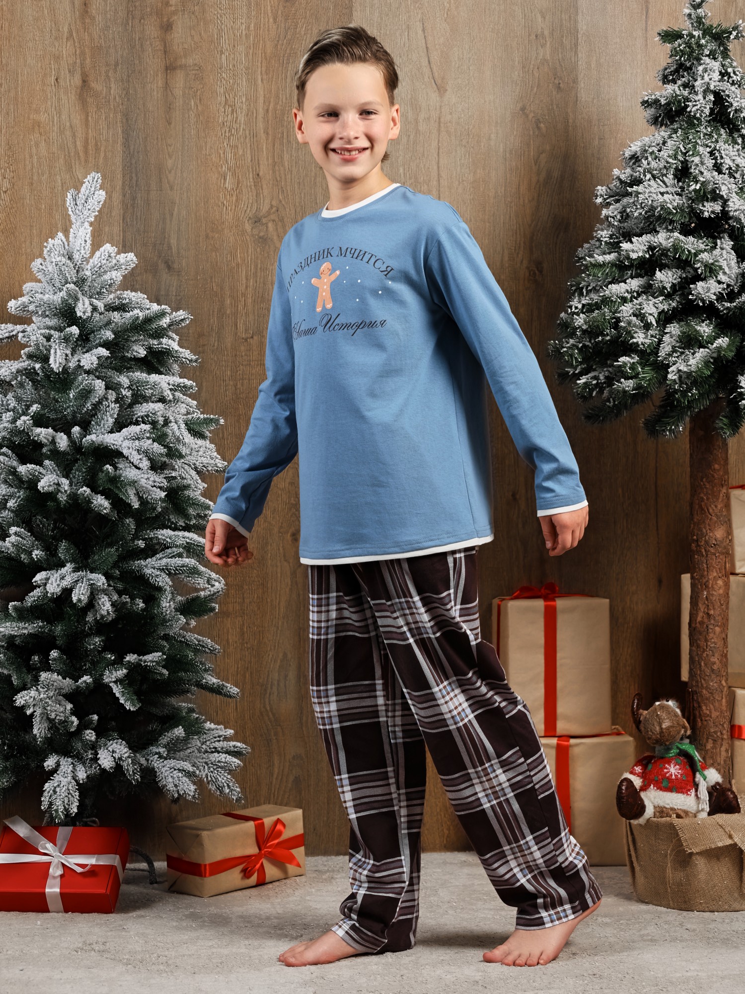 Костюм для мальчика из трикотажного полотна "кулирка" в комбинации двух видов: гладкокрашенного и с рисунком в крупную клетку, сочетающихся между собой по цвету, состоящий из джемпера и брюк. Джемпер - из гладкокрашеного полотна, свободного покроя, с длинными втачными рукавами и приспущенными плечами, с горловиной овальной формы и тематическим принтом, выполненным в технике шелкографии. Горловина, нижние срезы рукавов и низ изделия обработаны подгибкой с отделочным широким кантом контрастного цвета. Брюки - из полотна в клетку, свободного покроя, прямые, на притачном поясе с эластичной тесьмой внутри, с карманами в боковых швах. Нижние срезы обработаны подгибкой.