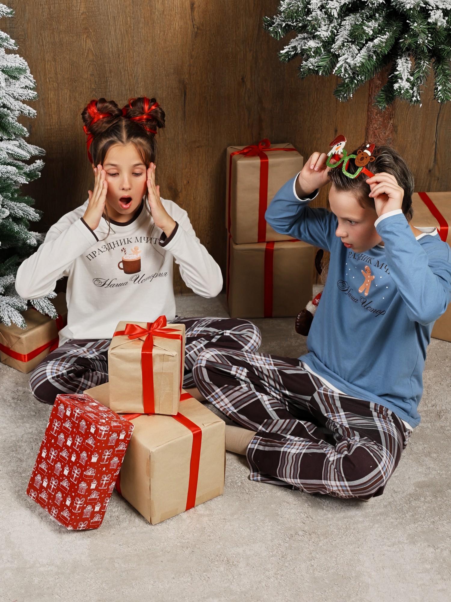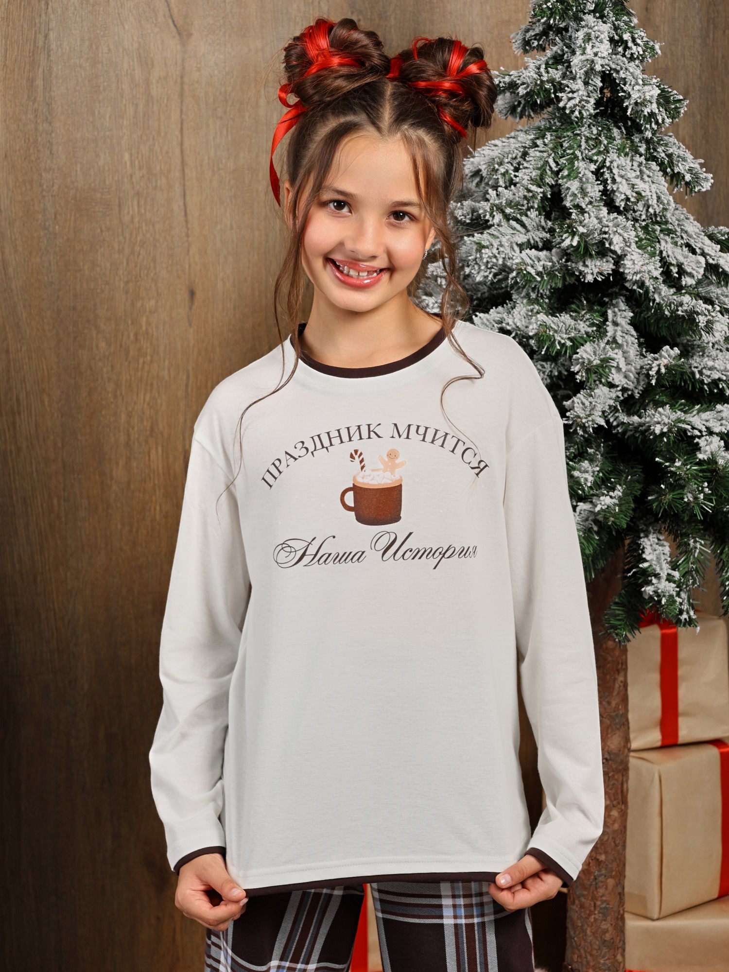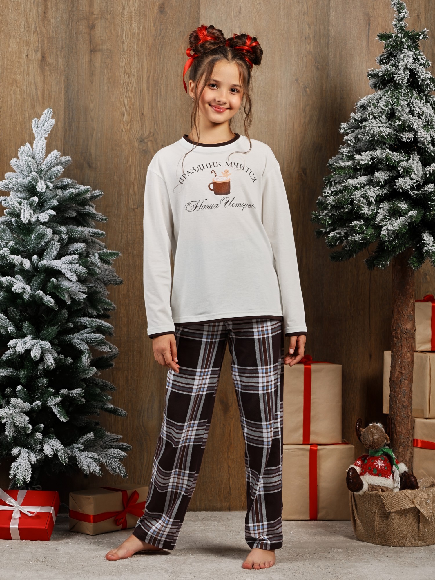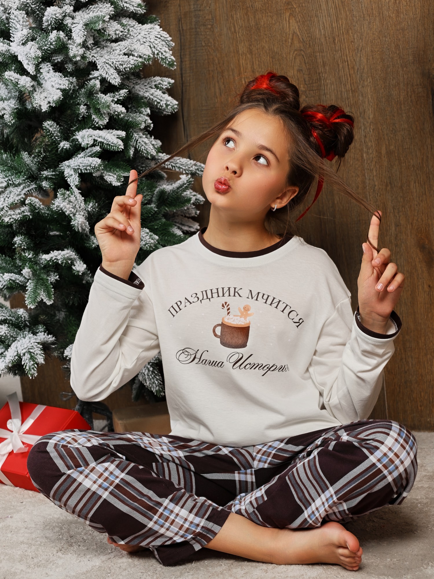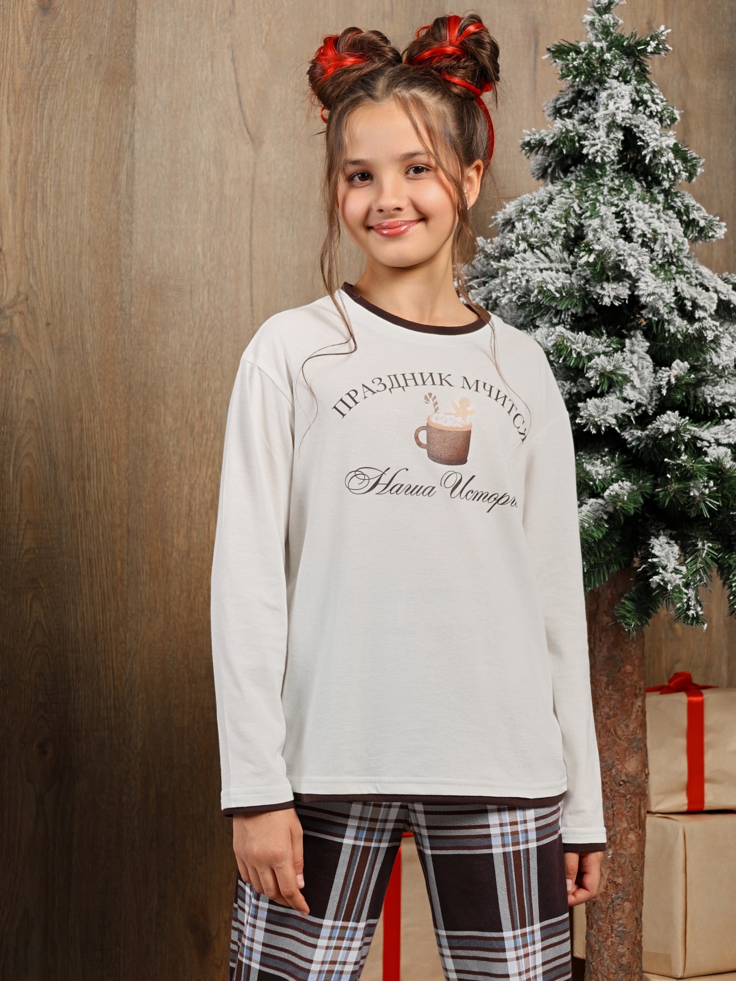 Костюм для девочки из трикотажного полотна "кулирка" в комбинации двух видов: гладкокрашенного и с рисунком в крупную клетку, сочетающихся между собой по цвету, состоящий из джемпера и брюк. Джемпер - из гладкокрашеного полотна, свободного покроя, с длинными втачными рукавами и приспущенными плечами, с горловиной овальной формы и тематическим принтом, выполненным в технике шелкографии. Горловина, нижние срезы рукавов и низ изделия обработаны подгибкой с отделочным широким кантом контрастного цвета. Брюки - из полотна в клетку, свободного покроя, прямые, на притачном поясе с эластичной тесьмой внутри, с карманами в боковых швах. Нижние срезы обработаны подгибкой.