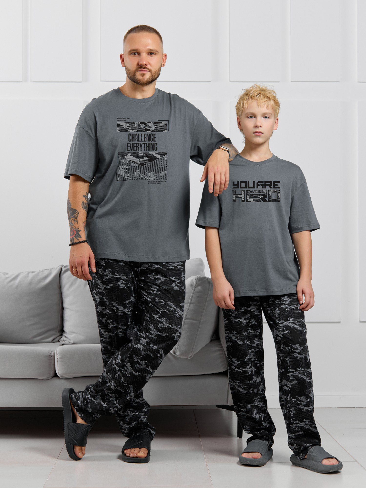 Костюмдля мальчика, состоящий из футболки и брюк. Футболка однотонная с принтом на груди; модель свободная, со спущенной линией плеч, овальным вырезом горловины. Брюки из полотна с набивным рисунком эксклюзивного дизайна, прямые, с боковыми карманами с обтачными входами, на притачном поясе с отстроченной эластичной тесьмой.