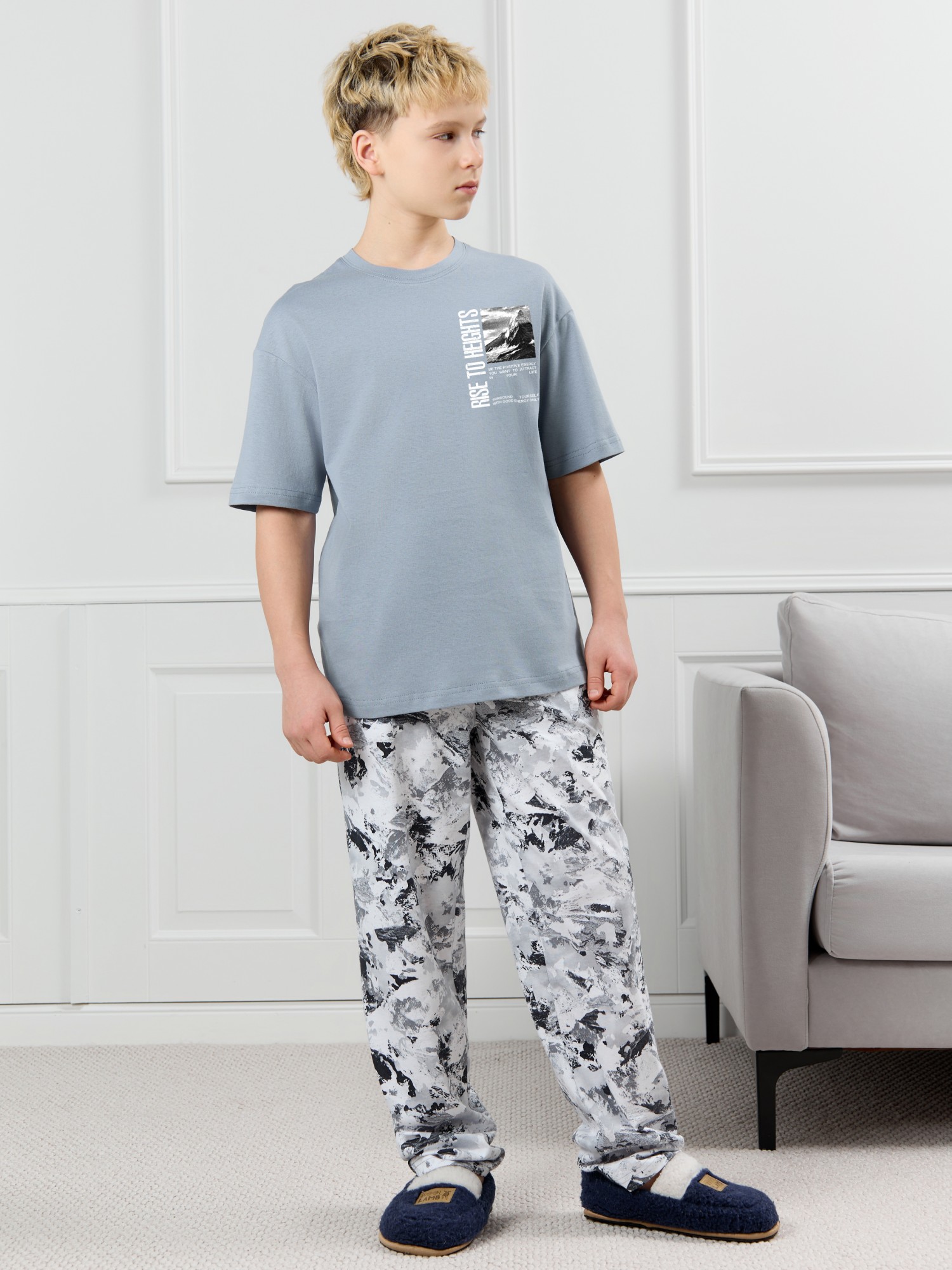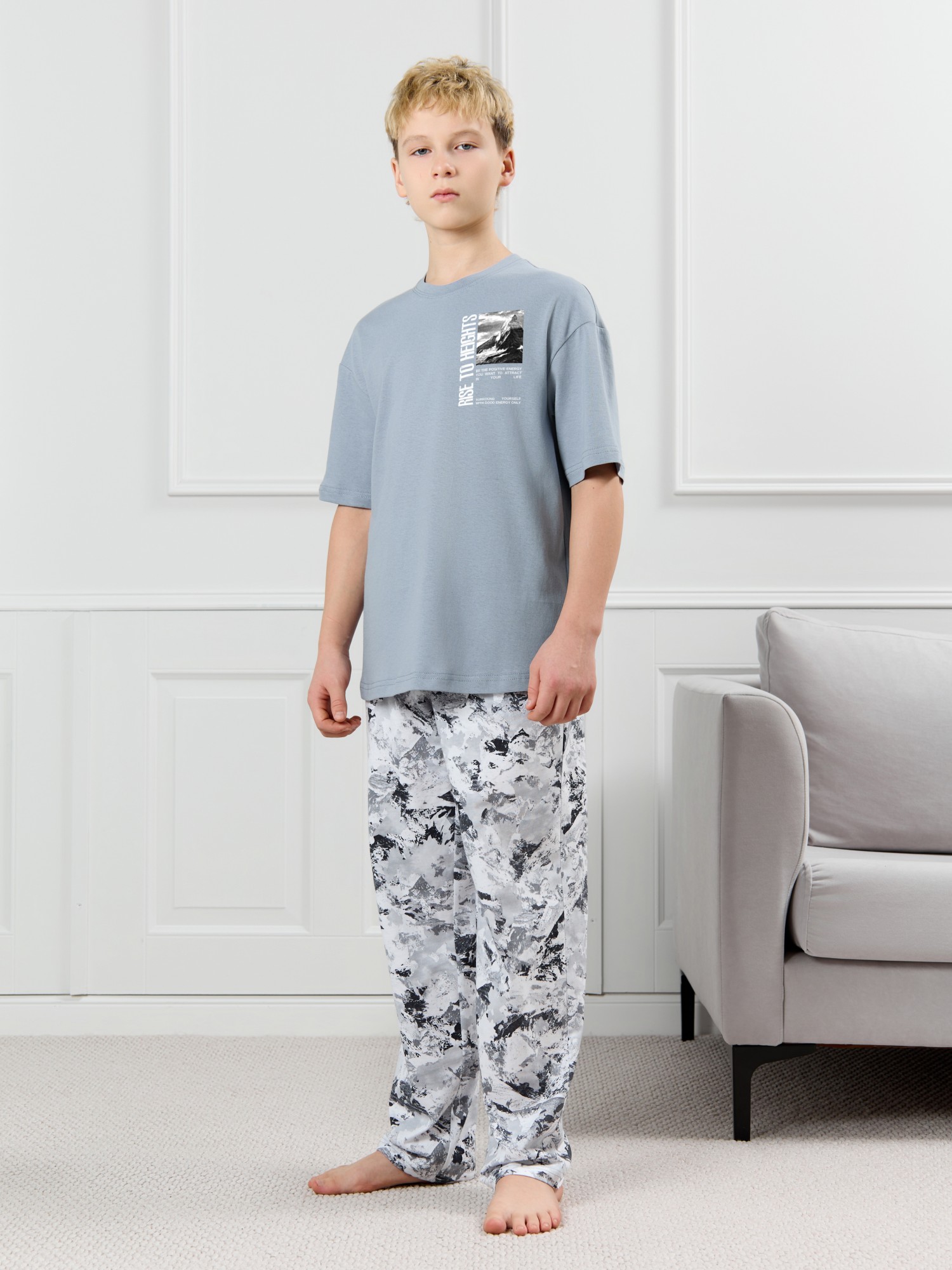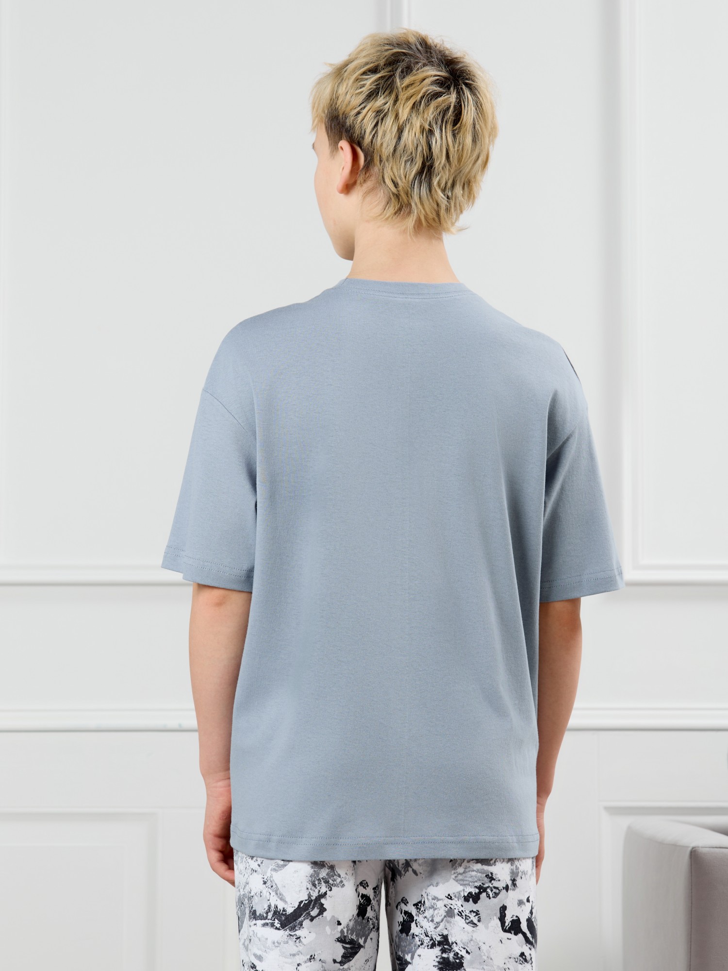 Костюм для мальчика, состоящий из футболки и брюк. Футболка однотонная с принтом на груди; модель свободная, со спущенной линией плеч, овальным вырезом горловины. Брюки из полотна с набивным рисунком эксклюзивного дизайна, прямые, с боковыми карманами с обтачными входами, на притачном поясе с отстроченной эластичной тесьмой.