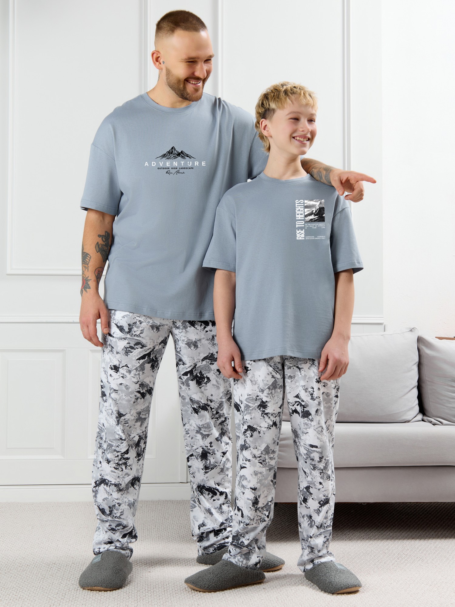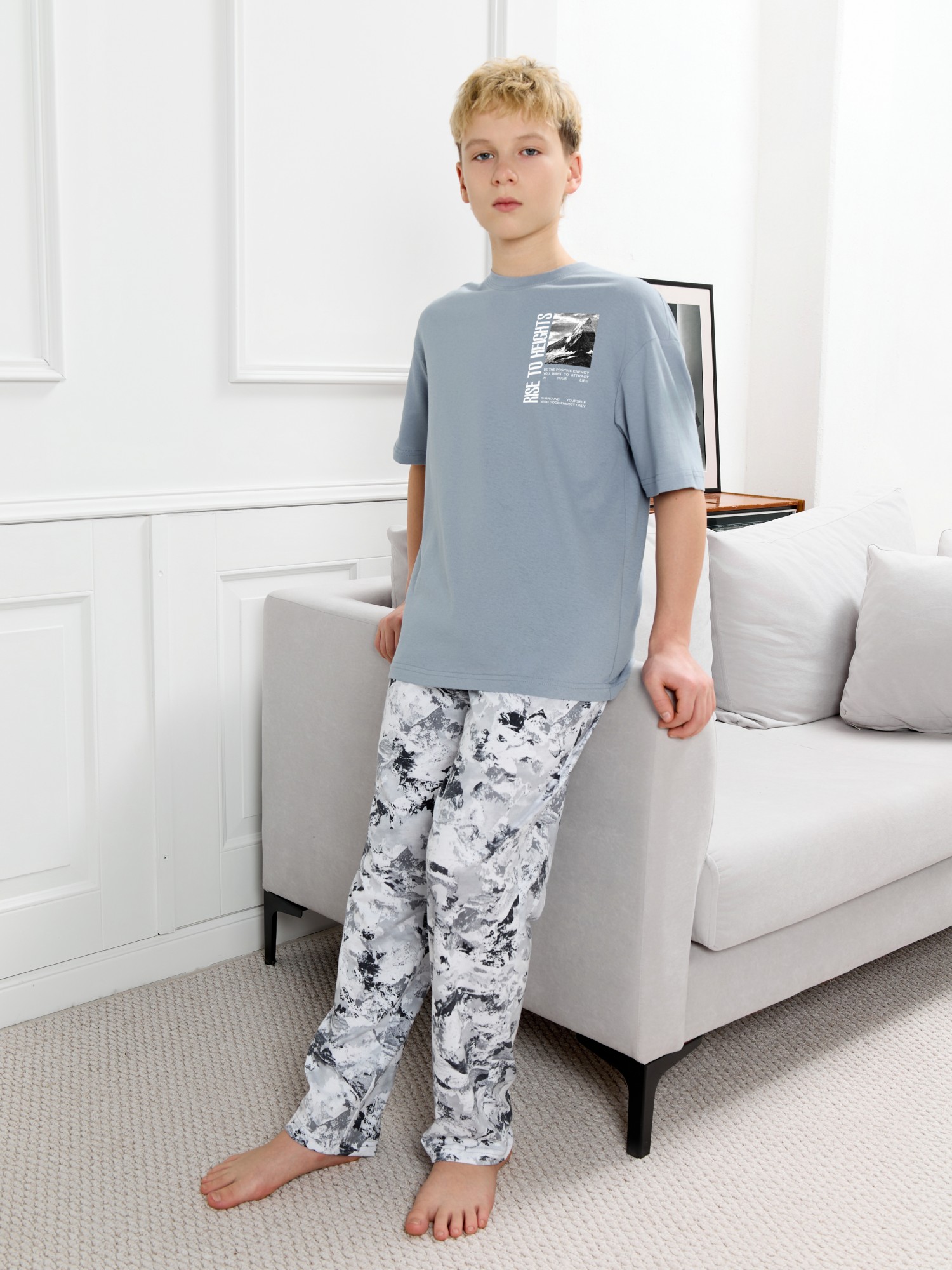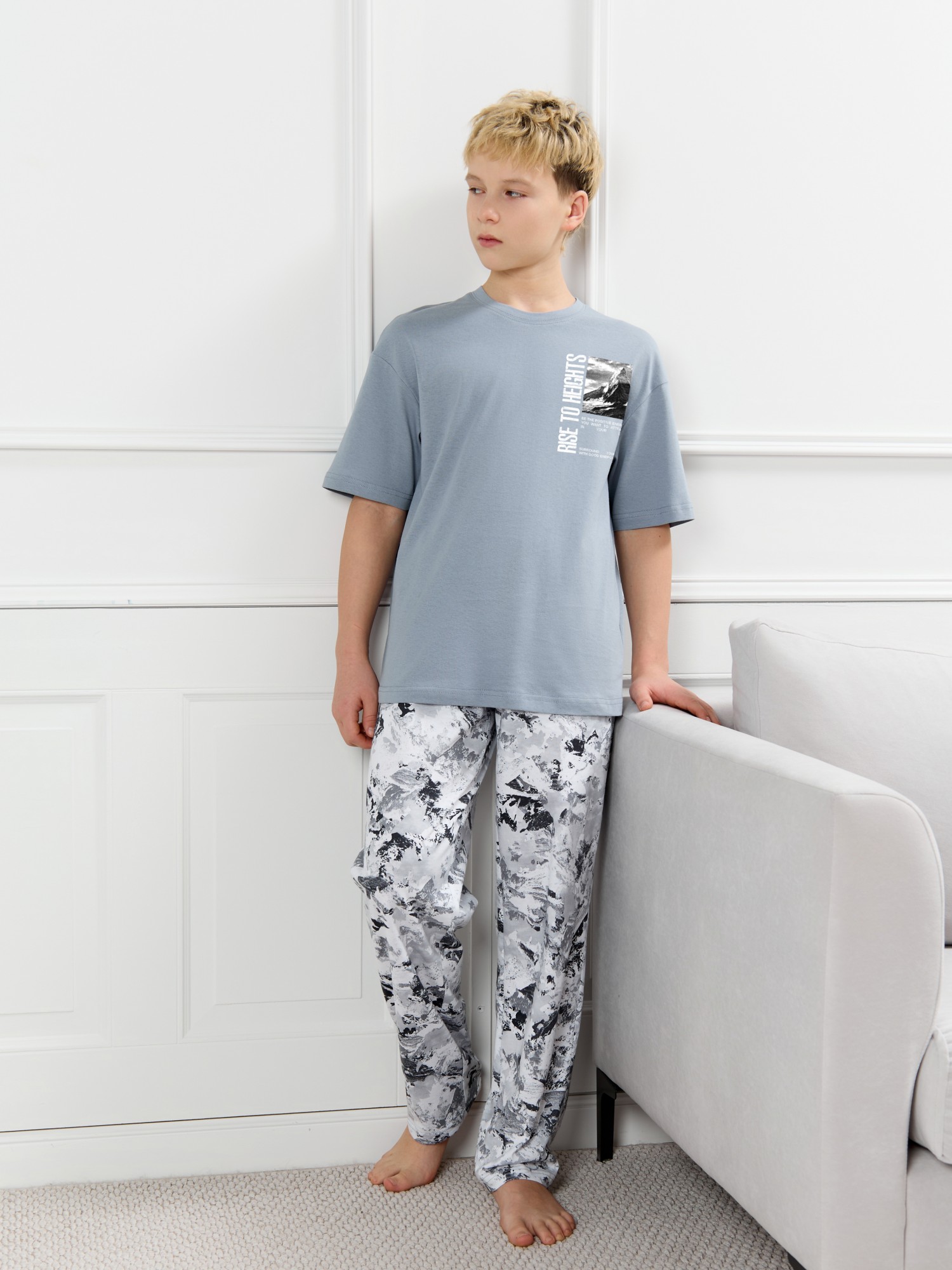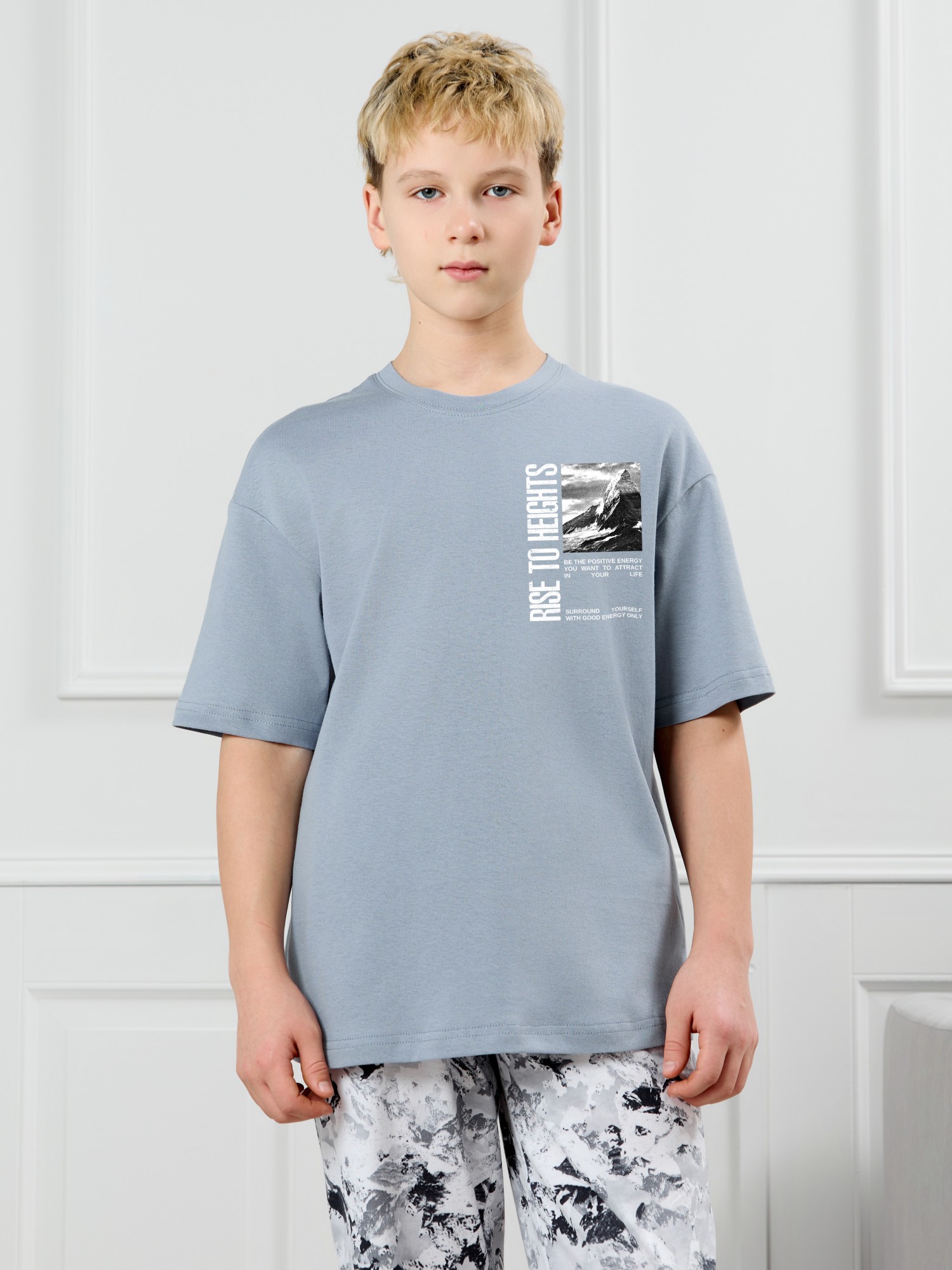 Костюм для мальчика, состоящий из футболки и брюк. Футболка однотонная с принтом на груди; модель свободная, со спущенной линией плеч, овальным вырезом горловины. Брюки из полотна с набивным рисунком эксклюзивного дизайна, прямые, с боковыми карманами с обтачными входами, на притачном поясе с отстроченной эластичной тесьмой.