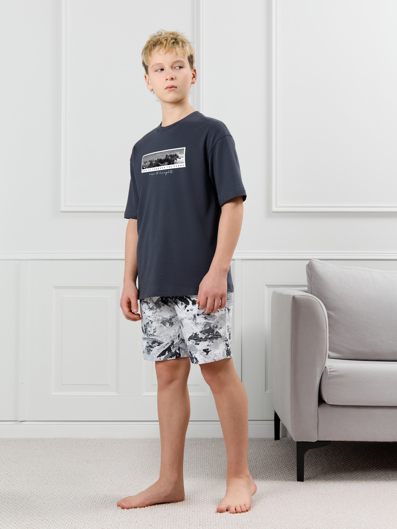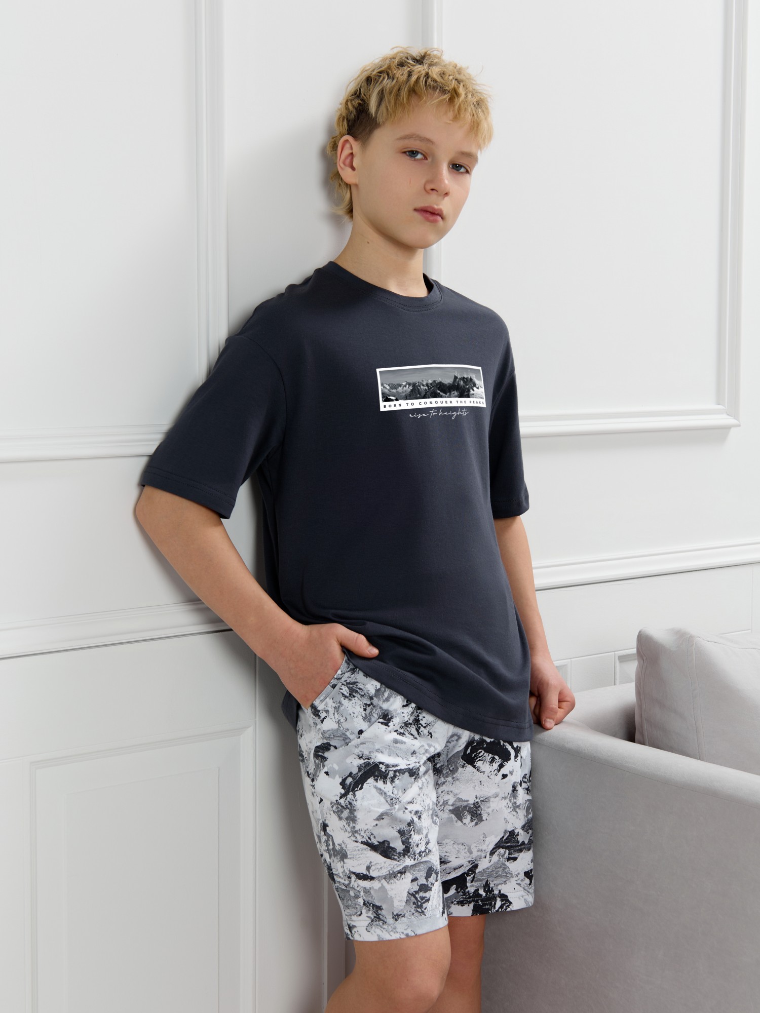 Костюм для мальчика, состоящий из футболки и шорт. Футболка однотонная с принтом на груди; модель свободная, со спущенной линией плеч, овальным вырезом горловины. Шорты из полотна с набивным рисунком эксклюзивного дизайна, с боковыми карманами с обтачными входами, на притачном поясе с отстроченной эластичной тесьмой.