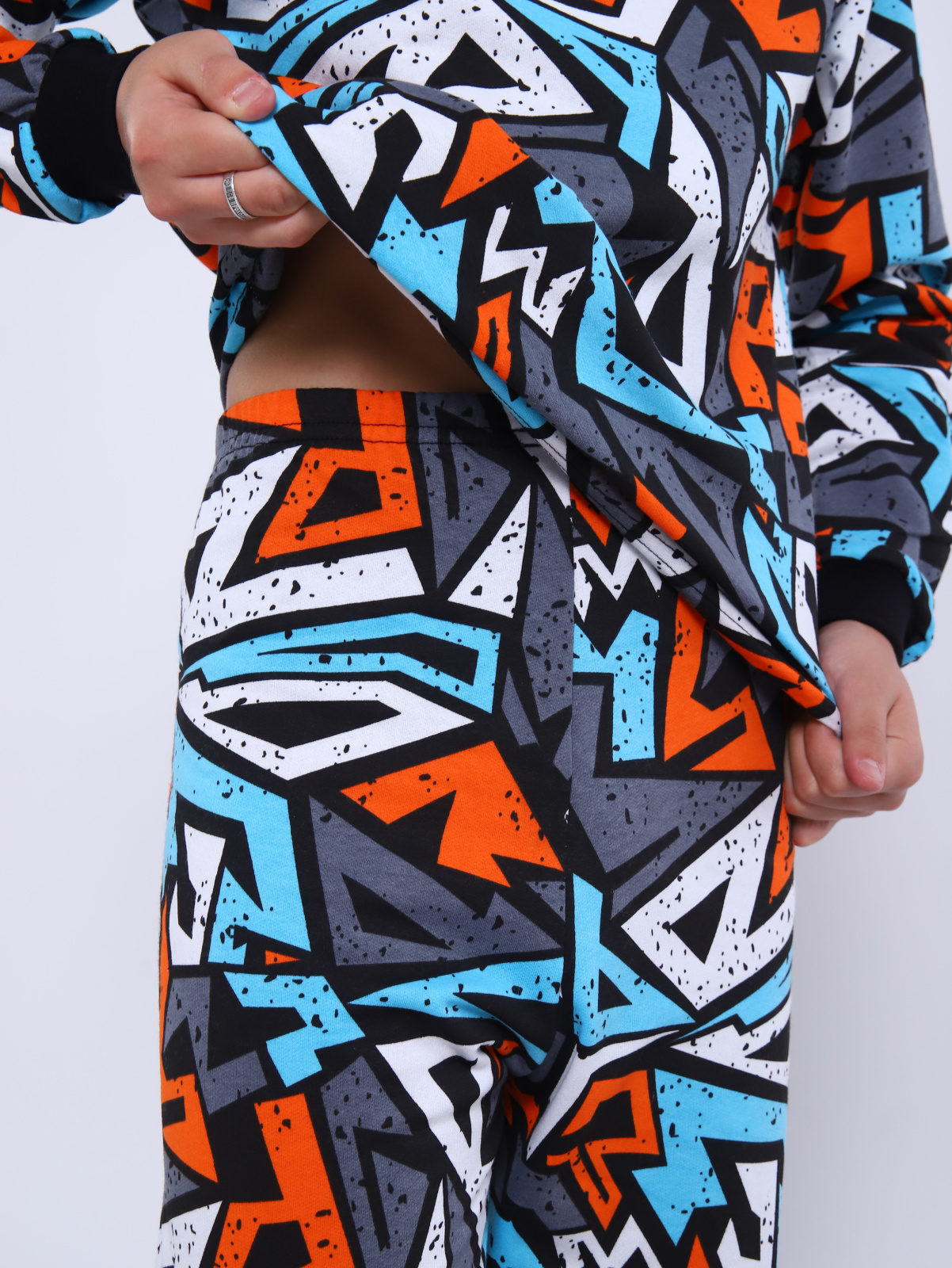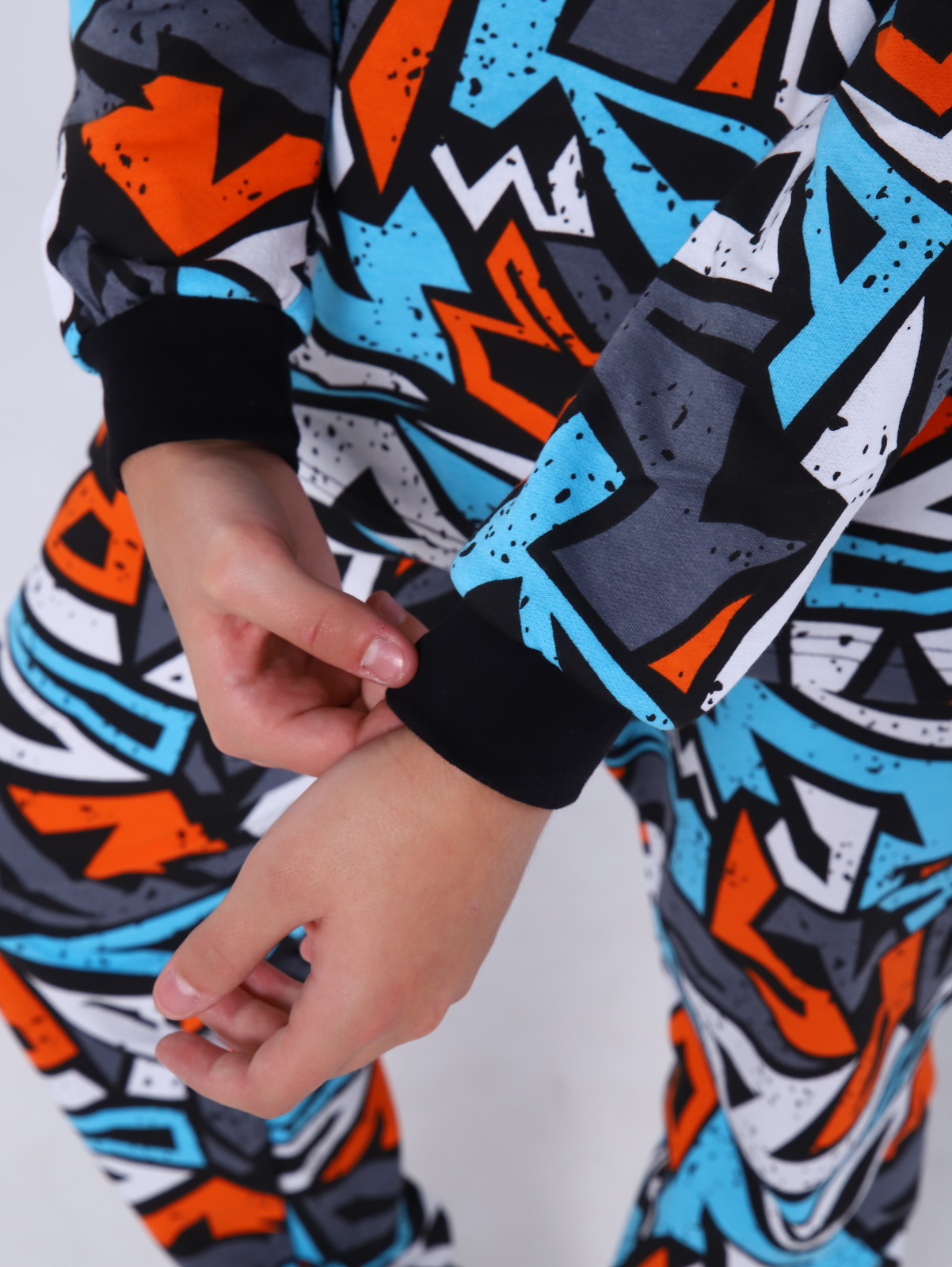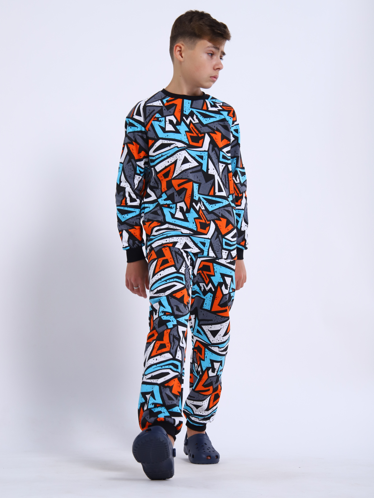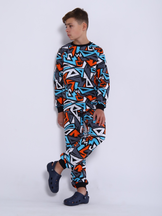 Яркая пижама для мальчика и девочки подростка из теплого трикотажа с принтом. Состоит комплект домашней одежды из кофты с округлой горловиной и рукавами-реглан и брюки с эластичным поясом и манжетами по низу.