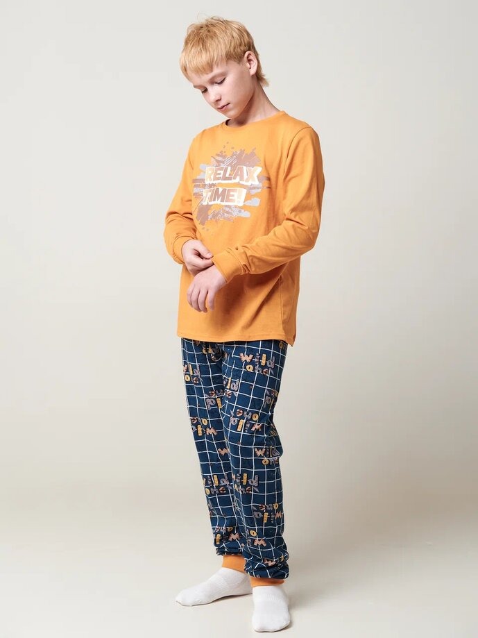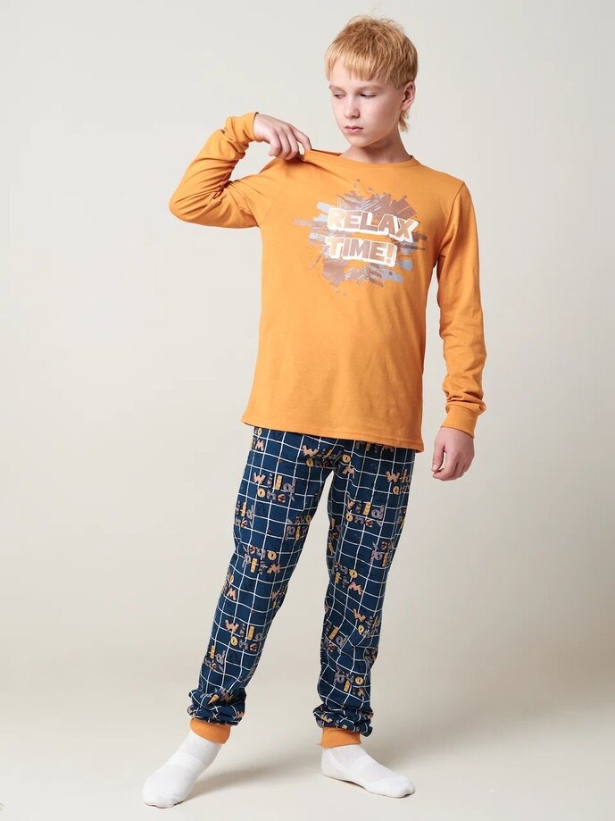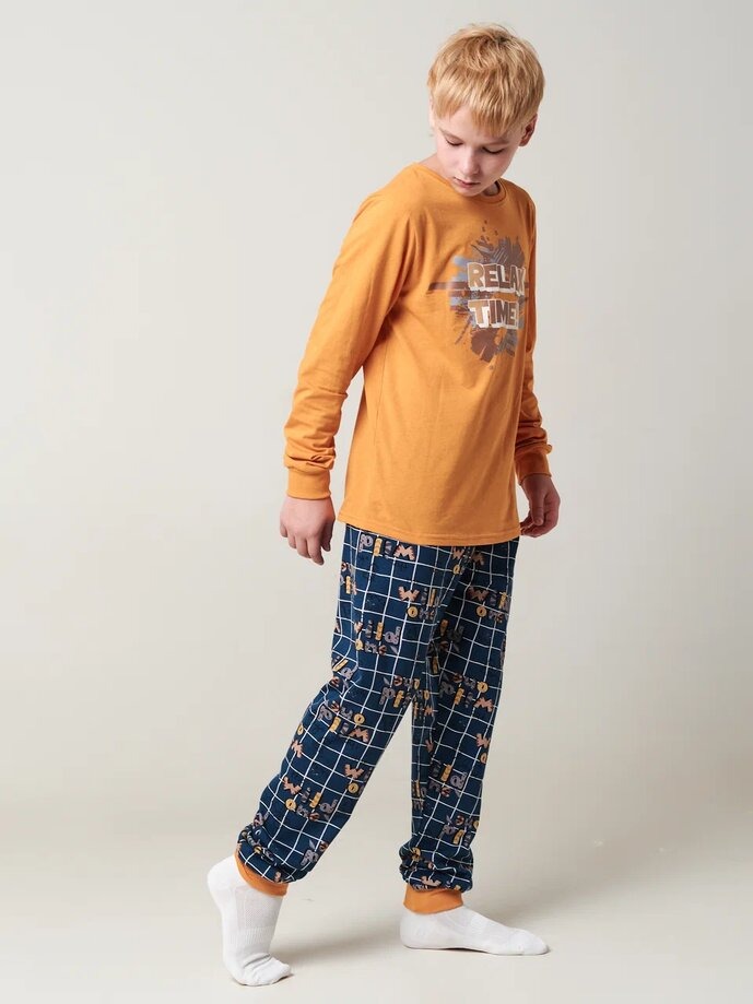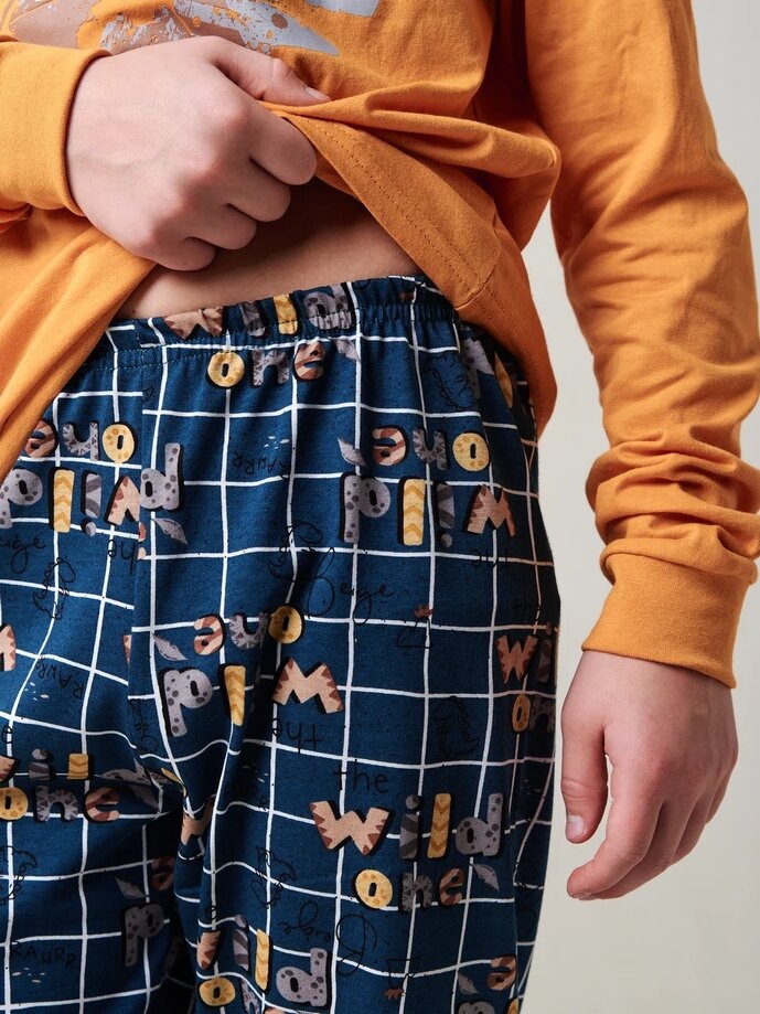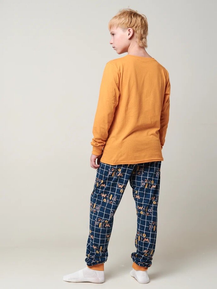 Пижама детская "Дрема" для мальчика с принтом - это удобный домашний комплект свободного кроя для детей и подростков. Домашний костюм для мальчика без карманов выполнен из мягкого, легкого и комфортного трикотажа средней плотности, не сковывает движений. Хлопковая пижама подойдет для сна, в садик, одежды для дома и игр с друзьями. Манжеты надежно фиксируются и не позволяют сползать, что придаёт дополнительное удобство при носке пижамы. Брюки выполнены на резинке, мягко и приятно прилегают к телу, не давит на живот и не вызывает дискомфорта. Футболка с длинными рукавами согреет ребенка в прохладные дни. Пижама обеспечивает комфортное телесное ощущение как в летний, так и в зимний период. Органический 100 % хлопок не вызывает раздражения на коже ребенка и впитывает влагу, выделяемую телом во время сна. Пижамный костюм не садится после стирки, не линяет и не теряет яркости красок.