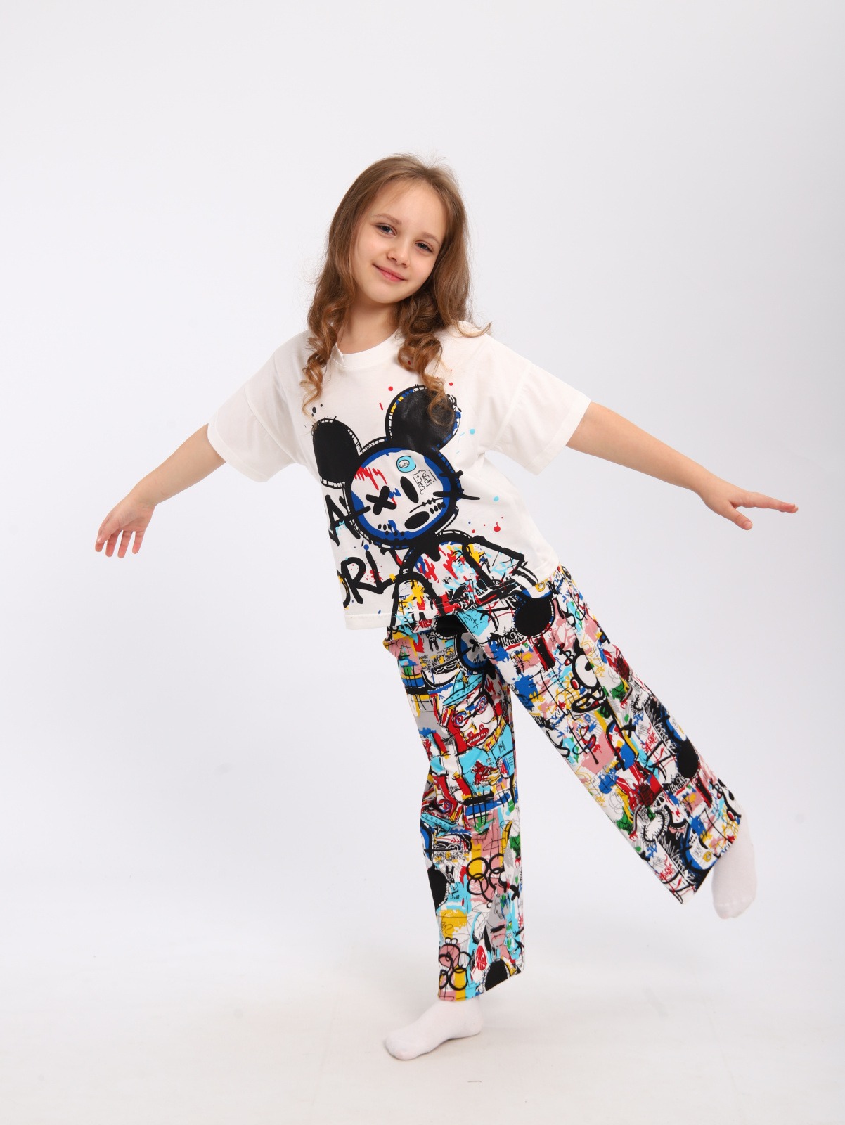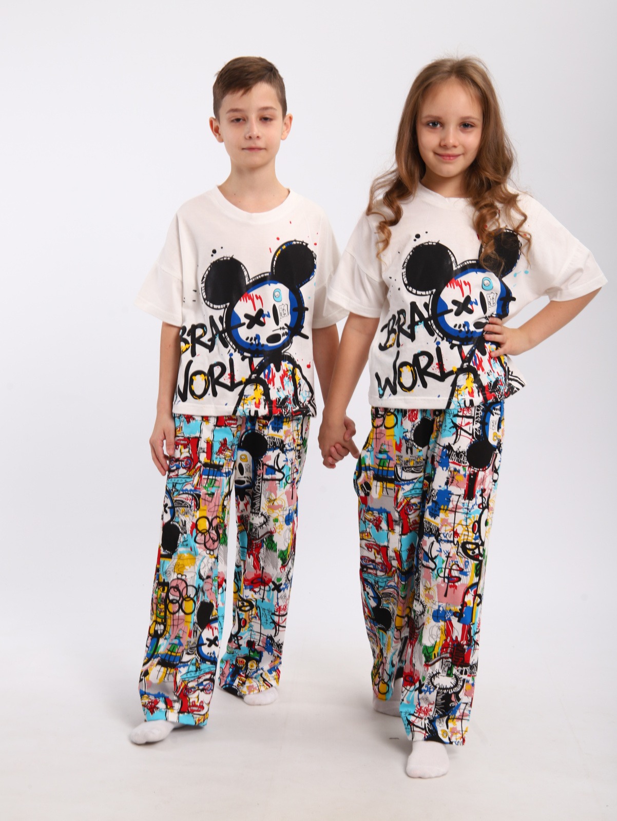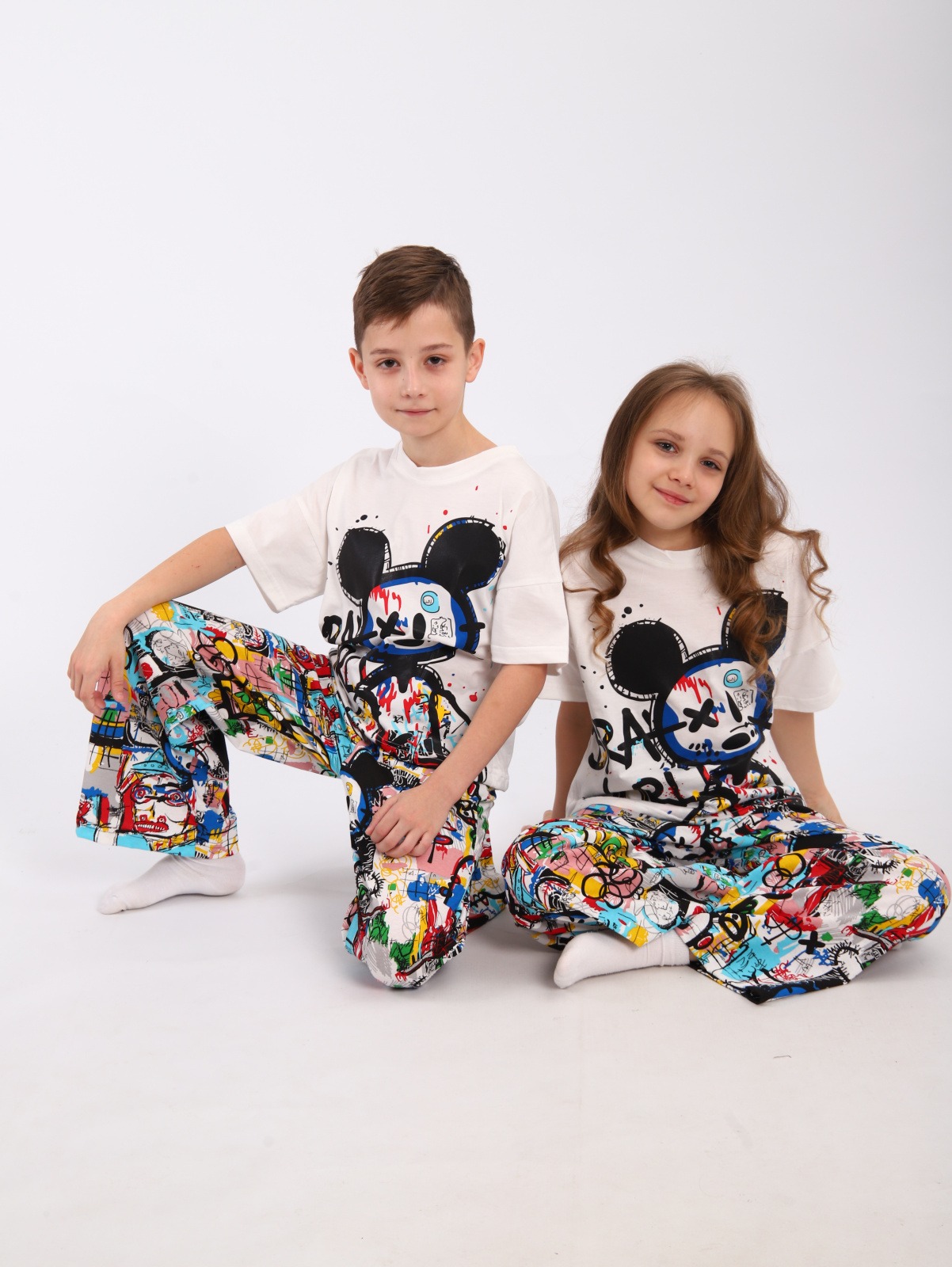 Эта очаровательная детская пижама Гранд станет любимой домашней одеждой, как для девочки, так и для мальчика, создавая атмосферу комфорта и уюта. Свободный крой оверсайз футболки и широкие брюки-палаццо на резинке подарят максимальную свободу движений, а мягкий хлопковый трикотаж обеспечит приятные тактильные ощущения.