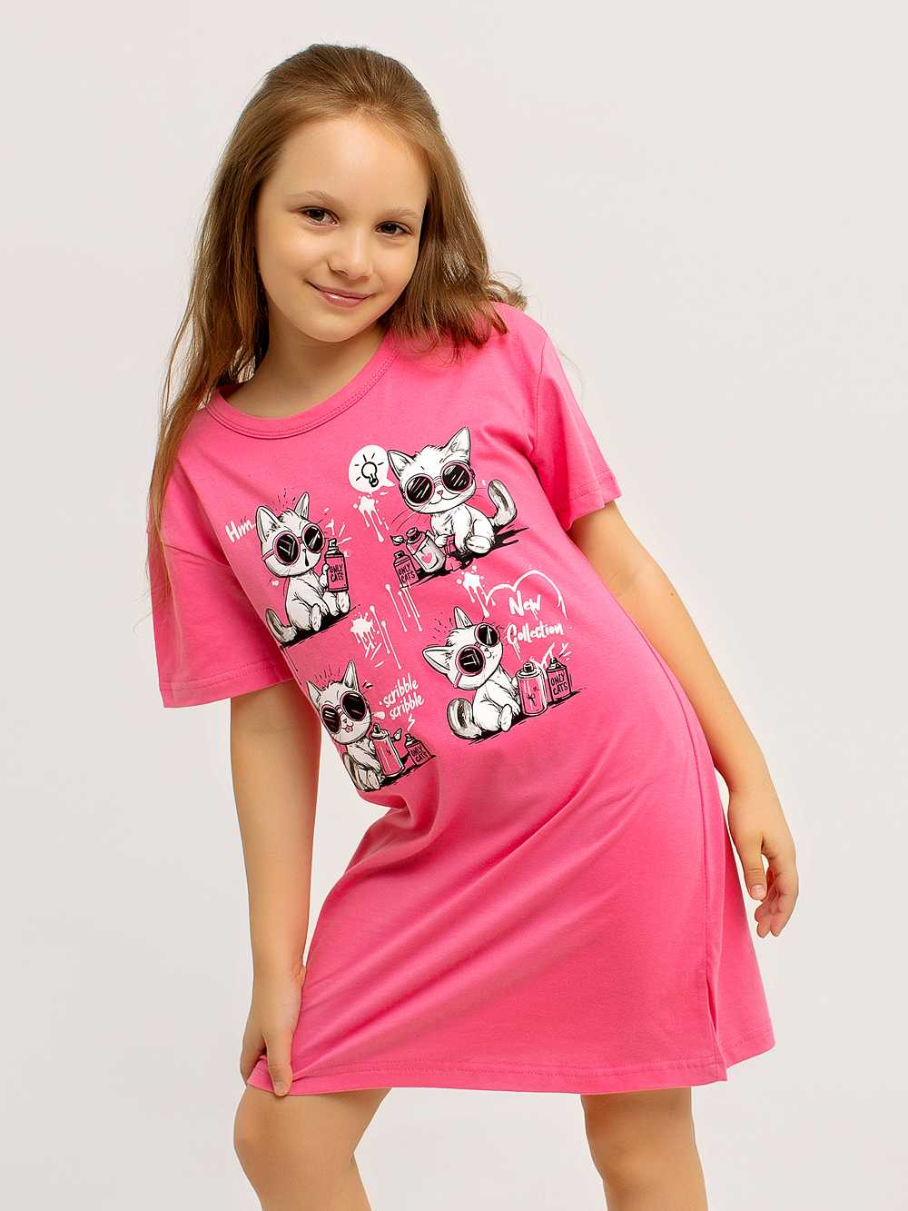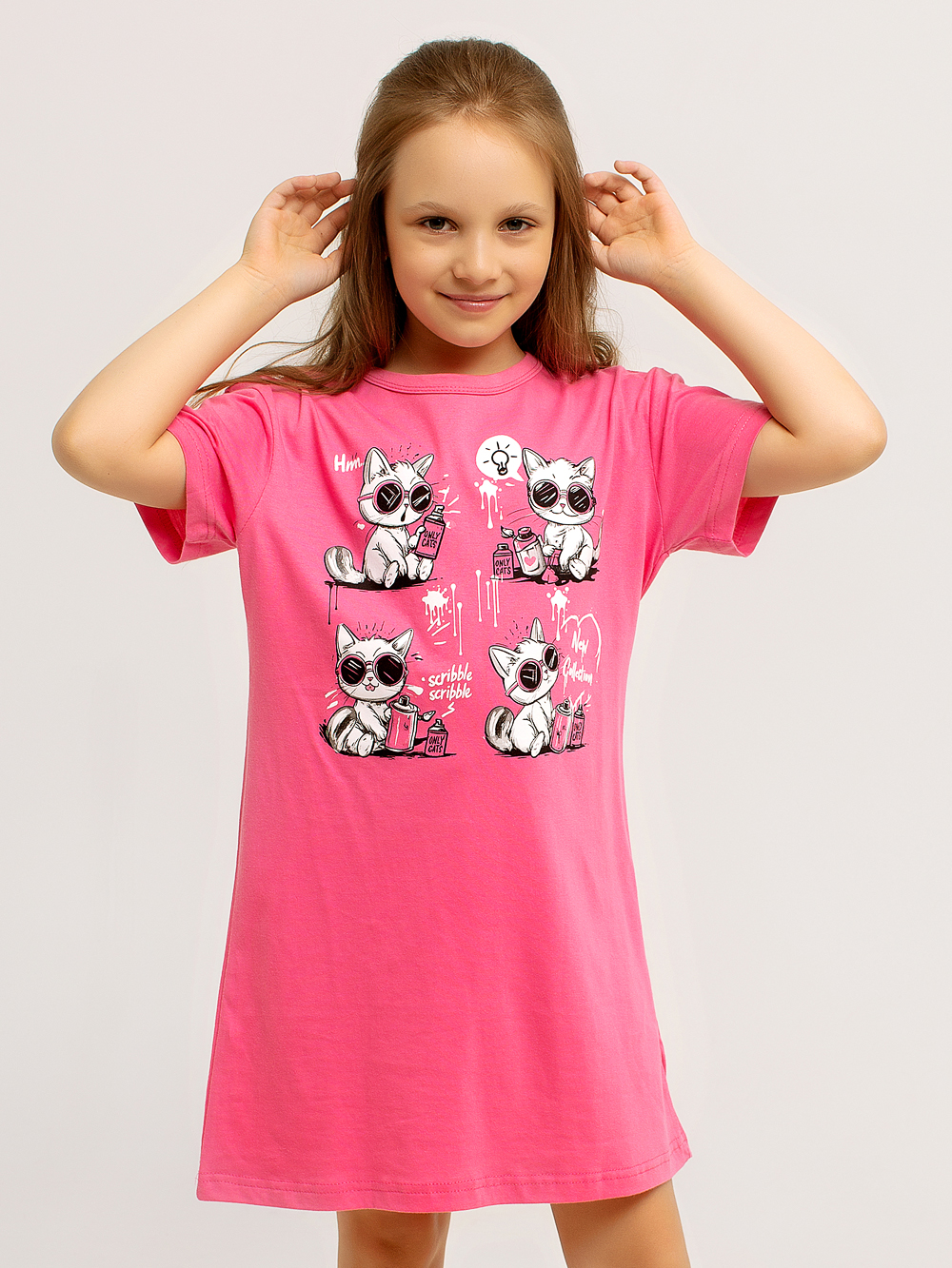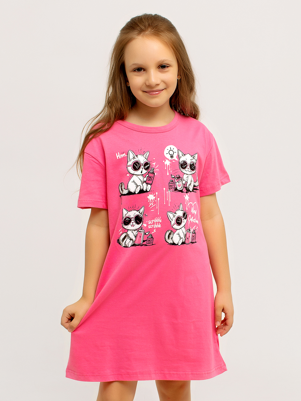 Платье-футболка оверсайз для девочки — универсальная и комфортная модель, которая легко заменяет и платье, и тунику, и домашнюю сорочку. Выполнена из 100% хлопка, мягкого и приятного к телу, подходящего для ежедневной носки дома, на прогулке или во сне.