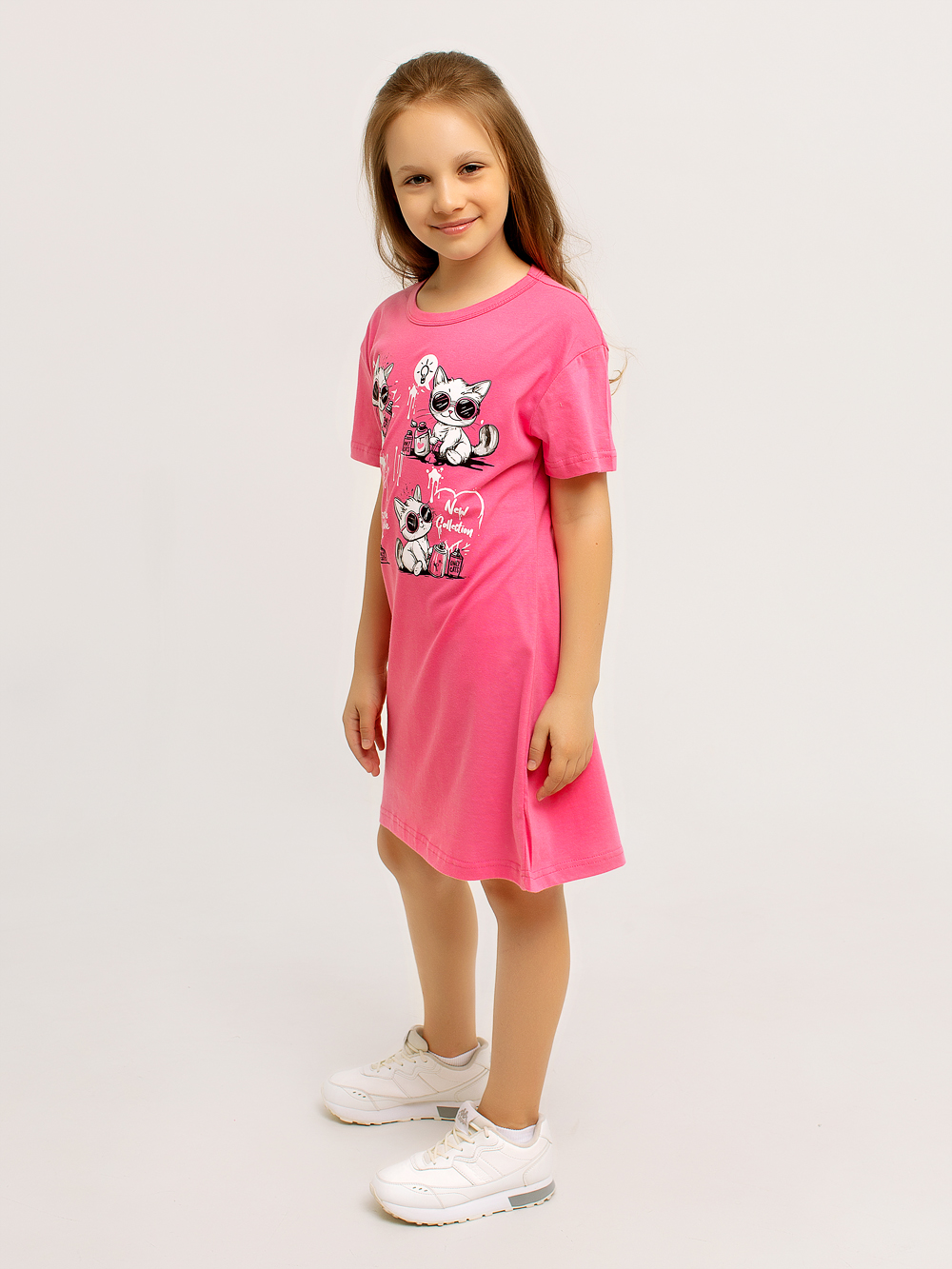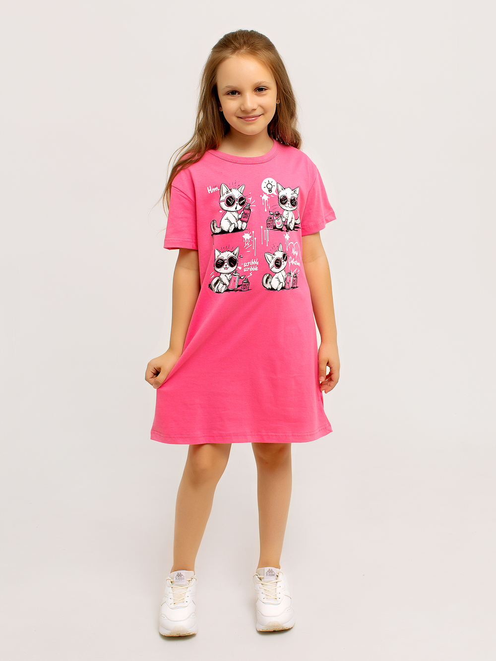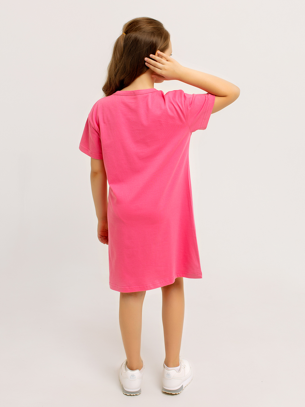 Платье-футболка оверсайз для девочки — универсальная и комфортная модель, которая легко заменяет и платье, и тунику, и домашнюю сорочку. Выполнена из 100% хлопка, мягкого и приятного к телу, подходящего для ежедневной носки дома, на прогулке или во сне.