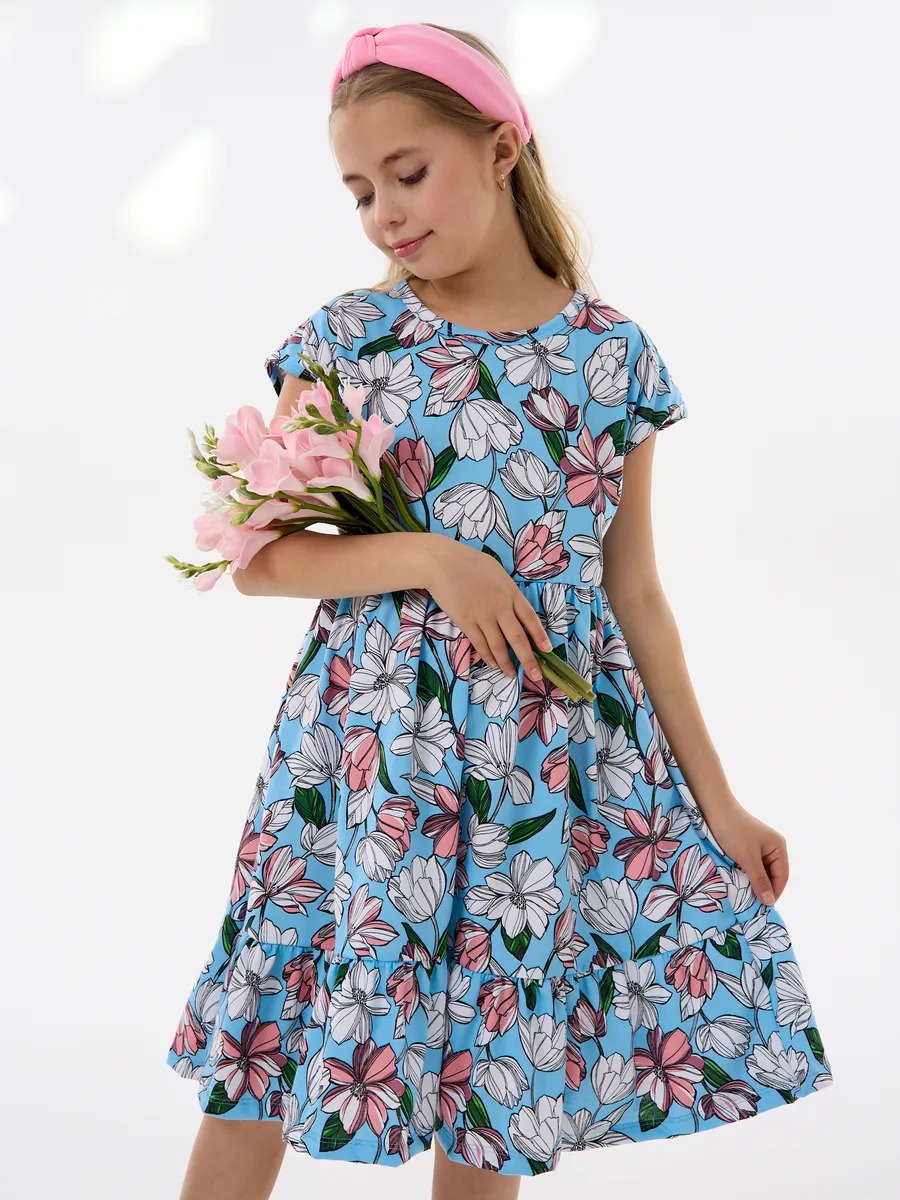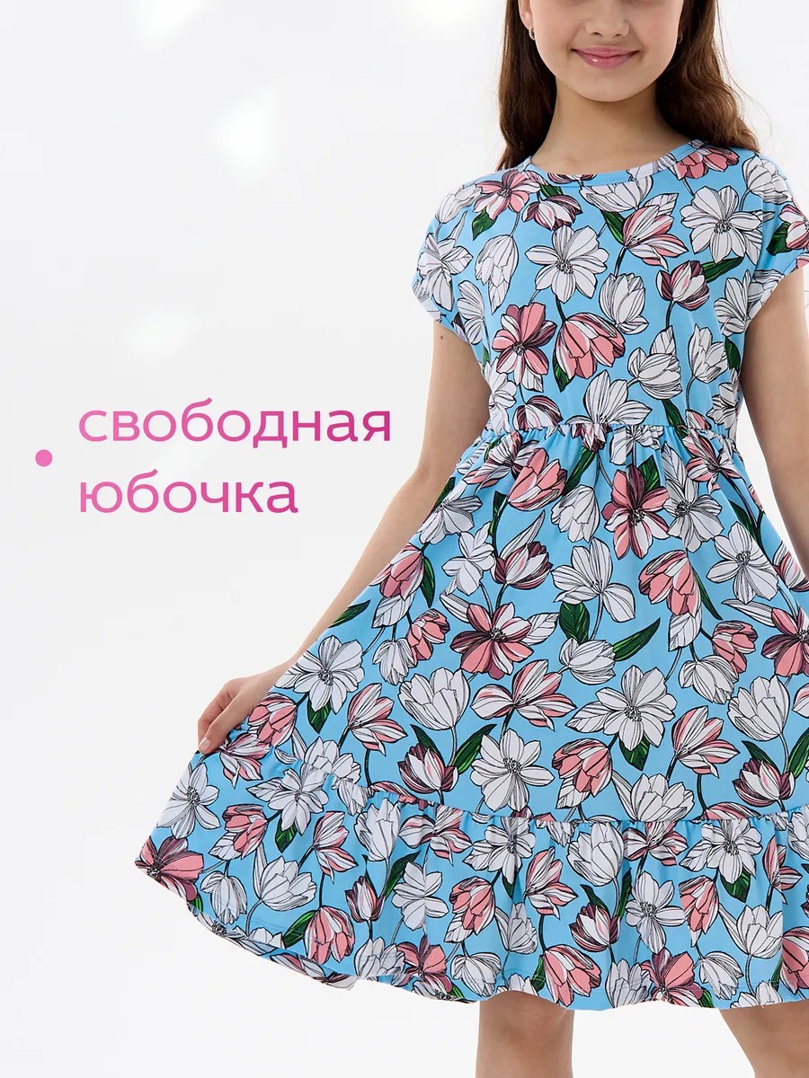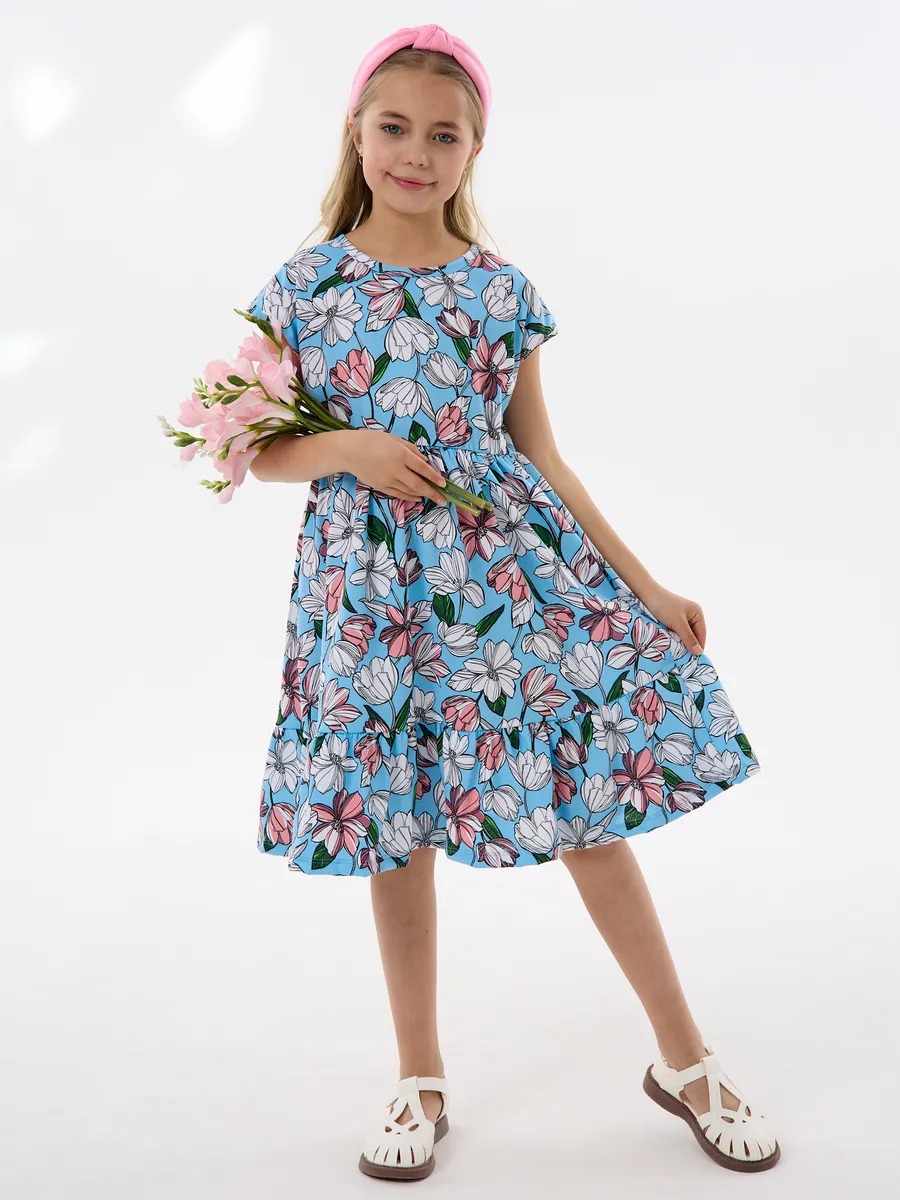 Платье легкое и удобное в носке, отлично подходит на лето для повседневных прогулок в теплую погоду, в детский садик или на праздник. Благодаря яркой расцветке, удобному крою и летящей юбке с оборкой оно выглядит просто и одновременно роскошно. Детское платье для девочки изготавливается из качественного 100% хлопка, будет удобно в носке и устойчивом к многочисленным стиркам. Платье нарядное имеет свободный покрой с завышенной талией на эластичной потайной резиночке, поэтому подходит как для стройных, так и на пухленьких девочек. У платья спущенный цельнокроеный рукав.