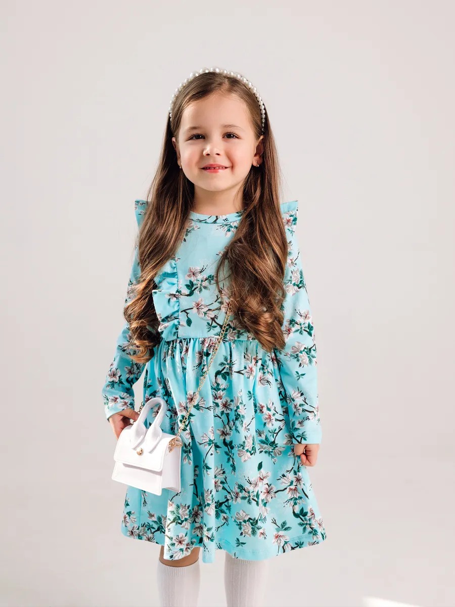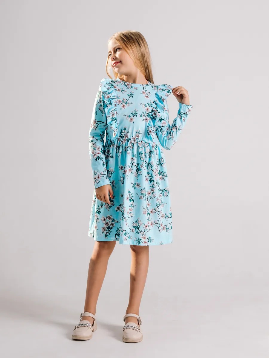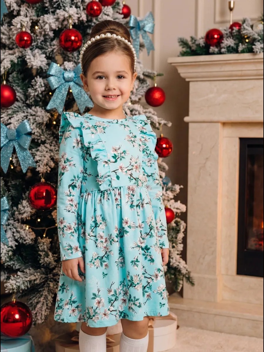 Платье выполнено в популярном винтажном стиле тренд 2026 года — сочетание рюшей, приталенного силуэта и цветочного принта напоминает модные платья в ретро стиле и актуальные тенденции советской детской моды. Приталенный силуэт, воланы на плечах и нежный цветочный принт — детали, характерные для винтажных и ретро платьев. Такое советское платье вновь в тренде и станет отличным выбором для маленьких модниц, любящих стильные образы.