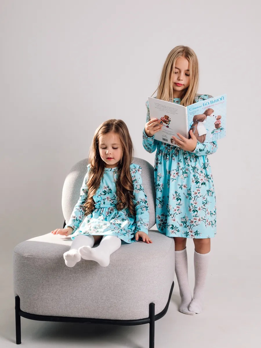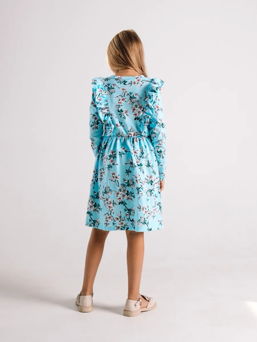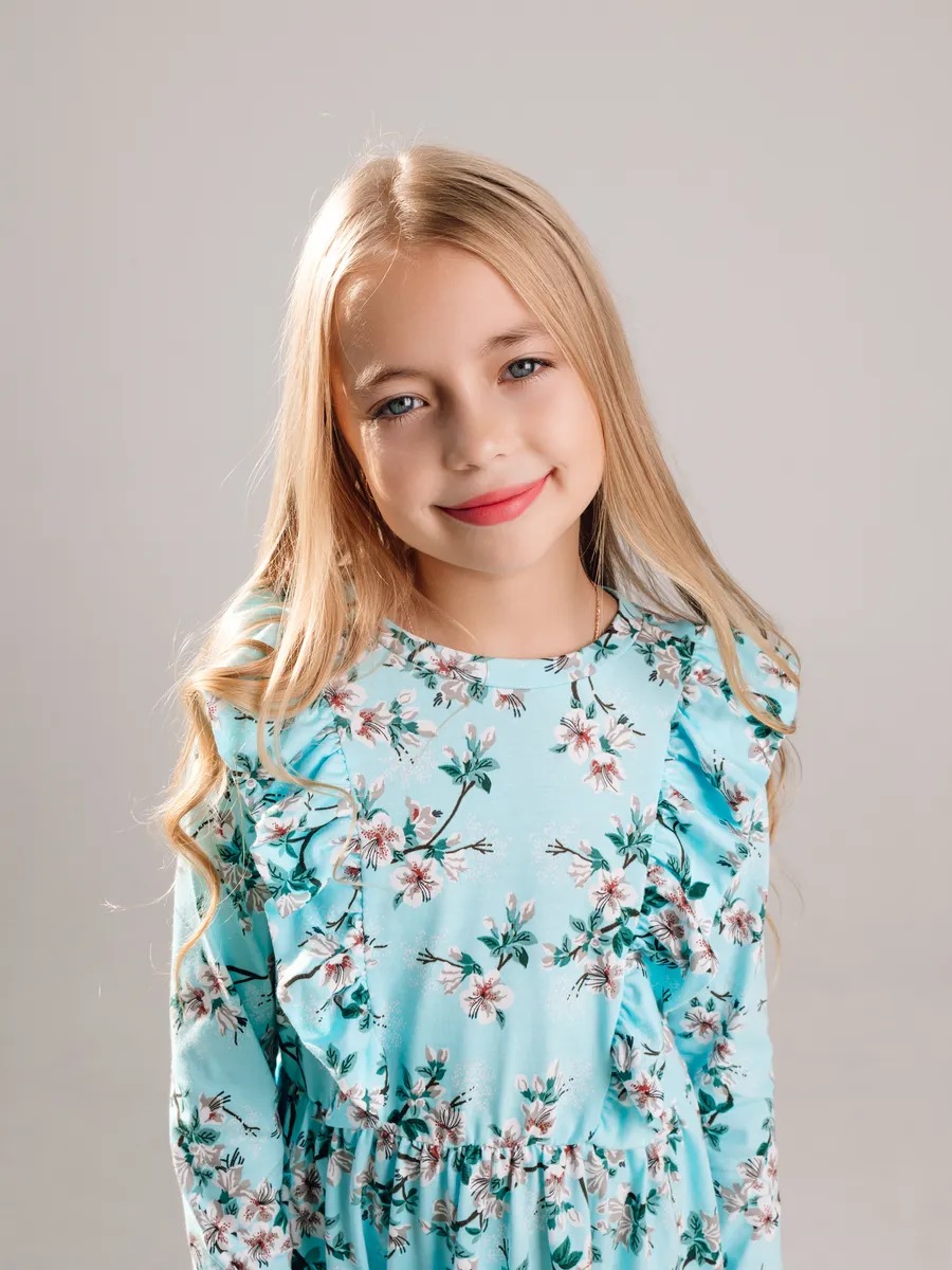 Платье выполнено в популярном винтажном стиле тренд 2026 года — сочетание рюшей, приталенного силуэта и цветочного принта напоминает модные платья в ретро стиле и актуальные тенденции советской детской моды. Приталенный силуэт, воланы на плечах и нежный цветочный принт — детали, характерные для винтажных и ретро платьев. Такое советское платье вновь в тренде и станет отличным выбором для маленьких модниц, любящих стильные образы.