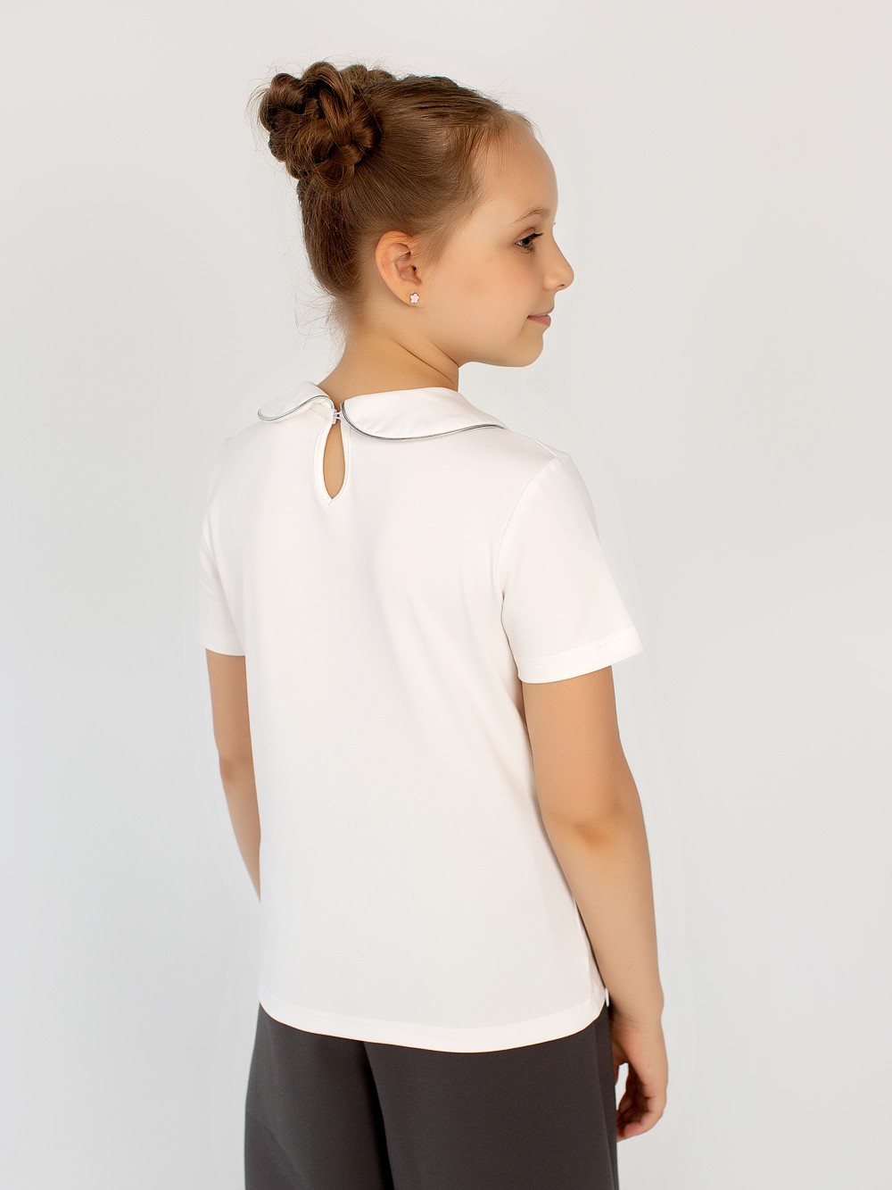 Приталенный силуэт подчёркивает фигуру и выглядит опрятно в составе школьной формы. Короткий рукав обеспечивает комфорт в помещении и в тёплое время года. Модель легко комбинируется с классическими юбками, сарафанами, брюками и жилетами, а также может стать основой праздничного наряда.
