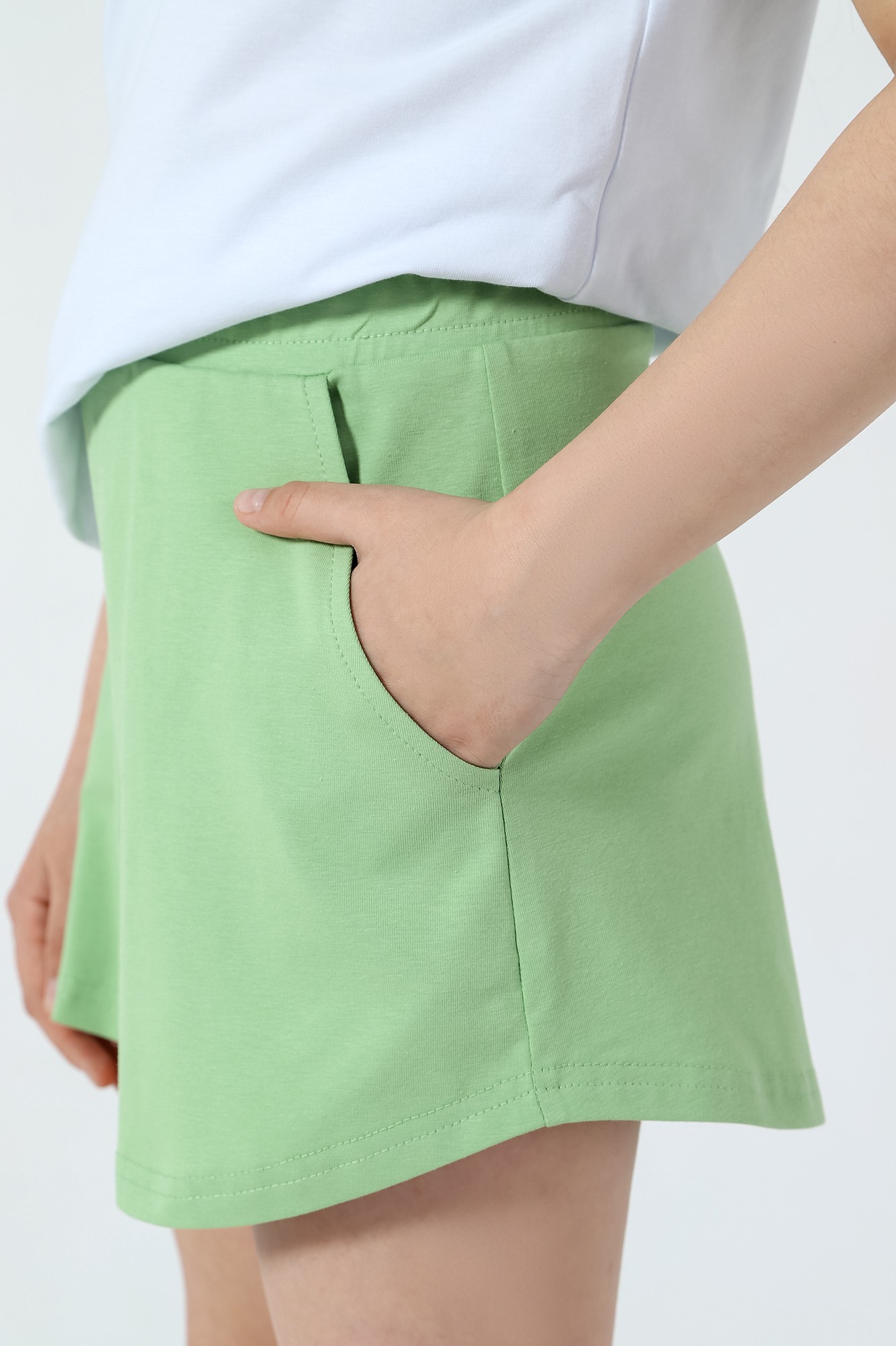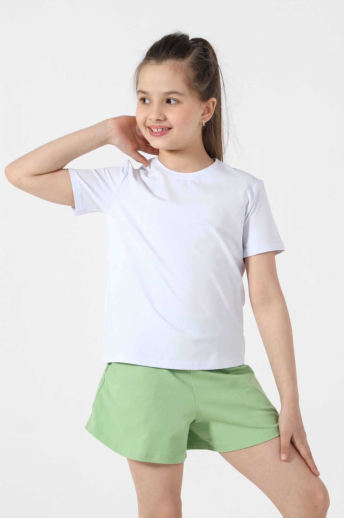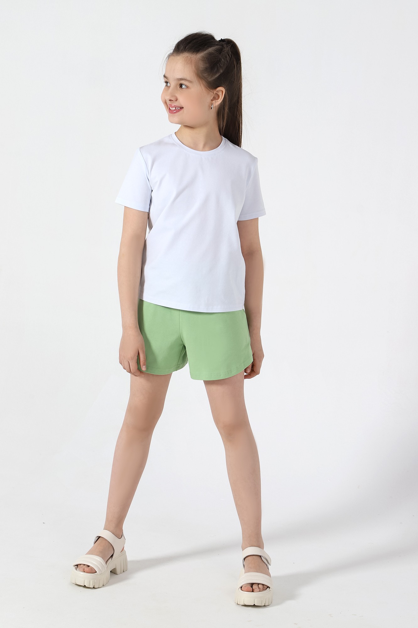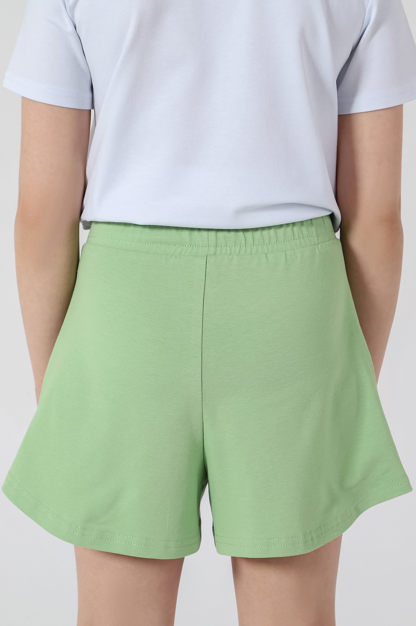 Шорты для девочки, из трикотажного полотна кулирного переплетения из хлопка с лайкрой. Модель слегка расширенная книзу, с боковыми карманами, на притачном поясе с отстроченной эластичной тесьмой, с фигурной линией низа.