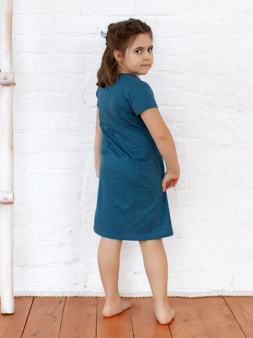 Ночная сорочка имеет классический силуэт-трапеция и выполнена из мягкой хлопковой дышащей ткани, за счёт чего в ней будет максимально удобно и комфортно. В этой яркой и оригинальной ночной сорочке ваша малышка будет чувствовать себя уютно как во время сна, так и во время бодрствования. Горловина изделия обрабатывается под окантовку. Такая сорочка отлично подойдёт в качестве домашнего платья или домашней туники для девочки.