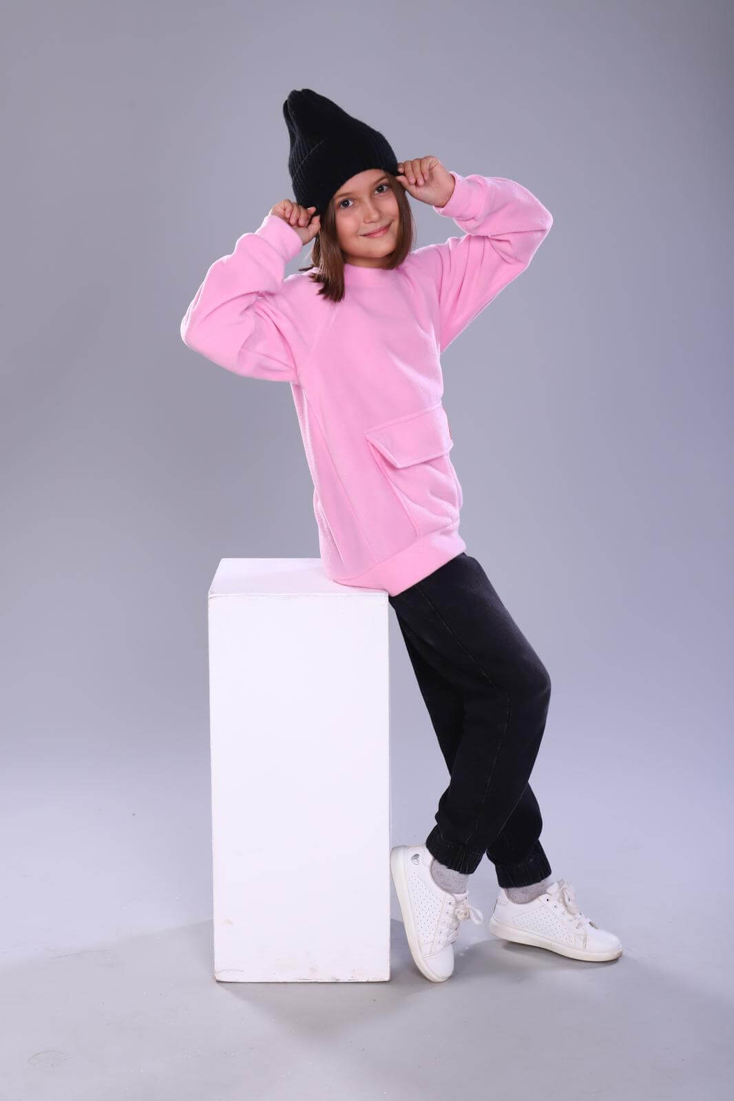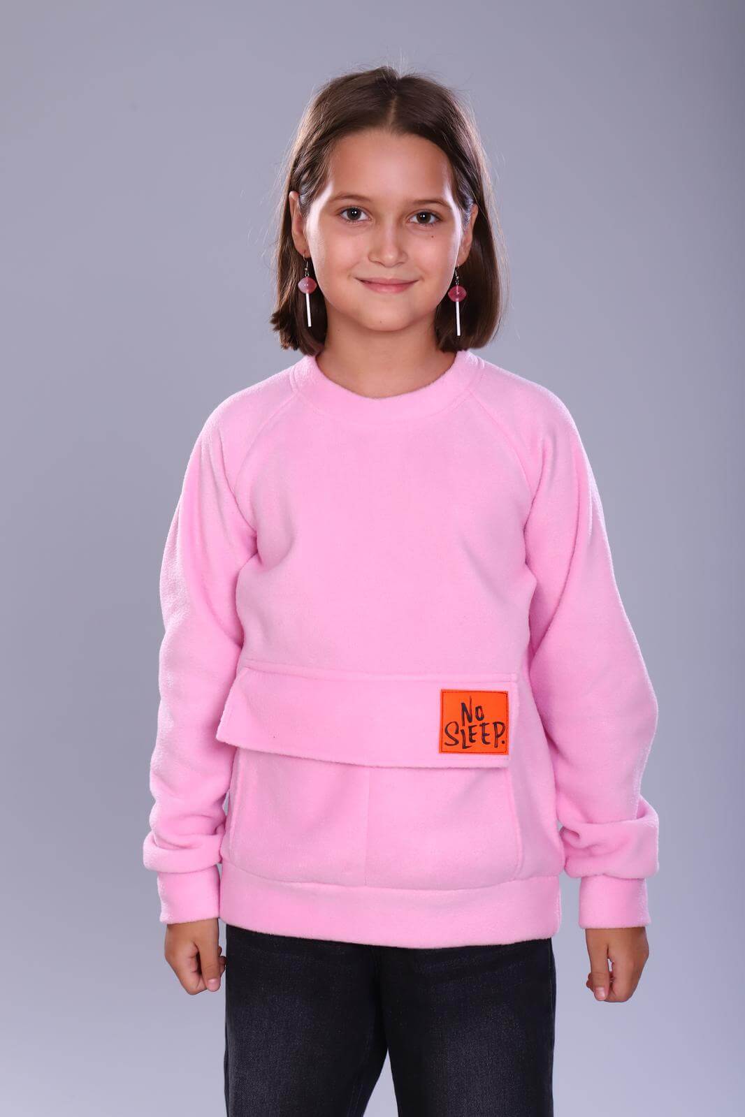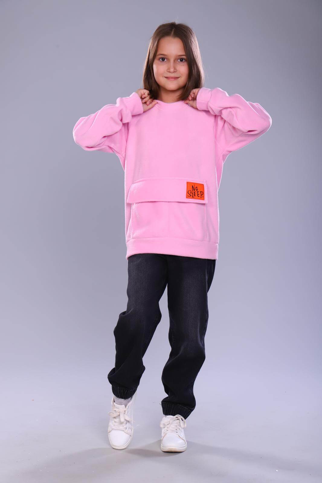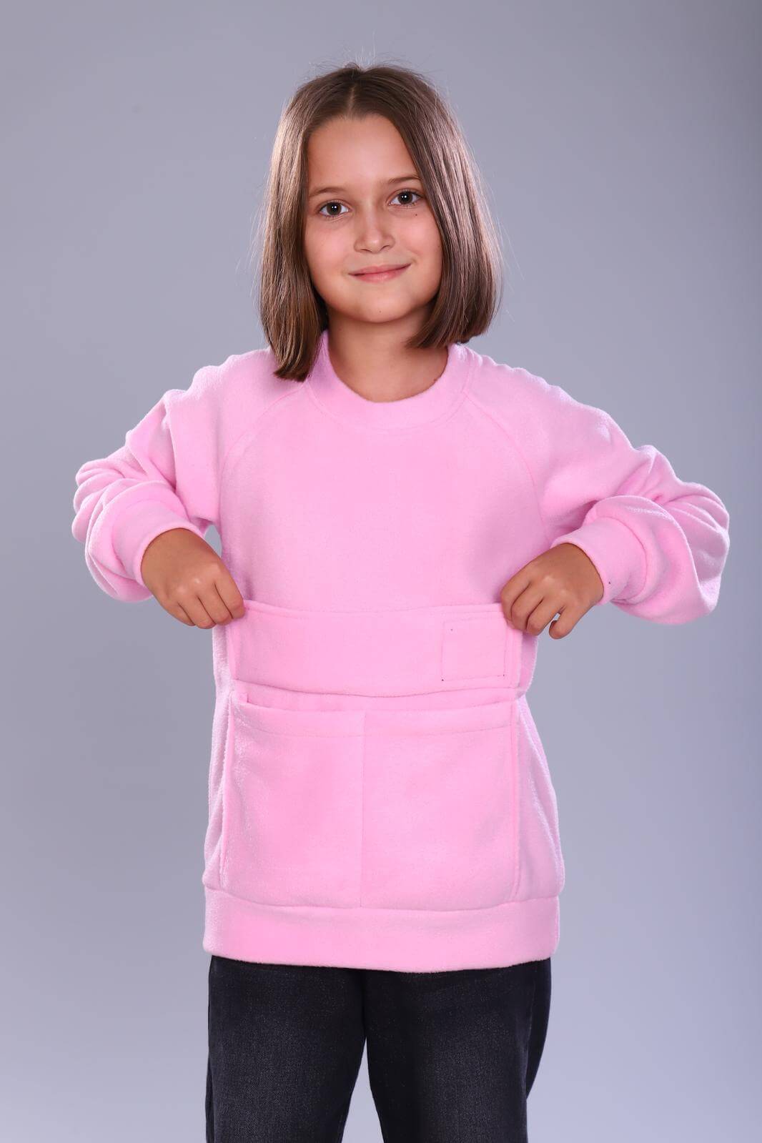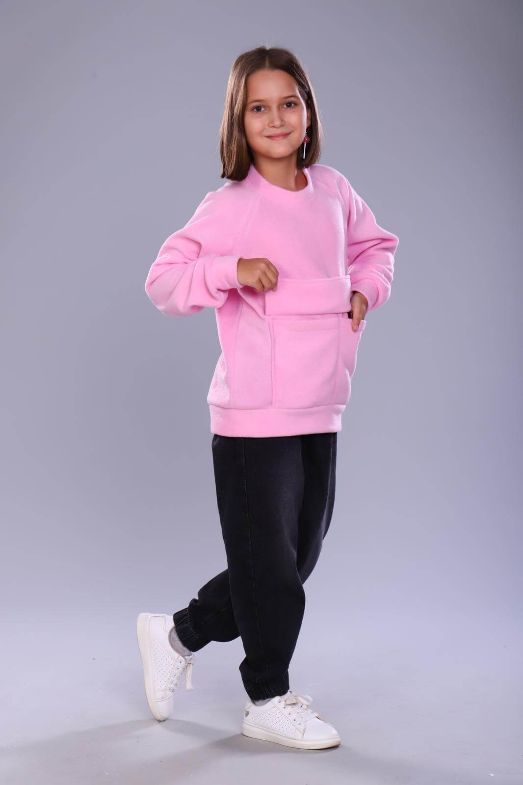 Толстовка детская Пинки выполнена из мягкого материала флис. Рукава и низ изделия оформлены резинкой, что обеспечивает удобную посадку. На передней части толстовки расположен большой накладной карман.