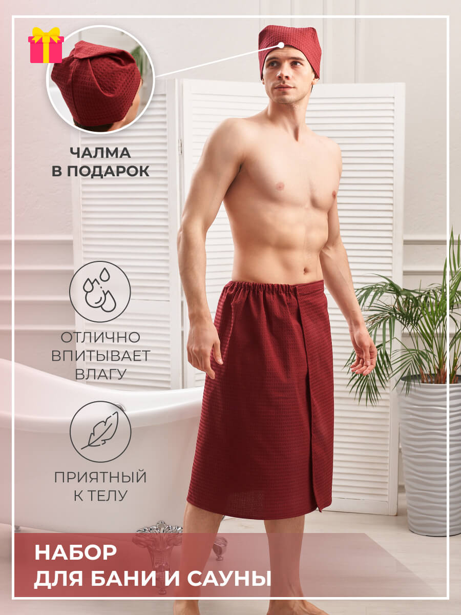 Комплект банный мужской изготовлен из вафельной ткани 100% хлопок , которая быстро впитывает влагу и быстро сохнет. Килт банный мужской практичен и легок в использовании , прекрасно выдерживает высокие температуры сауны и бани.