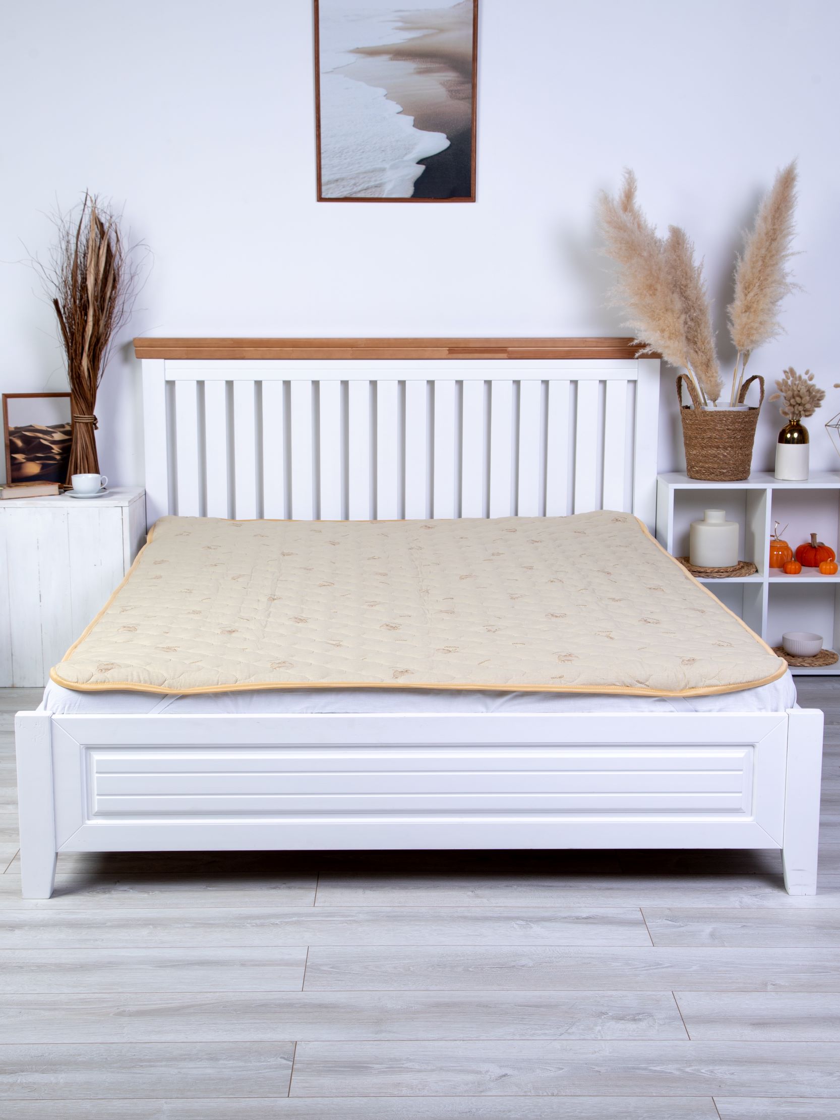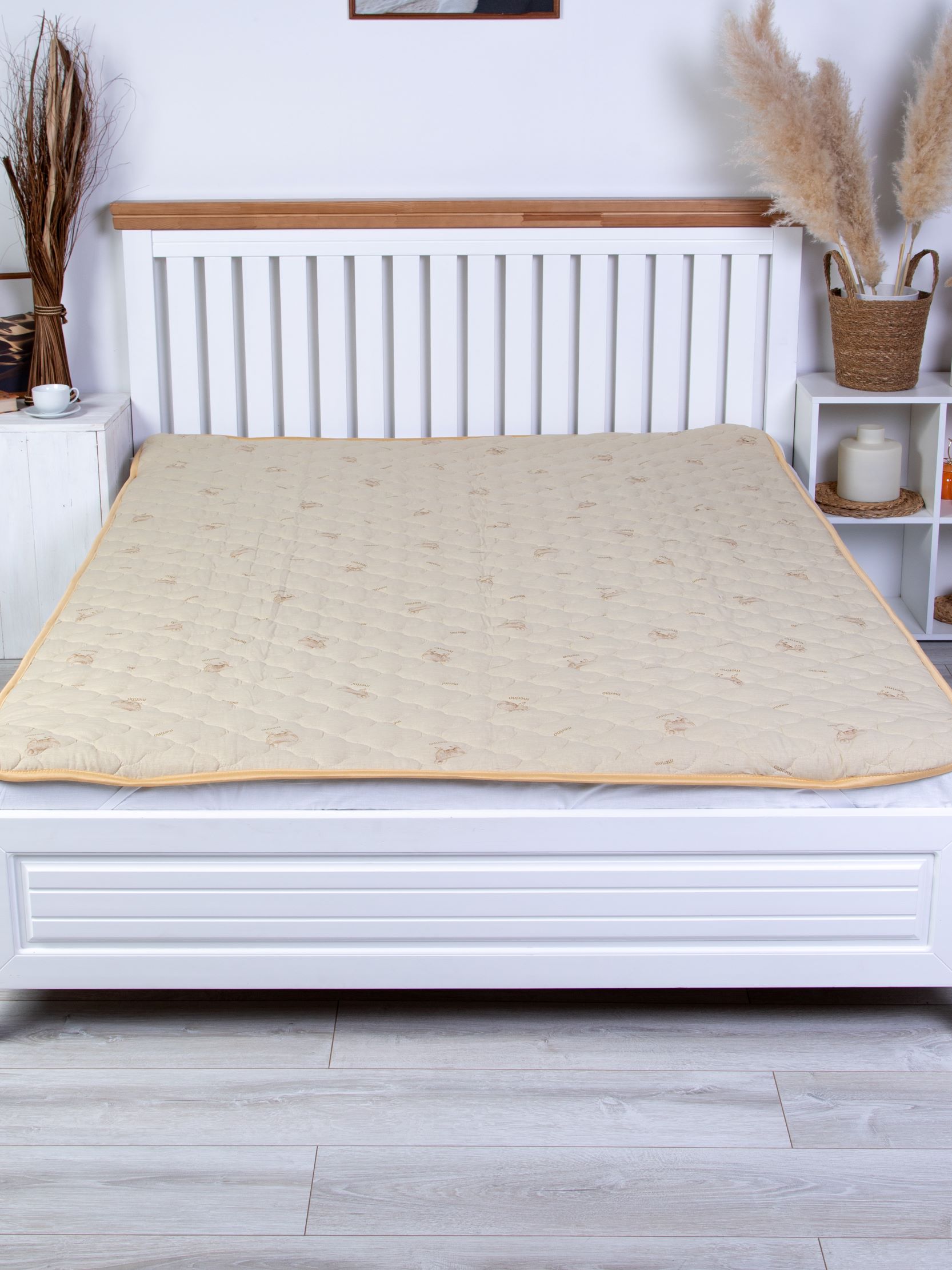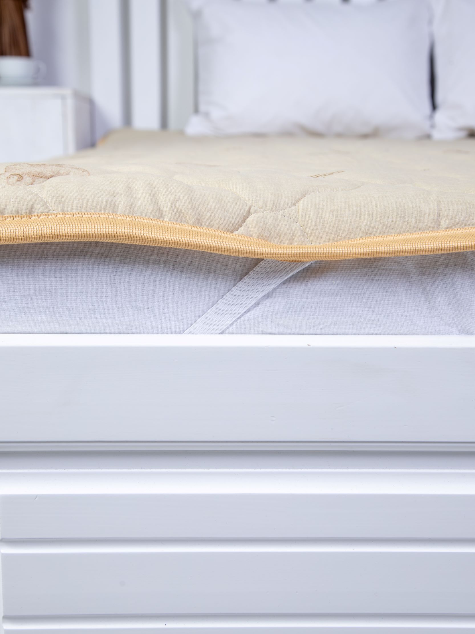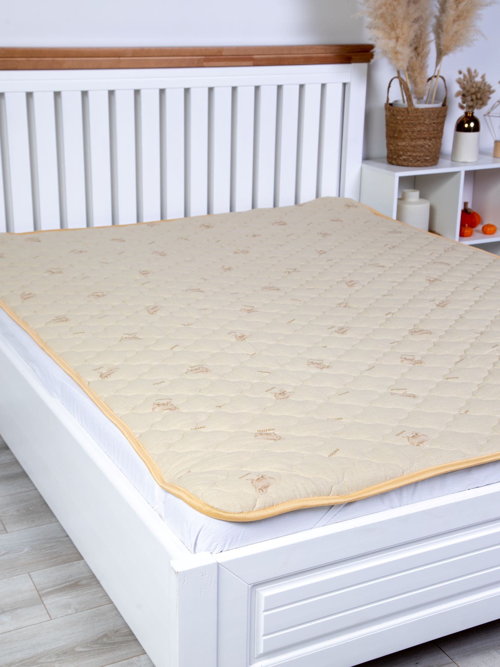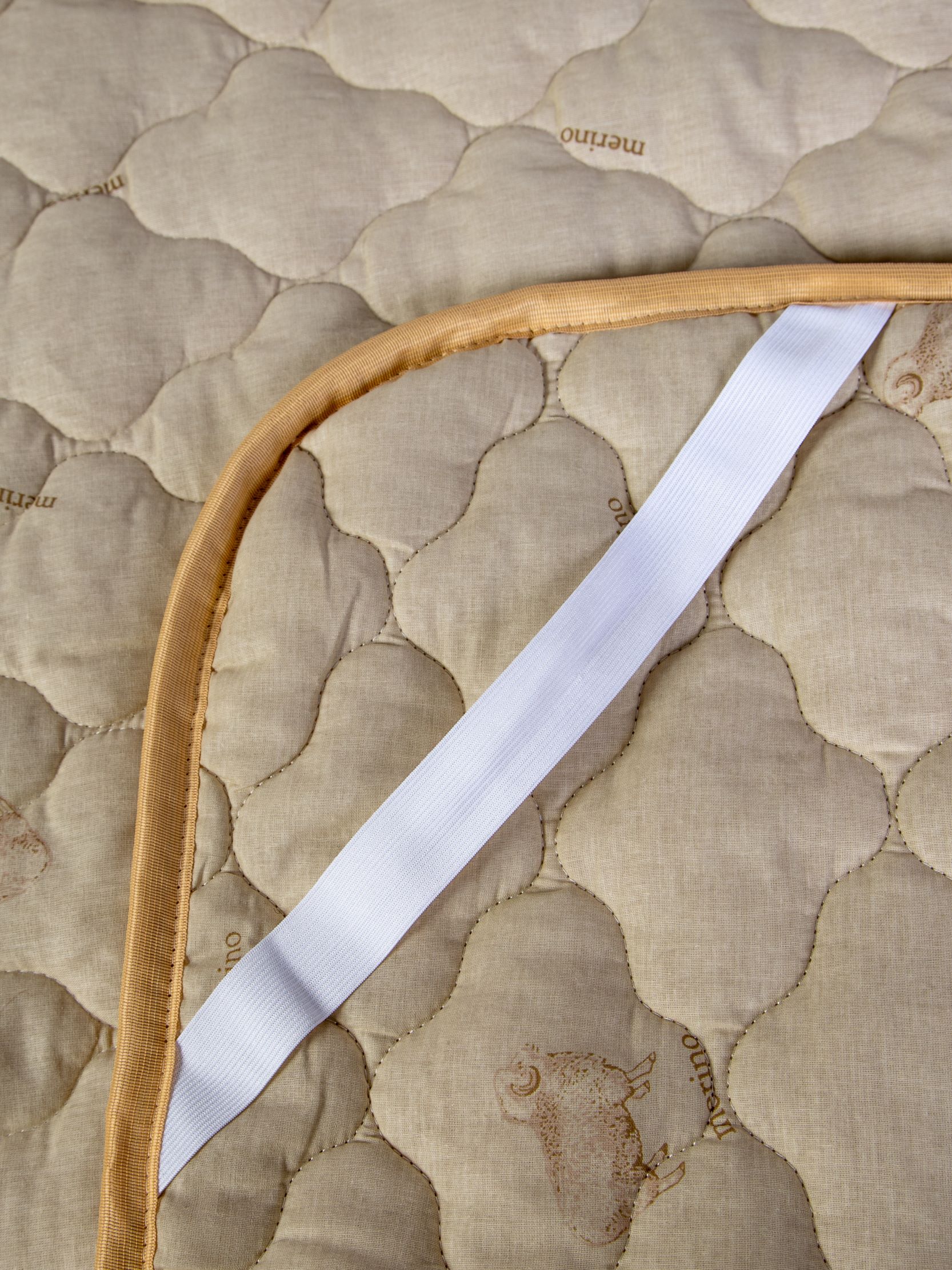 Наматрасник с наполнением из овечьей шерсти плотностью 300 гр/кв.м., окантован широкой тесьмой, по углам - резинка для фиксации на матрасе. Многоигольная стежка исключает смещение наполнителя внутри изделия, чехол из натурального хлопка, прекрасно пропускает воздух и впитывает влагу. Упаковка - тубус ПВХ с ручкой.