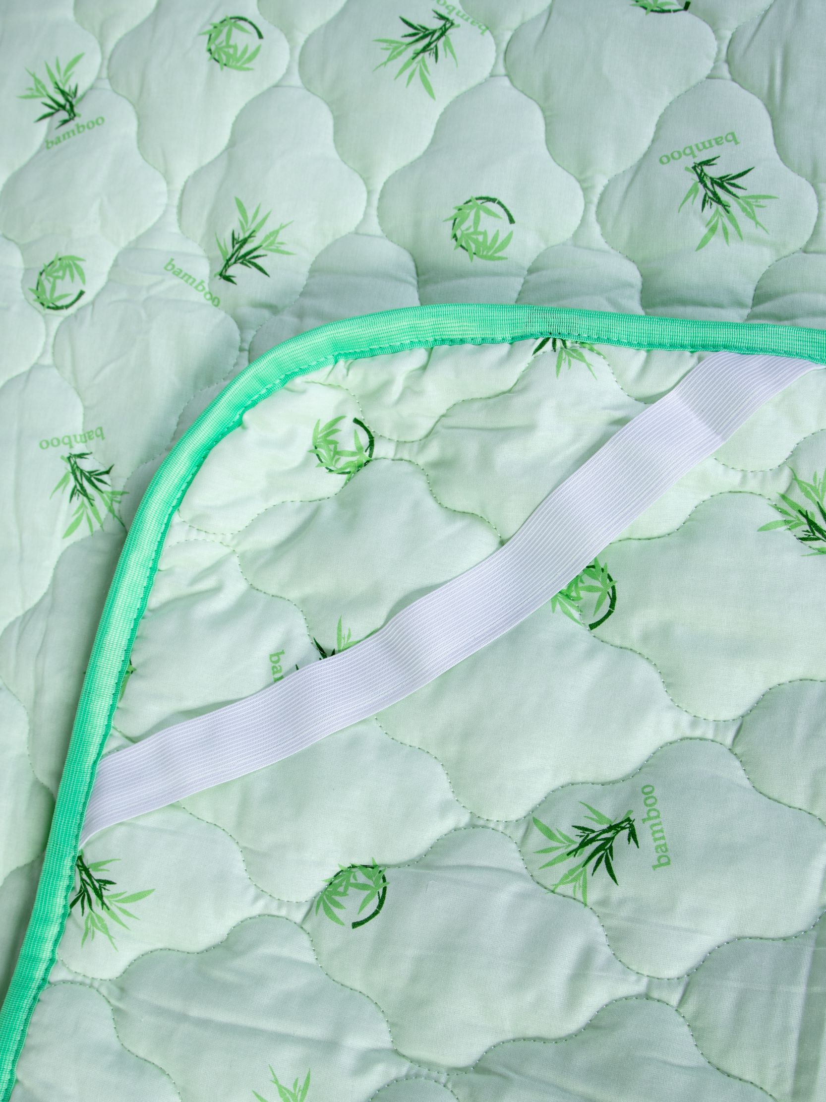 Наматрасник с наполнением из бамбукового волокна плотностью 300 гр/кв.м., окантован широкой тесьмой, по углам - резинка для фиксации на матрасе. Многоигольная стежка исключает смещение наполнителя внутри изделия, чехол из натурального хлопка, прекрасно пропускает воздух и впитывает влагу. Упаковка - тубус ПВХ с ручкой.