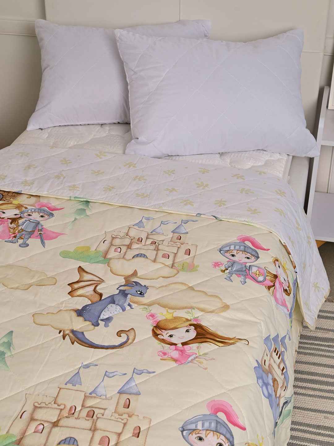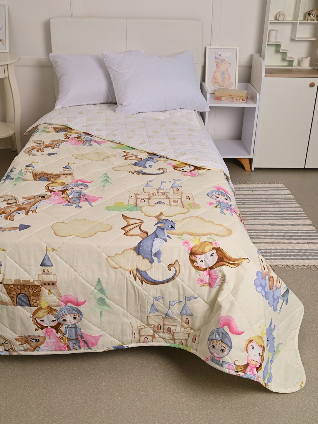 Представляем Вашему вниманию детское покрывало из поплина - материала давно полюбившегося людям за свои потребительские качества. Материал абсолютно натурален и изготавливается из 100% хлопка. Модель совершенно безопасна для здоровья и не вызывает аллергических реакций. Покрывало содержит наполнитель - синтепон, плотностью 80 гр./кв.м, обладающий отличной воздухопроницаемостью и теплоизоляционными свойствами, отлично держит форму и не "сбивается" даже спустя продолжительный период эксплуатации. Покрывало приятное на ощупь и обладает небольшой массой, что немаловажно для комфортного отдыха. Благодаря оригинальному дизайну отлично впишется в любой интерьер.