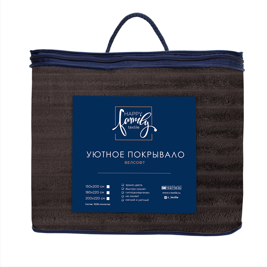 Покрывало Велсофт HAPPY FAMIIY- удобная и практичная вещь. Мягкое, приятное на ощупь, невесомое, его можно использовать в качестве пледа. Оно очень хорошо стирается и мгновенно высыхает, не теряя при этом ни формы, ни яркости расцветки. Достоинства: можно стирать в стиральной машине, не линяет.