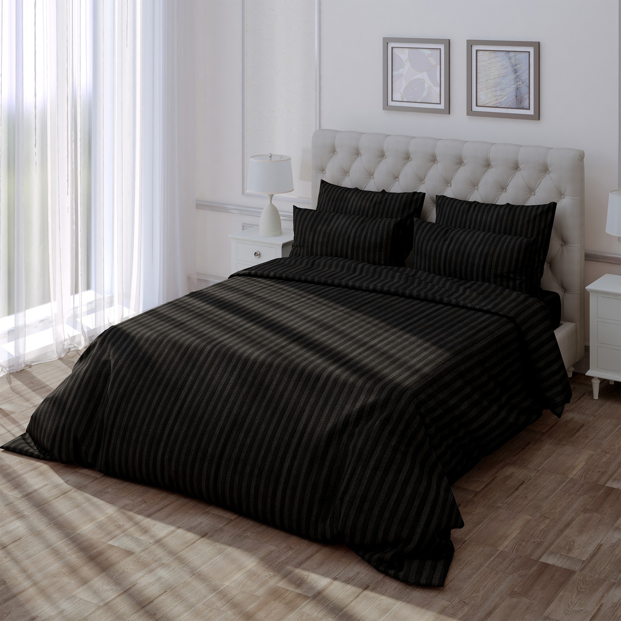 По ощущениям страйп самый теплый из всех видов ткани, а всё из-за сложного переплетения: ткань удерживает воздух и сохраняет тепло, выделяемое телом во время сна. В России только мы производим страйп и наносим на него дополнительный рисунок.