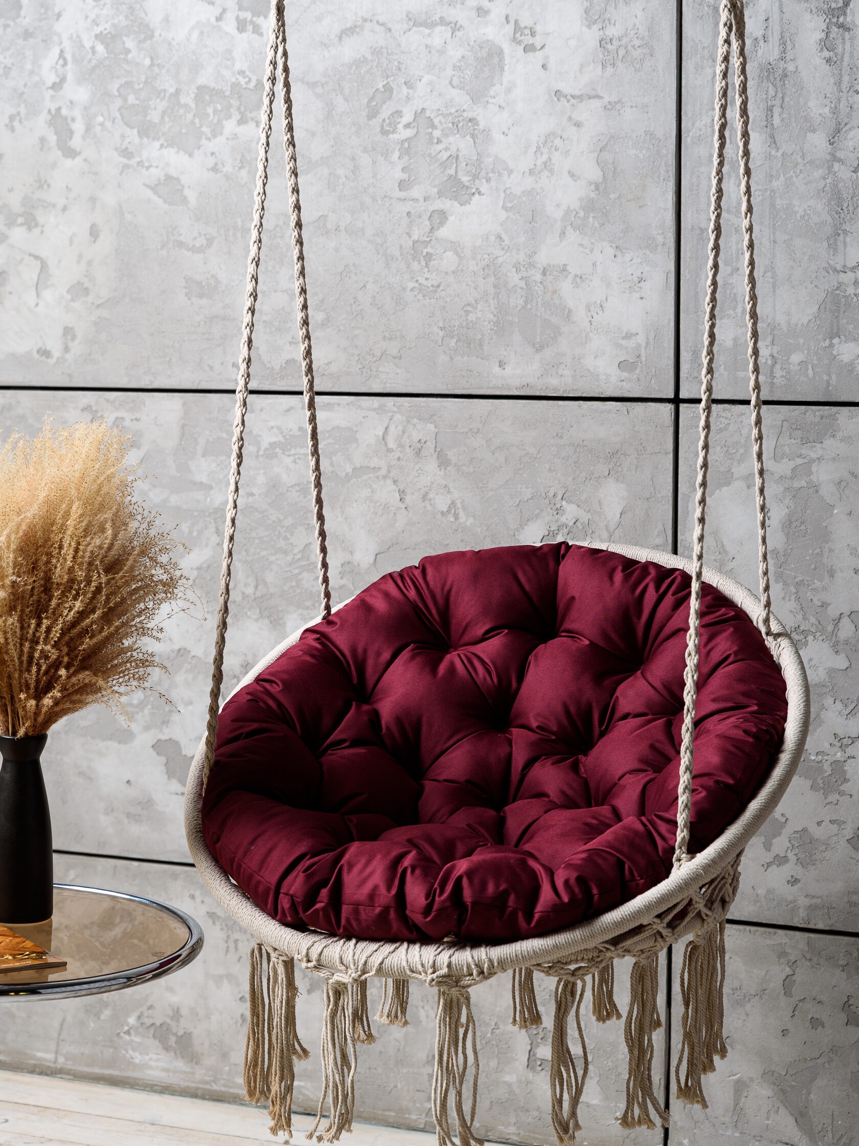 Круглая подушка сидушка безупречно дополнит образ для садовой мебели, привнесет уют и одновременно сделает кресла-качалки более комфортными. Подушка для сидения уличная в меру объемная, а наполнитель достаточно упругий. Вы можете использовать подушку не только на качели подвесные для улицы или для сада, но и для дома, положить на веранде в кресло качалку, в беседке на скамью или использовать ее на лужайке для гамака, около бассейна и рядом с шезлонгом. По-настоящему мягкая сидушка станет незаменимым участником комфортной жизни. Напольная подушка для качелей будет необходимой для ребенка в детской, чтобы можно было спокойно разместиться на пол или на детское подвесное кресло. Также большая подстилка для отдыха непременно пригодится в домашнем кинозале, в кресло гамак или в кресло кокон. Подушка для садовых качелей сделана из плотной износостойкой ткани, которая хорошо удерживает наполнитель, сохраняет форму подушки и обеспечивает долгий срок службы изделия.