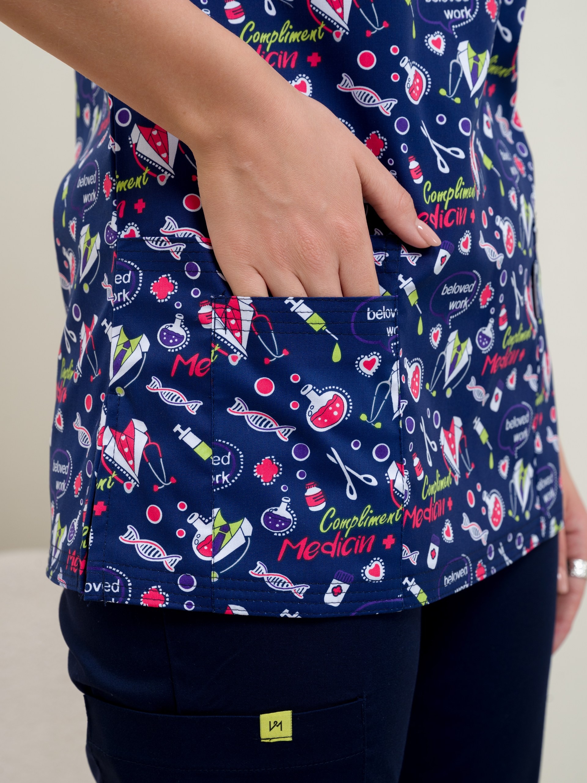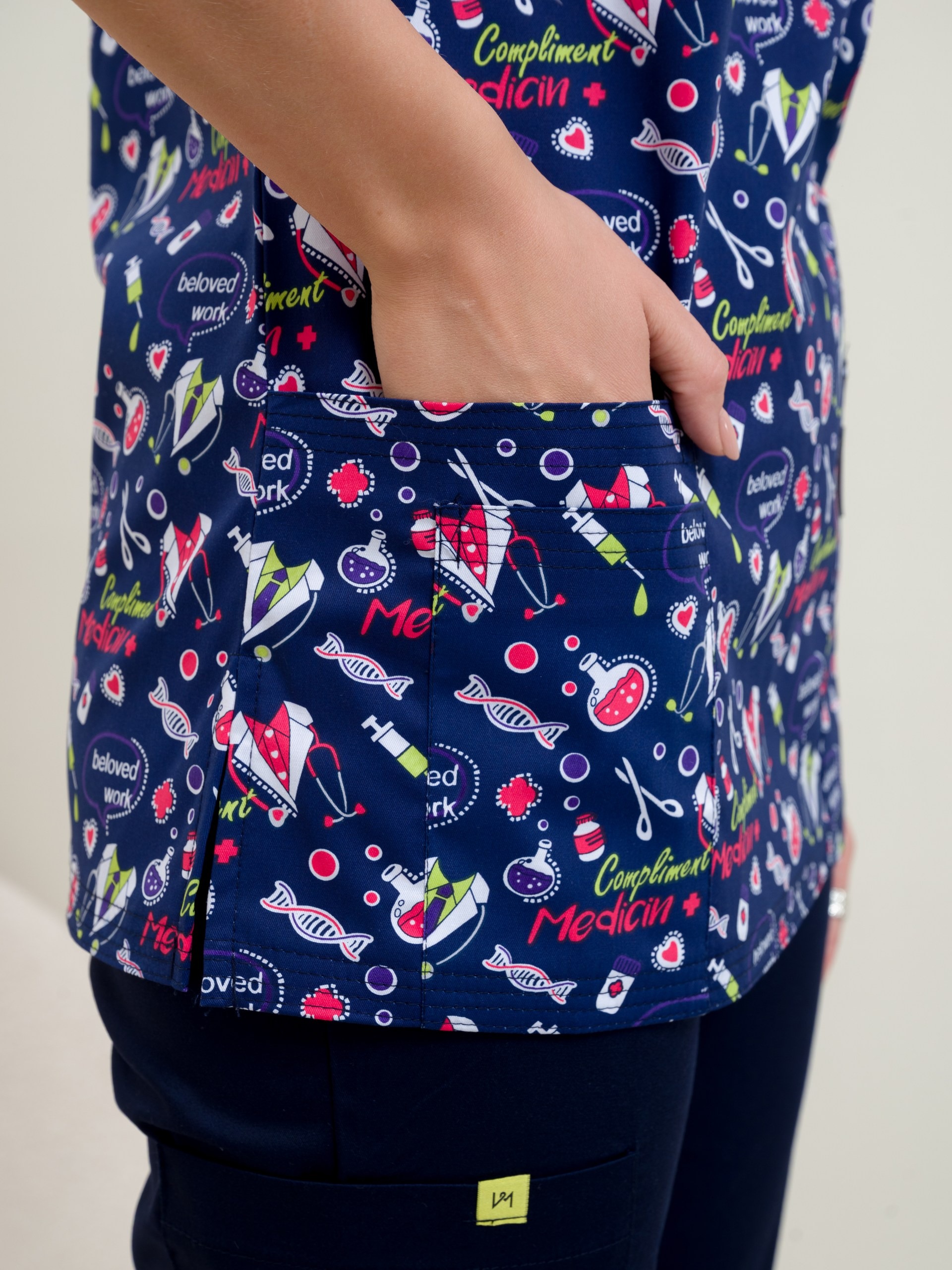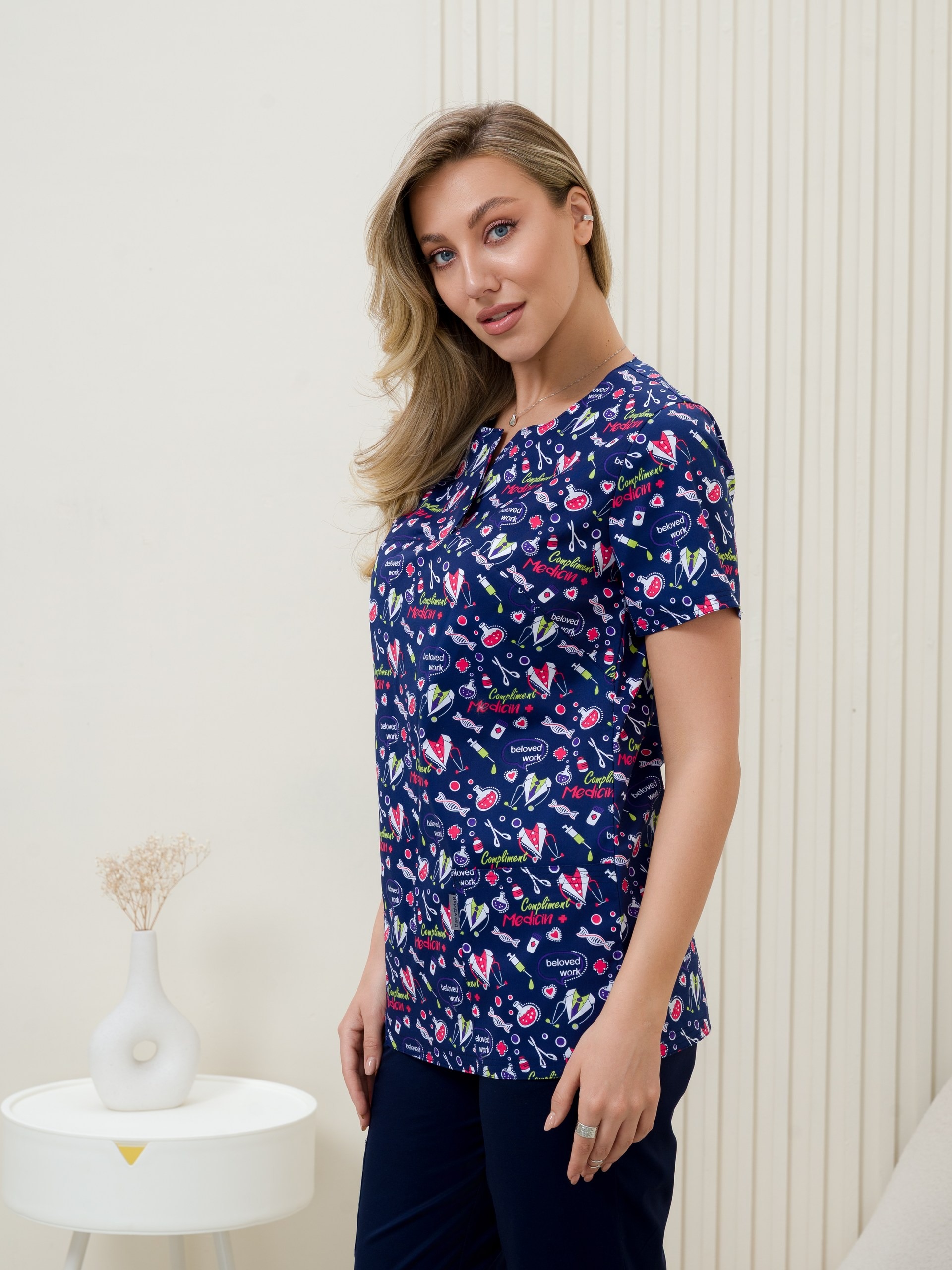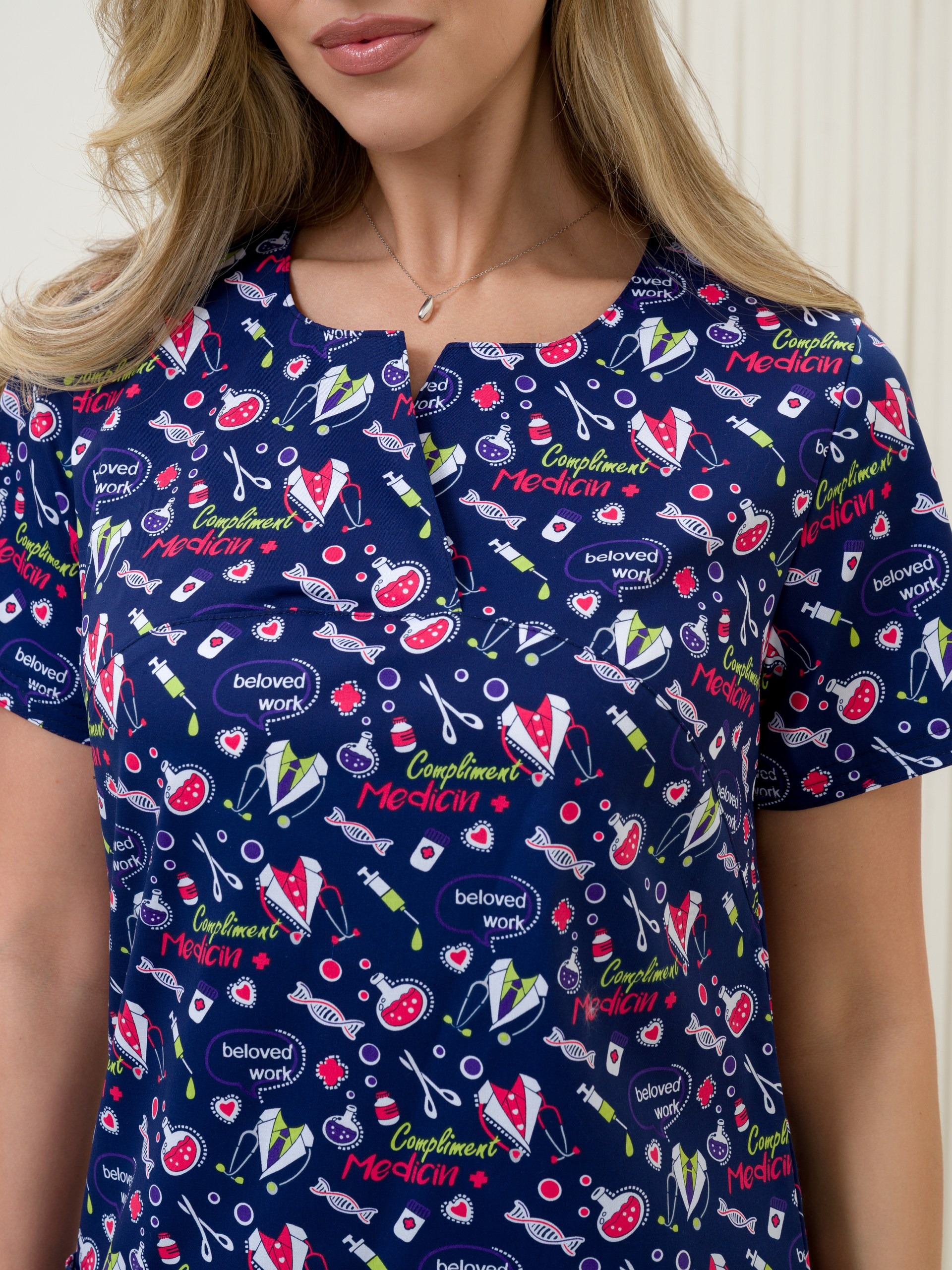 Современная униформа для медиков может обратить на себя внимание не только пациентов, но и вызвать у вас желание носить ее за пределами работы. Блуза медицинская женская с ярким рисунком будет поддерживать ваш настрой приподнятым в течение всего рабочего дня. Удобный крой рубашки с коротким рукавом для женщин не будет стеснять ваших движений, и даже в экстренных ситуациях вы продолжите выглядеть прекрасно. Медицинская блузка составит отличный комплект с брюками нашего бренда, есть простые прямые брюки, а также джоггеры. Составляйте разные образы и излучайте импульсы уверенности в завтрашнем дне. Медицинская рубашка с рисунком подойдет педиатрам, ветеринарным врачам, стоматологам, сотрудникам косметических салонов, массажистам. Спецодежда сшита из ткани Элит-145/Стрейч-Принт. Размерный ряд с 40 по 64.